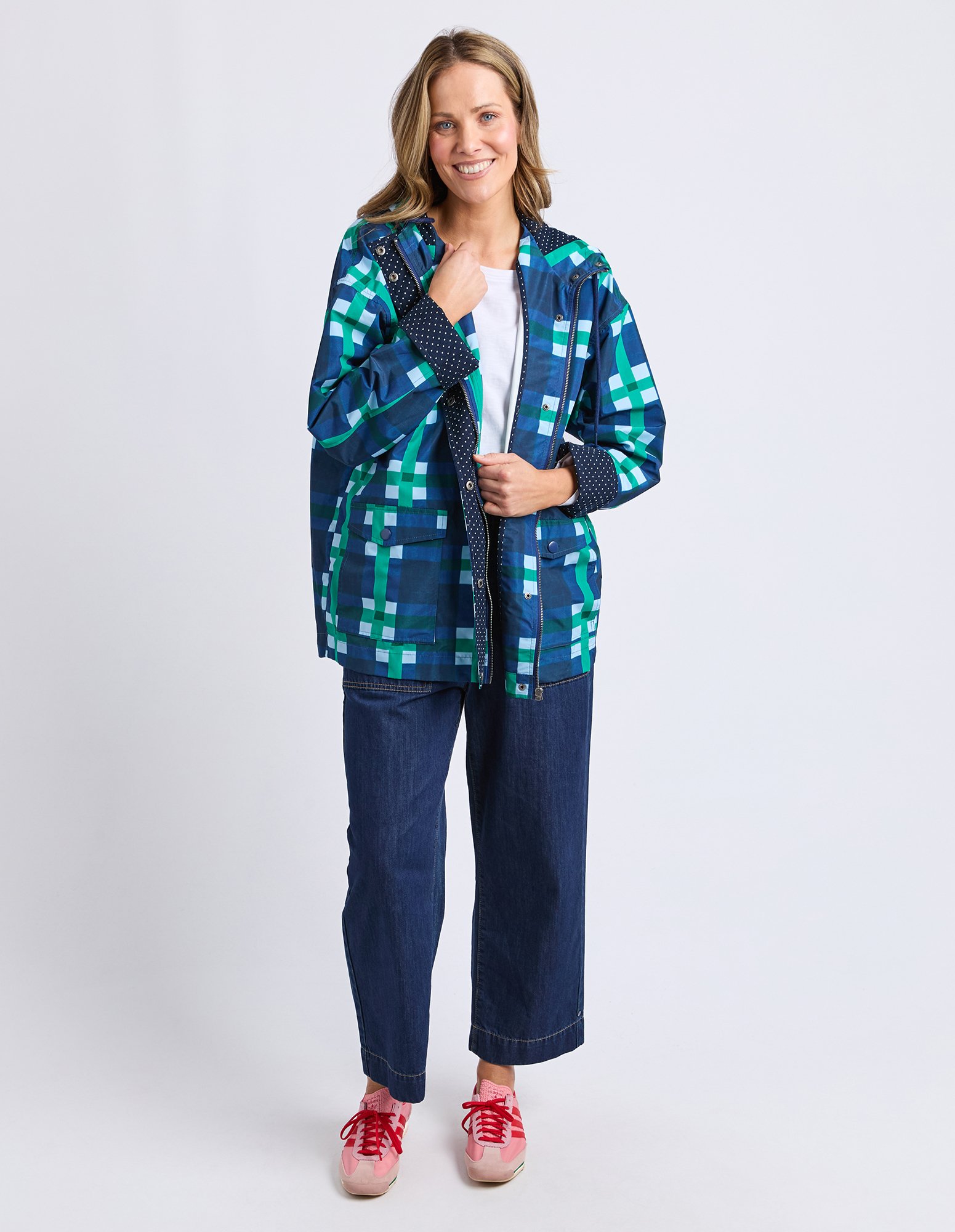 The Elm Bari Raincoat blends functional outerwear with statement style. Featuring exclusive Bari print artwork with a playful polka dot facing, this relaxed-fit raincoat is crafted from coated PVC and finished with practical front pockets—perfect for staying dry in style.