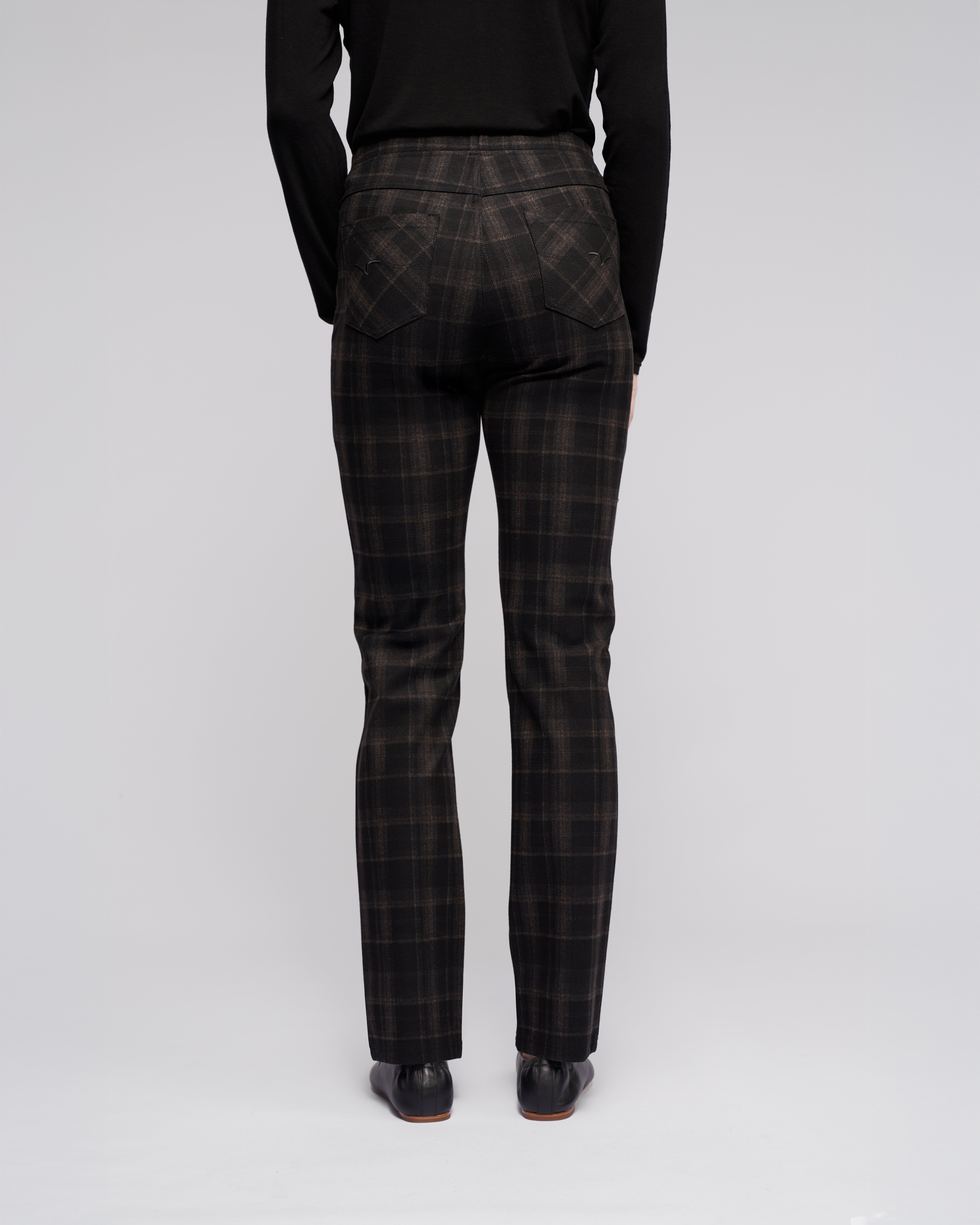 Full-length slim pant in stretch ponti fabric. This easy pull-on style features an elasticated waistband for a comfortable fit, finished with refined detailing including a faux fly, faux front pockets, and back patch pockets.