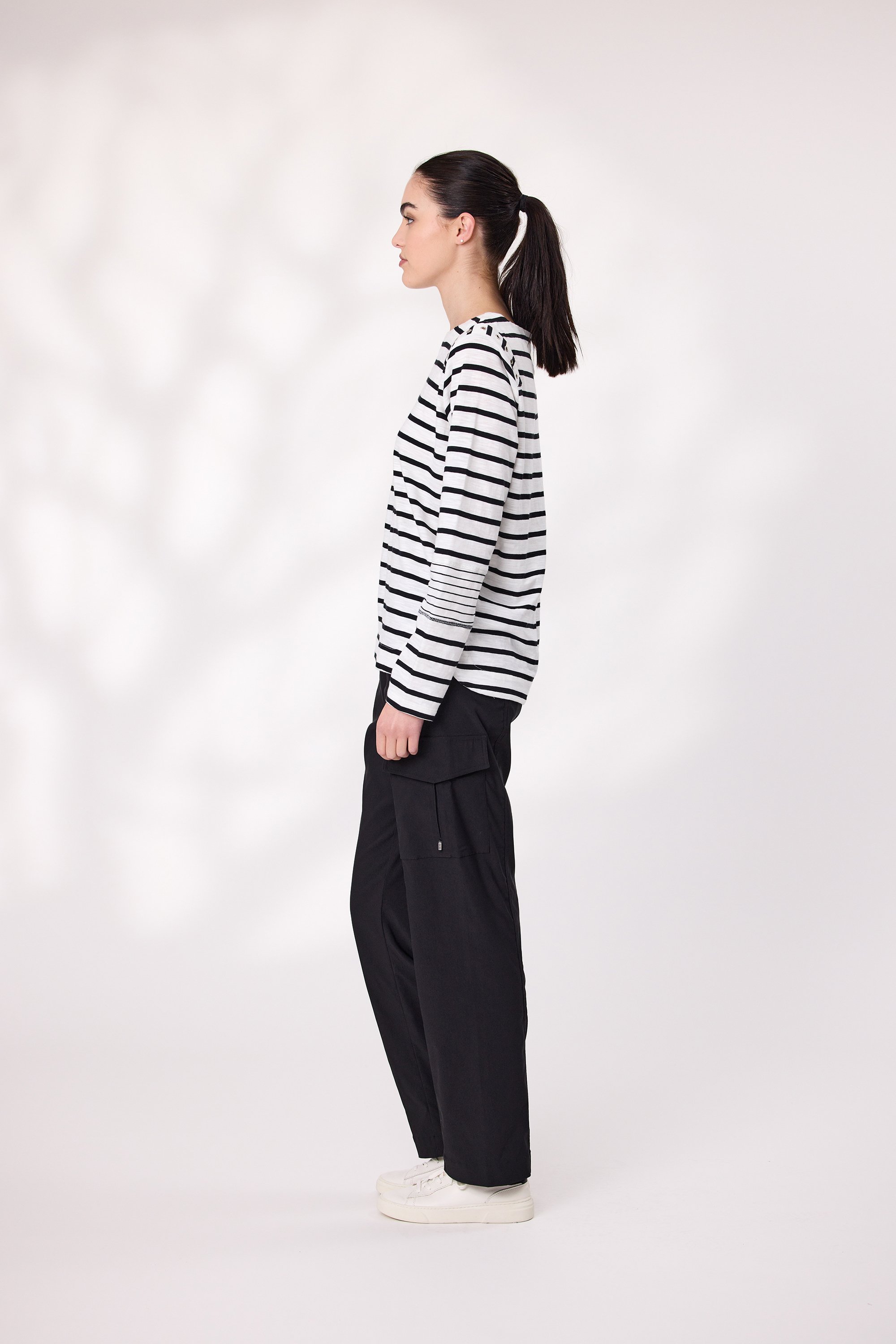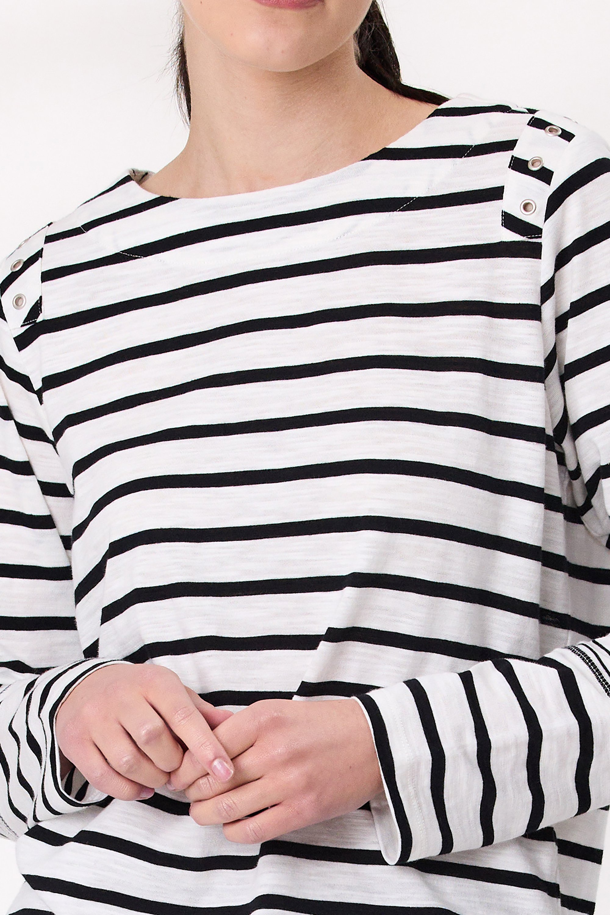 A fresh twist on a classic stripe—this cotton long sleeve top features bold black and white horizontal stripes and delicate eyelet detailing at the shoulders for a subtle touch of texture. Made from soft, breathable cotton, it is perfect for everyday wear with a little extra flair.