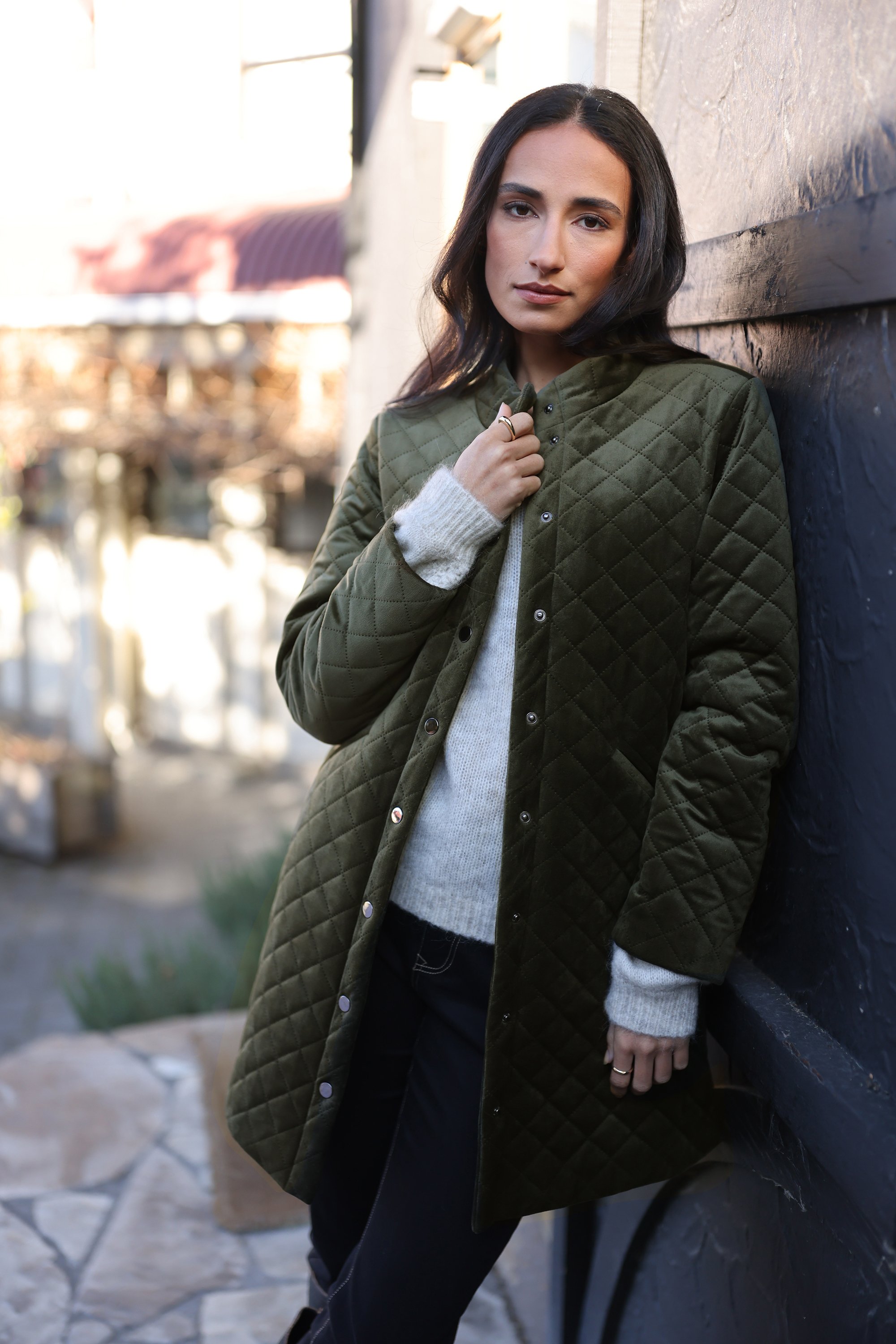 Step into effortless elegance with this long quilted velvet coat. It features a diamond-quilted texture that adds depth and sophistication. The full-length silhouette offers extra coverage, while the soft lining ensures comfort in cooler weather. A button-down front provides a classic finish and hip-level pockets.