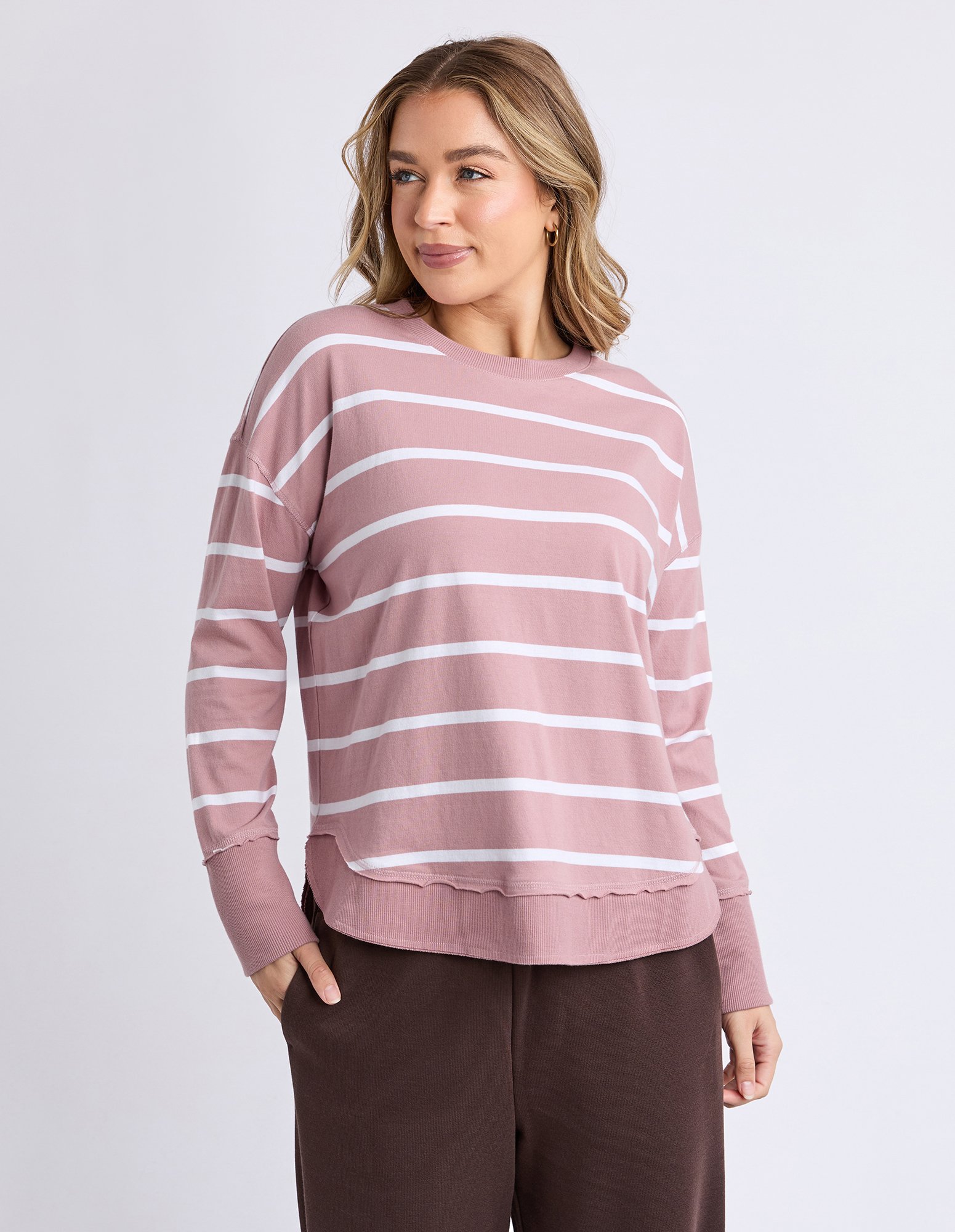A new crew to the Foxwood range the Farrah Long Sleeve in 100% Fresh Pima Cotton features a classic crew neckline and raw edge detail. This relaxed fit jumper is an easy everyday wear.