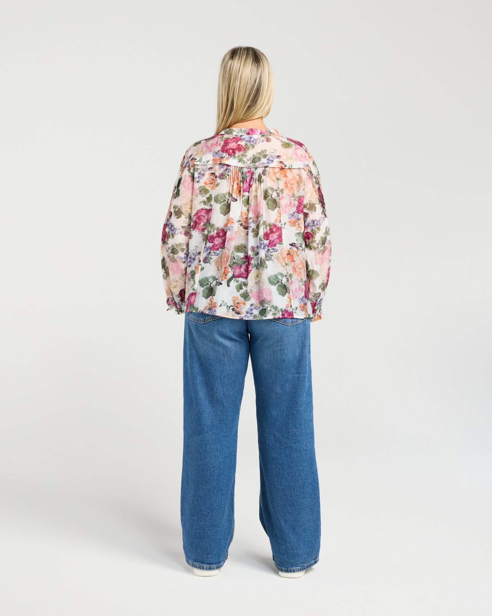 This button-down shirt features pleated details on the bodice and sleeves, complemented by delicate trim around the arm cuffs and neckline. Crafted in a soft, beautiful floral fabric, it offers a feminine and elegant take on a classic silhouette.
