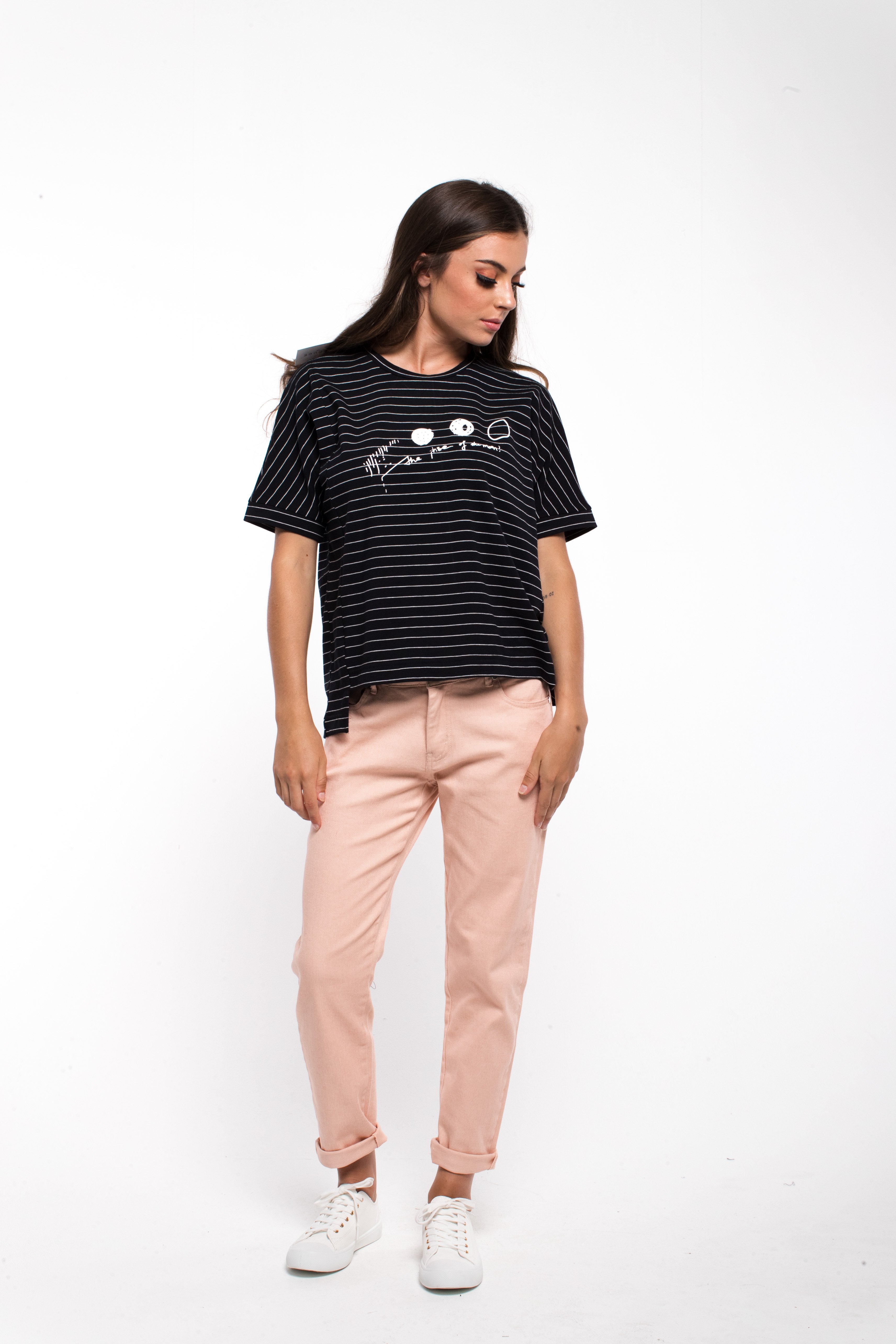 STRIPED S/S TEE WITH PRINT. UNEVEN HEM DETAIL.