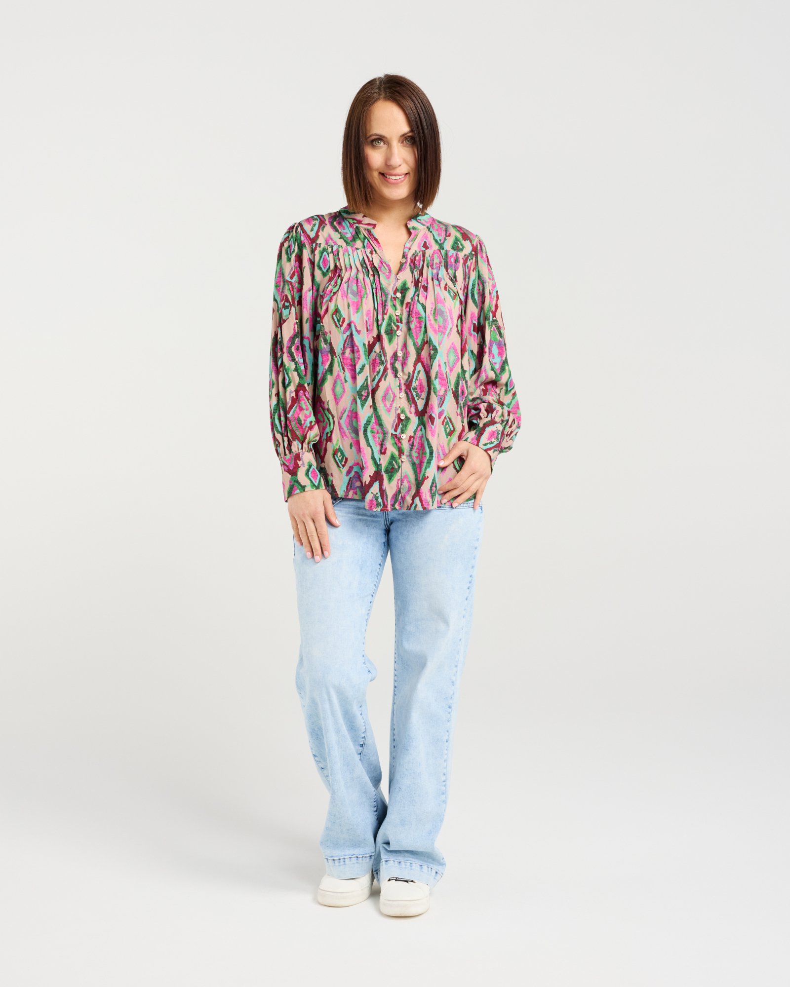 This button-down blouse features subtle pleating above the bust and classic shirt-style sleeve cuffs for a refined finish. Crafted in a vibrant, colorful print, it adds a cheerful and stylish touch to any outfit.