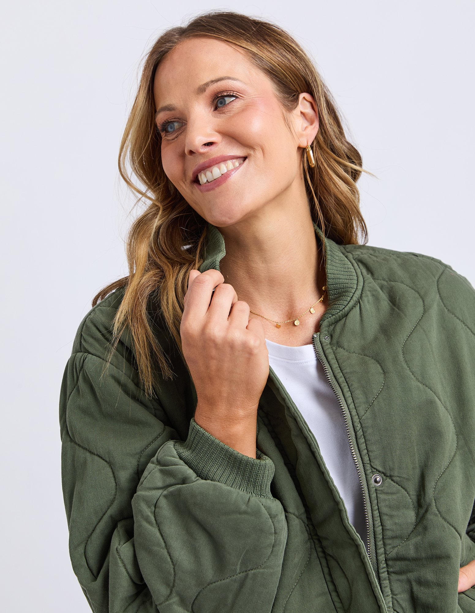 The Elm Jean Bomber Jacket adds a cool, casual layer to everyday outfits. Featuring a ribbed collar, quilted design and pigment-dyed finish, this relaxed-fit jacket is crafted from 100% cotton. Throw it over tees, knits or dresses for effortless day-to-day layering.