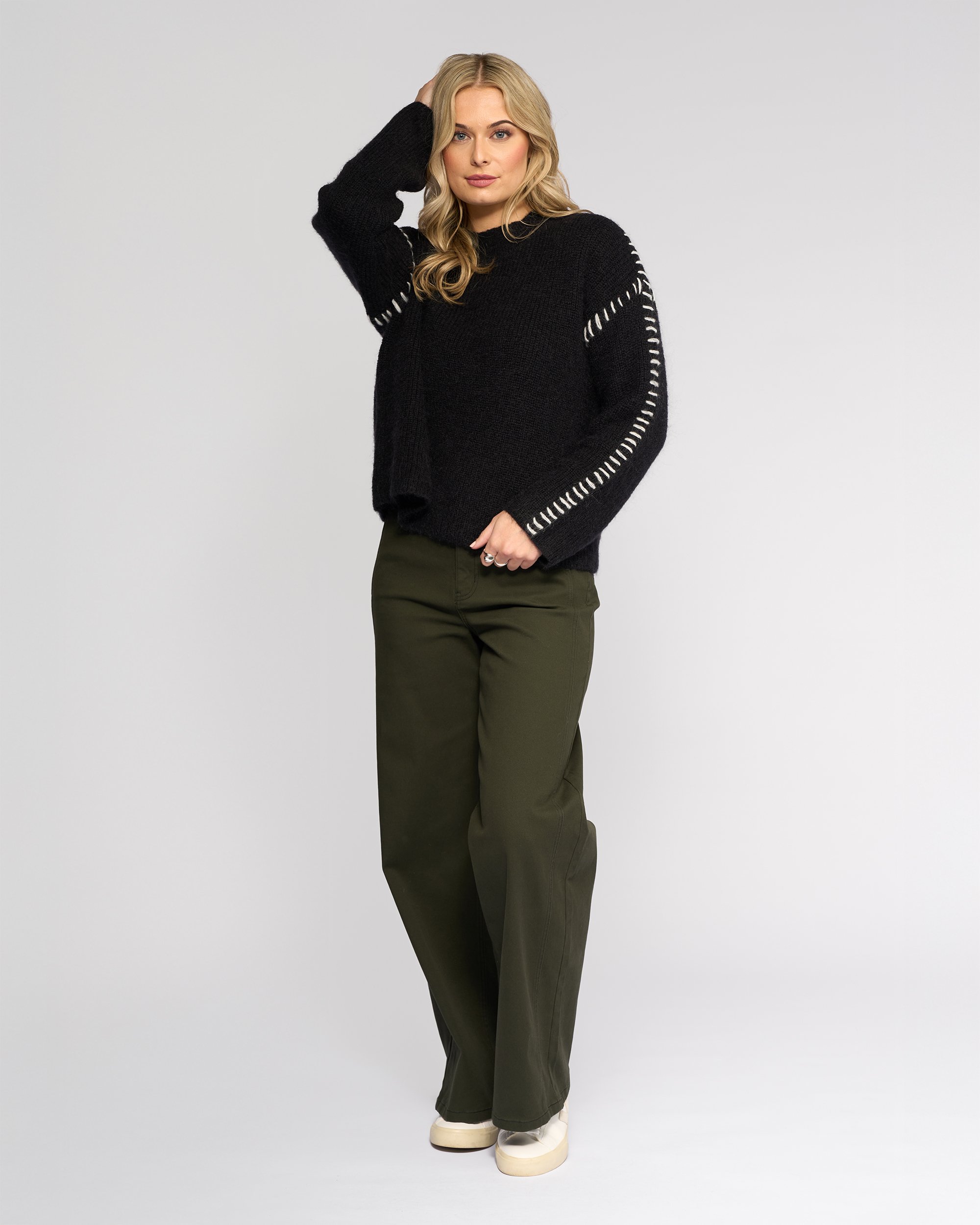 • Oversized stitch detailing along shoulders and sleeves