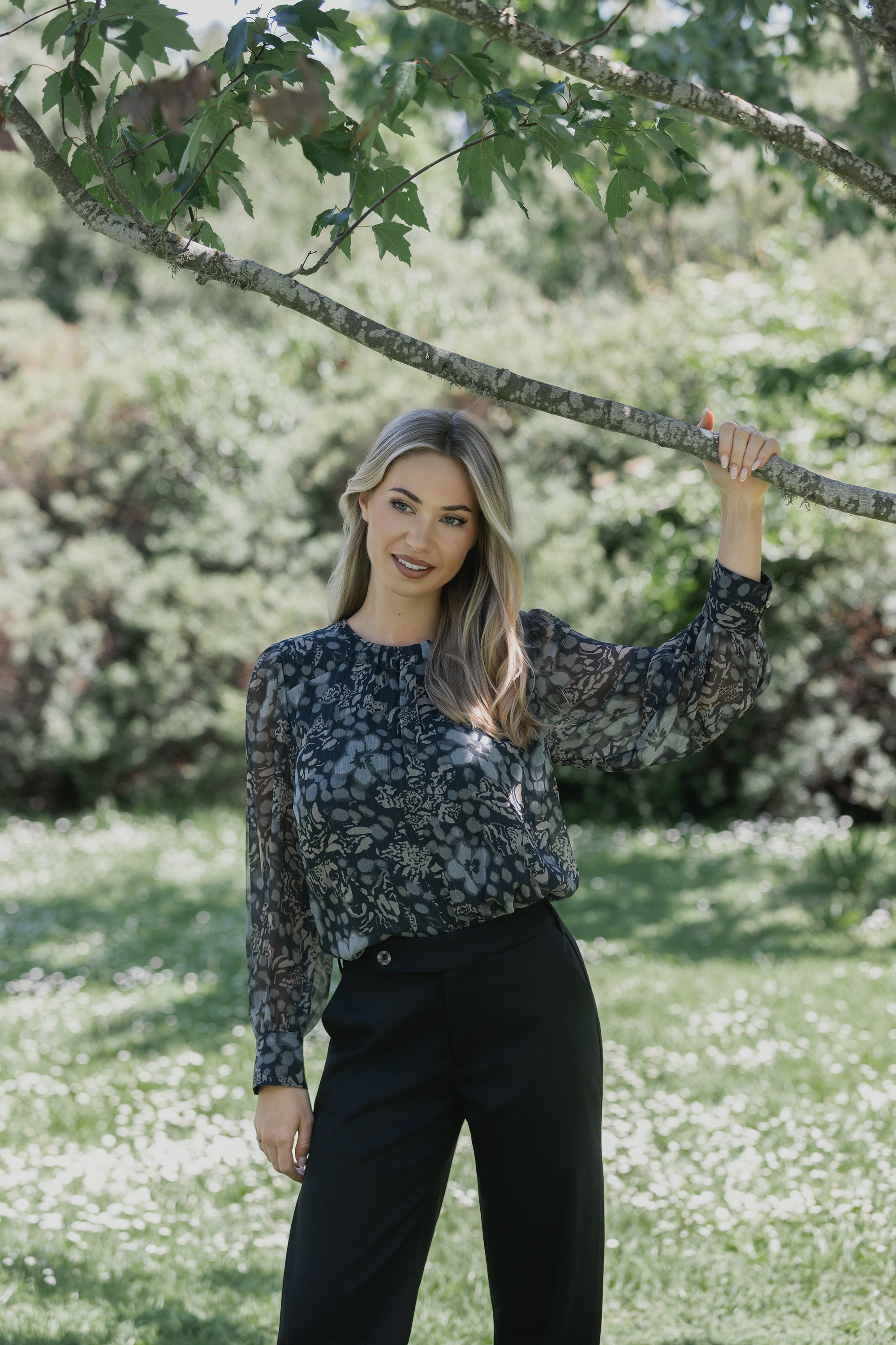 Long sleeve top in the Hazy print, a gold-green floral pattern on a black base. Featuring wide sleeves finished with barrel cuffs secured with two spherical buttons, a round neckline with back button loop closure, and a centre back seam.