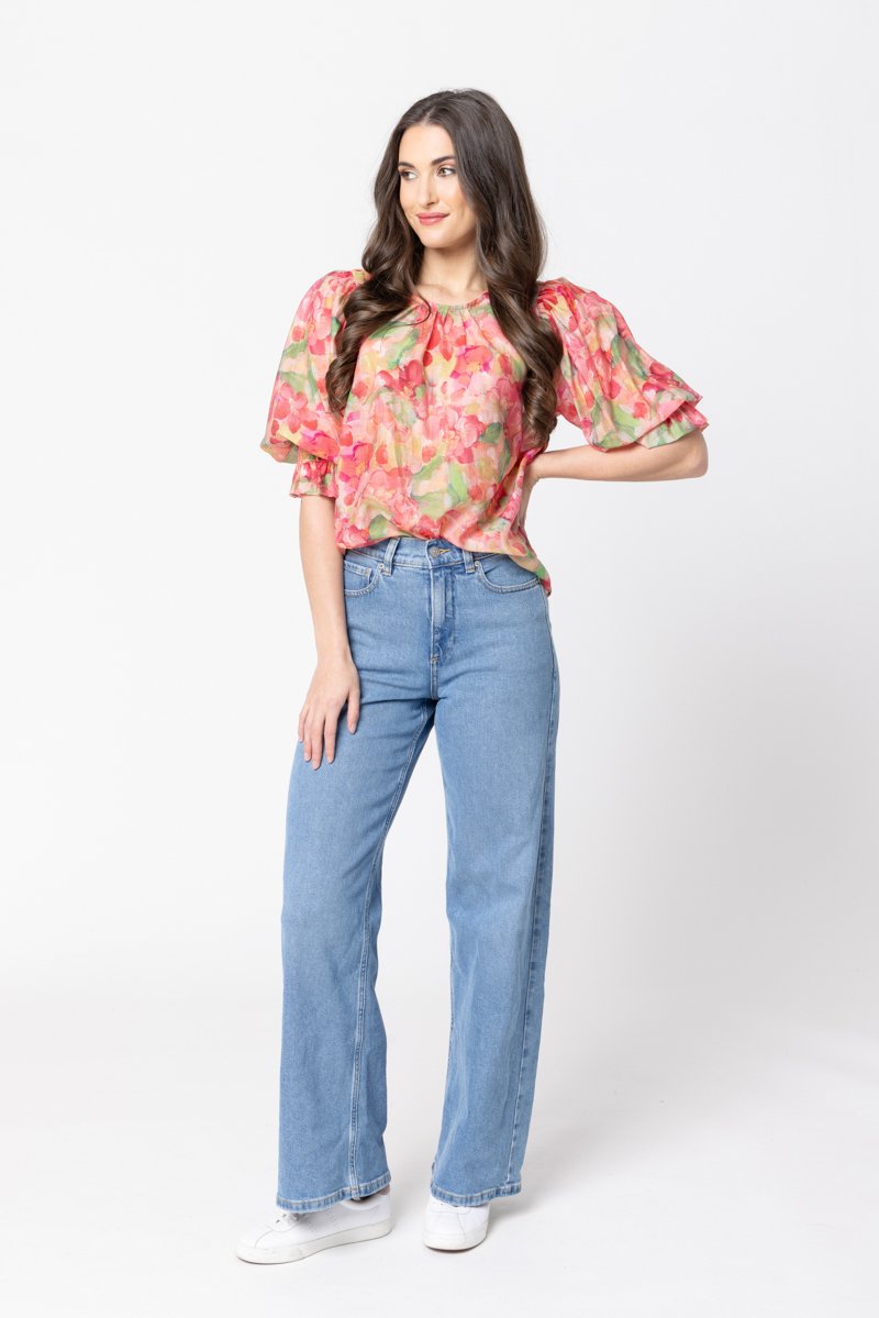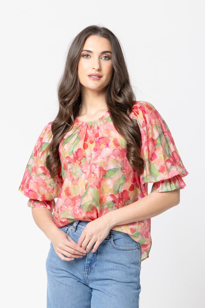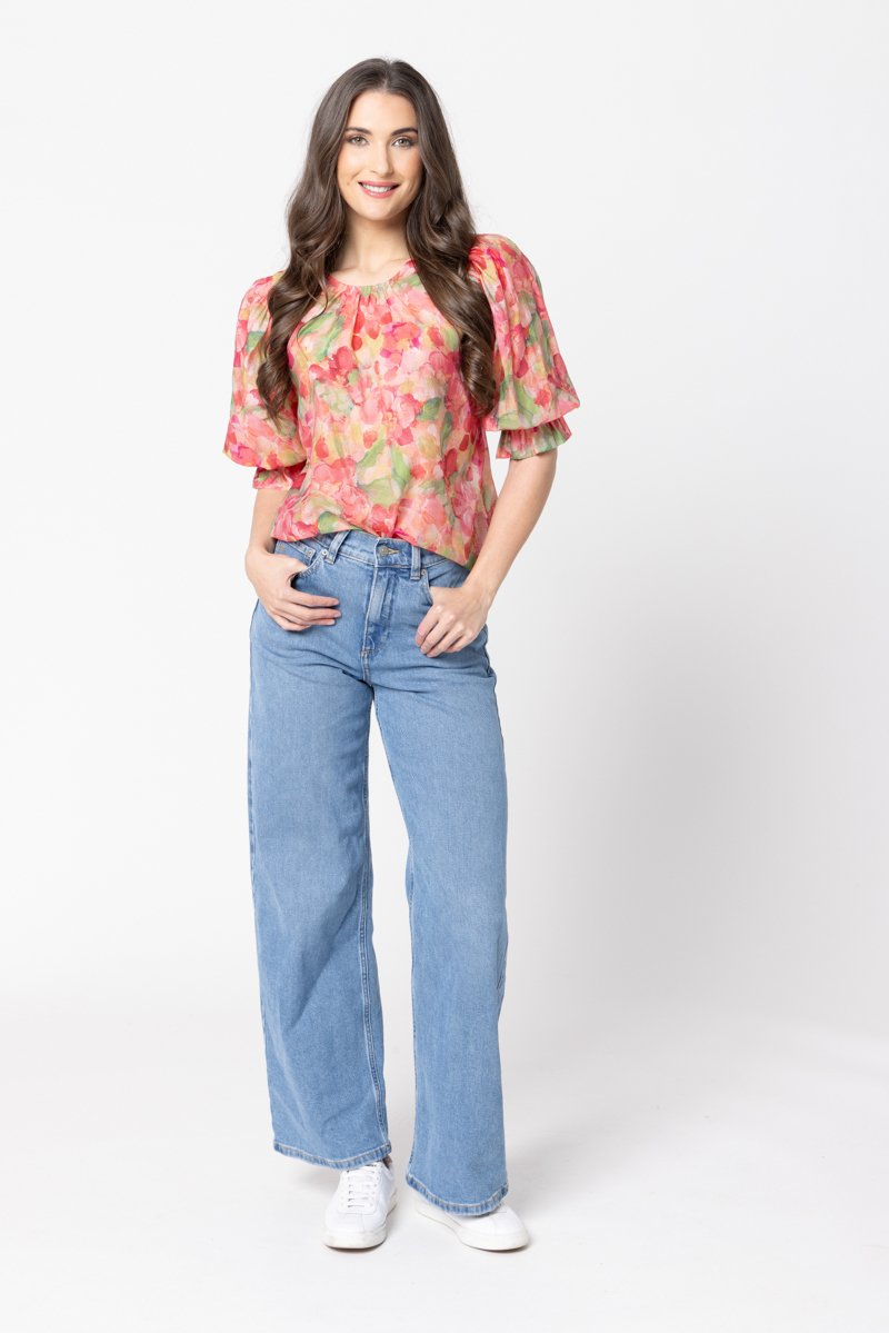 Crafted with meticulous attention to detail, this blouse features a charming pink and tangerine floral splash print that adds a pop of colour to any outfit. The 3/4 sleeves are adorned with shirring detail and a delicate frill at the cuff, creating a sophisticated silhouette that flatters the arms. The round neck design is complemented by a back neck keyhole detail, enhancing the overall allure of the blouse.80% Tencel 20% Nylon.