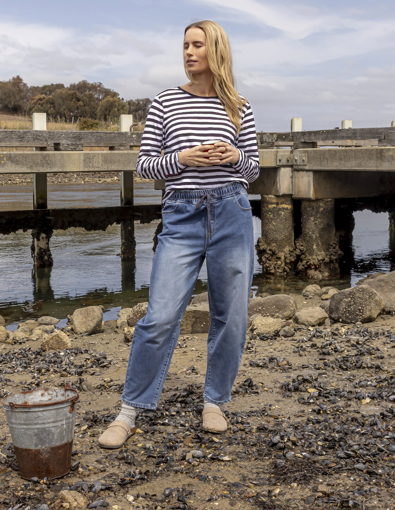 The Elm Marta Barrel Jogger offers a fresh take on denim with a relaxed barrel-leg shape. Crafted from stretch denim for comfort, these ankle-length joggers feature a true-to-size fit that’s easy to wear. Style with a classic tee or cosy crew and sneakers for laid-back everyday dressing.