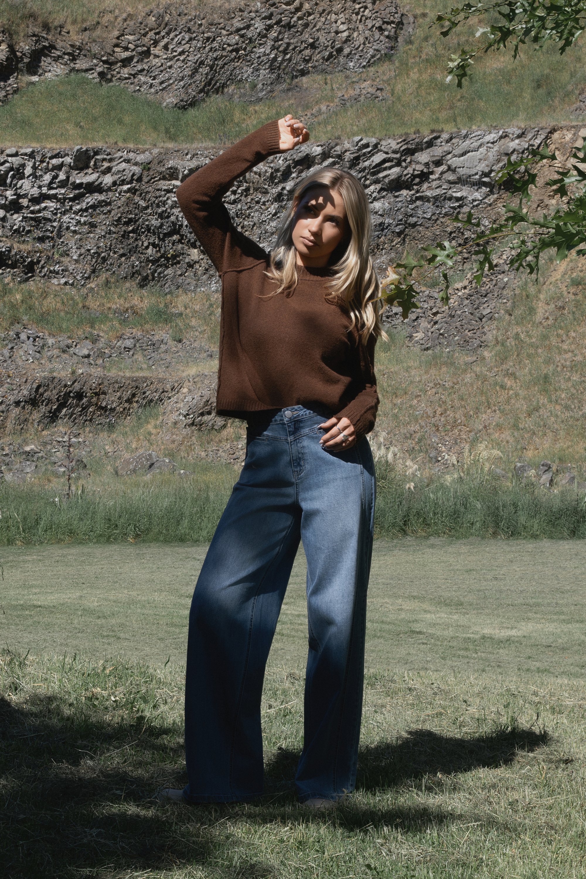 Cosy, stretchy knit sweater in Cedar, a warm, golden-brown colour. Featuring a round neckline and ribbed cuffs and hem, this sweater is defined by its exposed seam detailing along the shoulders, sleeves, and body.