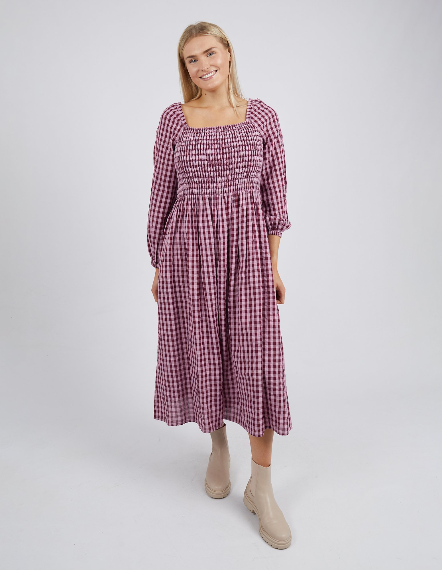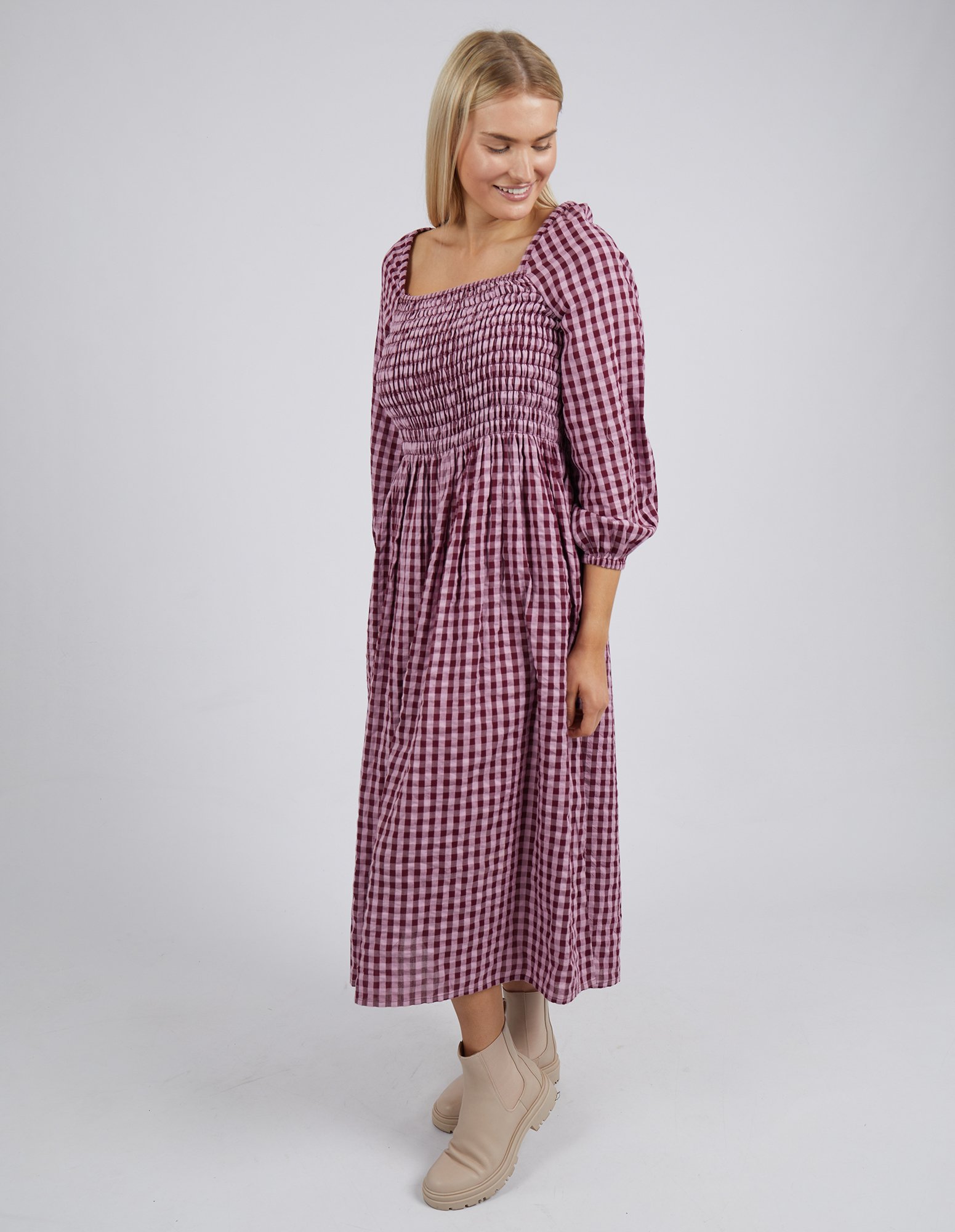 Stunning Seersucker dress with shirred bodice and square neckline.  Featuring rich plum wine coloured check, long elasticated wrist sleeves and side pockets.