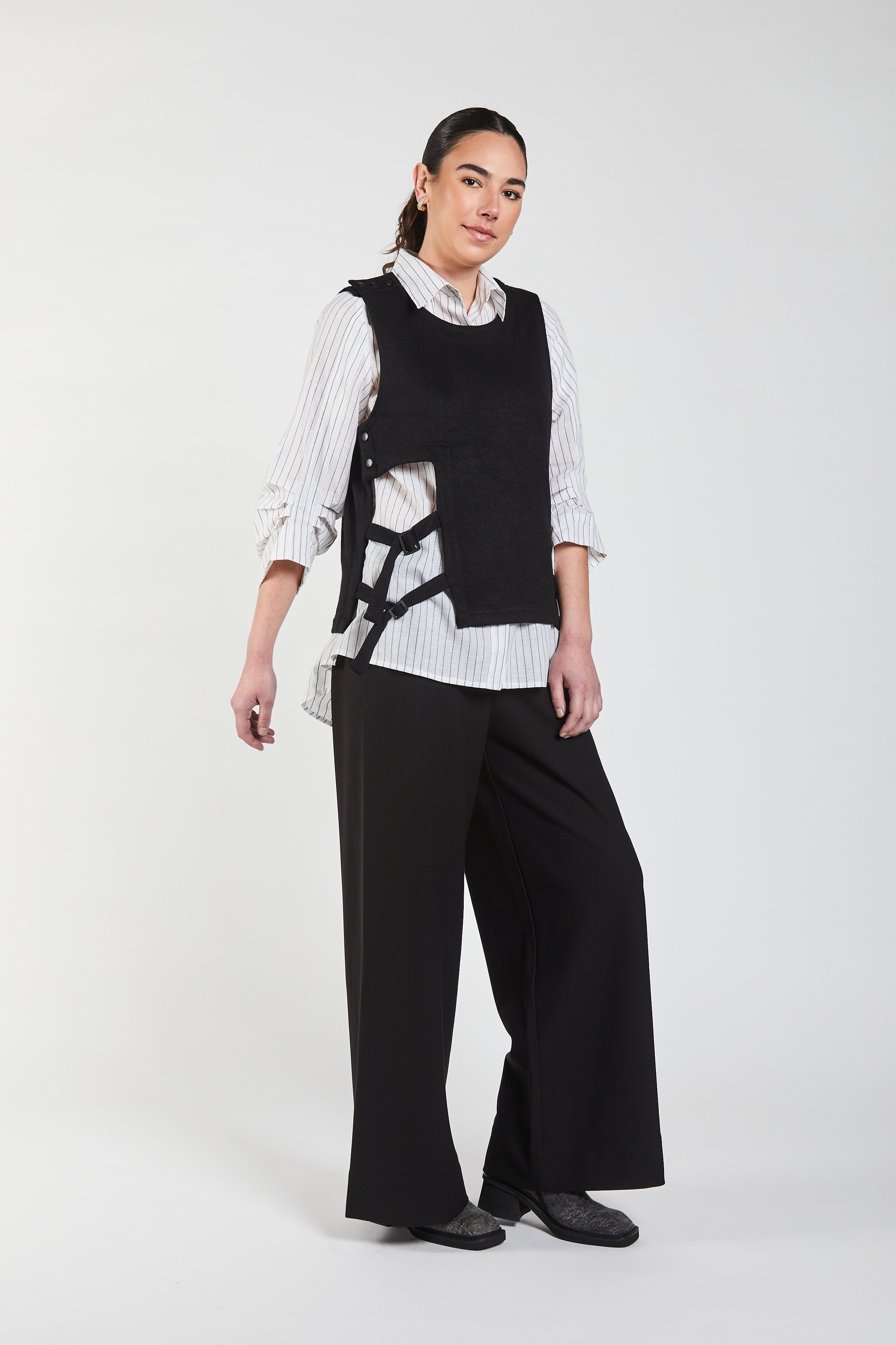 An exploration of contrast and form, the Plush Layer Top reimagines the idea of structure in comfort. Designed as an architectural statement piece, transforming everything layered beneath it. Cut from soft luxurious plush jersey, giving it an effortless a sculptural silhouette. A clean, rounded neckline and precise panel lines create a modern shape, offset by the tactile warmth of the jersey. Functional detailing defines the design side openings fastened with adjustable buckle straps and subtle snap closures introduce both utility and movement. Effortless yet commanding, an essential for those who dress with intention, but without fuss, bringing dimension to everyday dressing, elevating foundational layers into something sculptural. The Plush Jersey Vest is edgy, fashion-forward, and infinitely wearable, a piece that blurs the line between utility and art, comfort and statement.