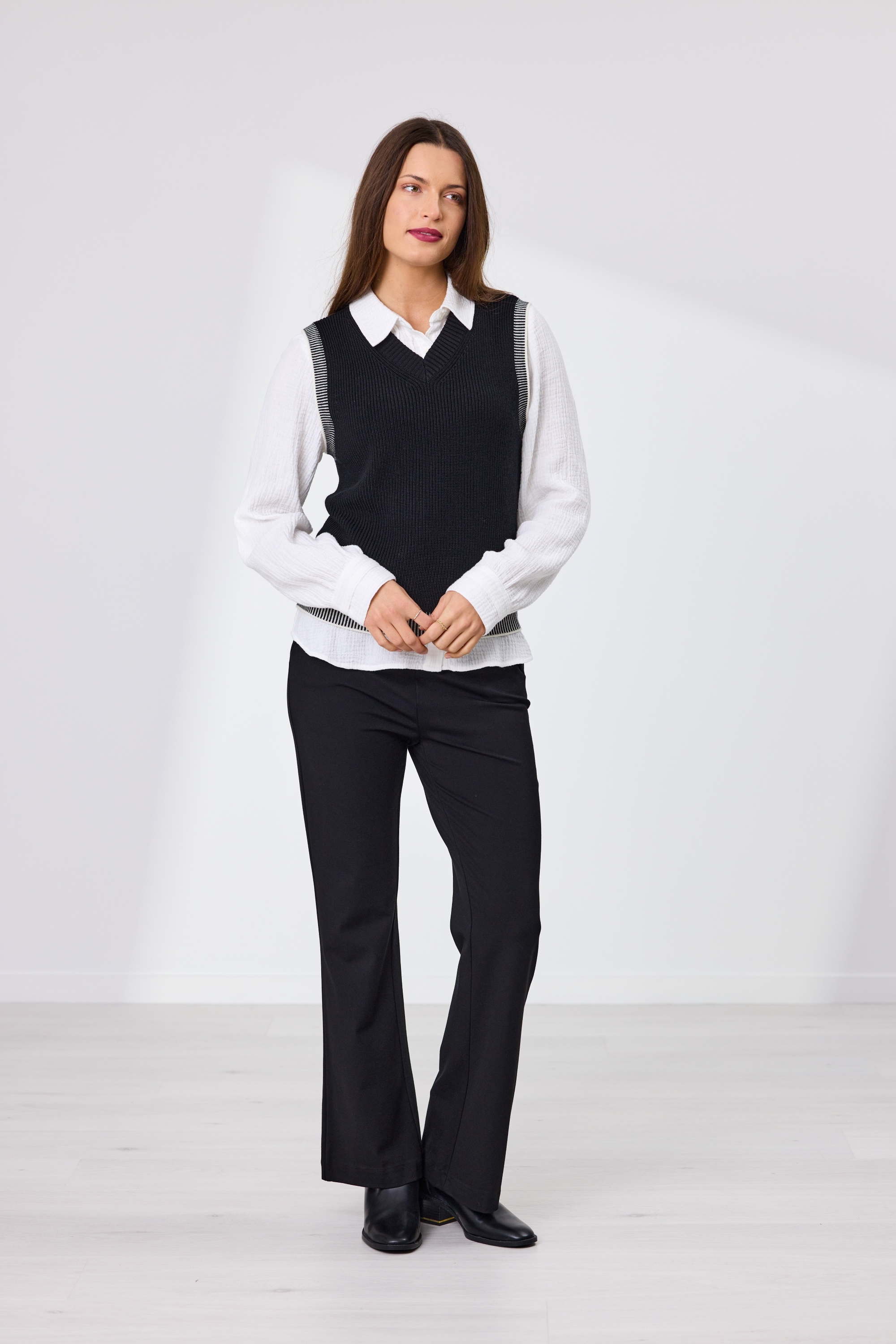 This 100% Merino wool vest is a versatile layering essential with elevated detailing. Featuring a two-tone rib finish around the armholes and hem, it adds a subtle contrast that enhances its modern appeal. Side splits offer ease of movement and a relaxed fit, while the classic V-neckline makes it perfect for pairing over shirts.