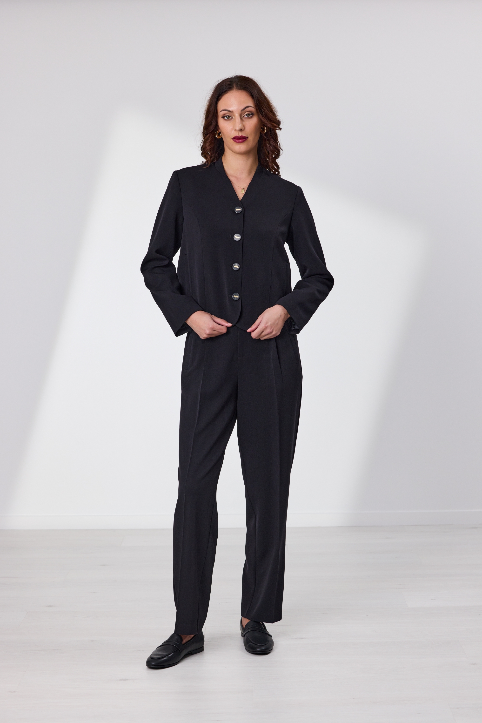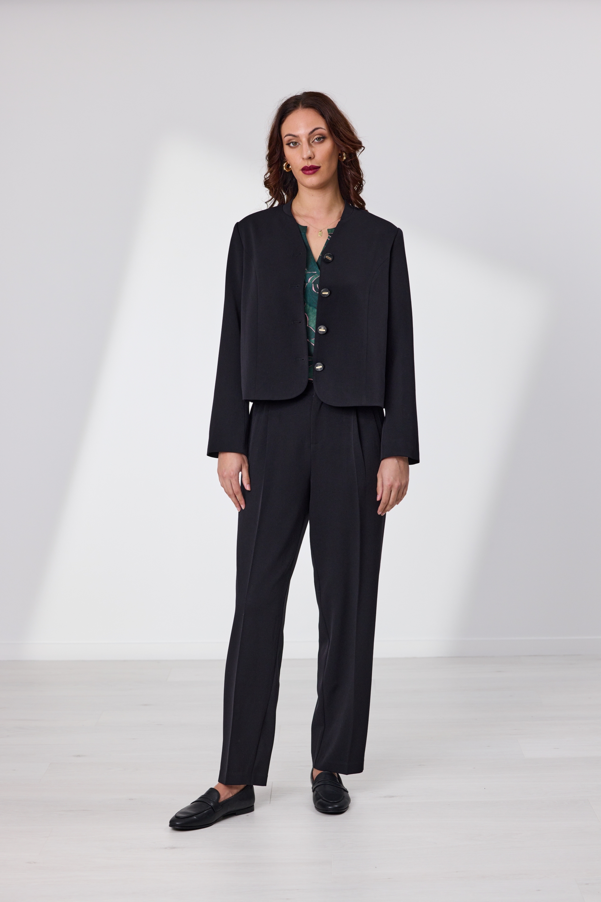 This fully lined cropped blazer is a modern wardrobe essential, featuring a tapered mandarin collar and clean button-front closure. Designed with a curved front hem and functional pockets, it blends structure with subtle flair. The sleeve cuffs reveal a striped lining when rolled up, adding a playful contrast to the sleek exterior. Perfect for layering over both casual and dressy looks.