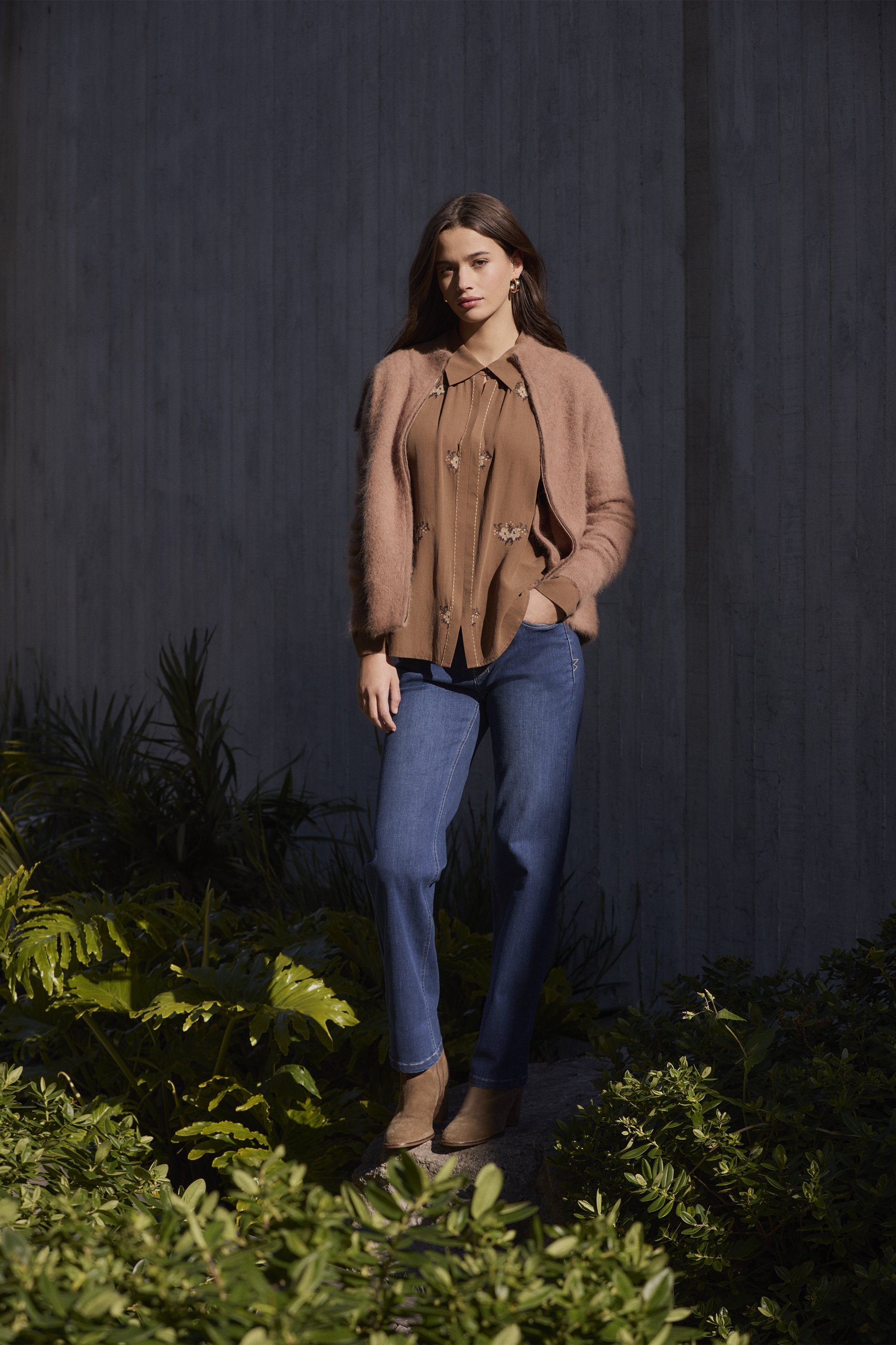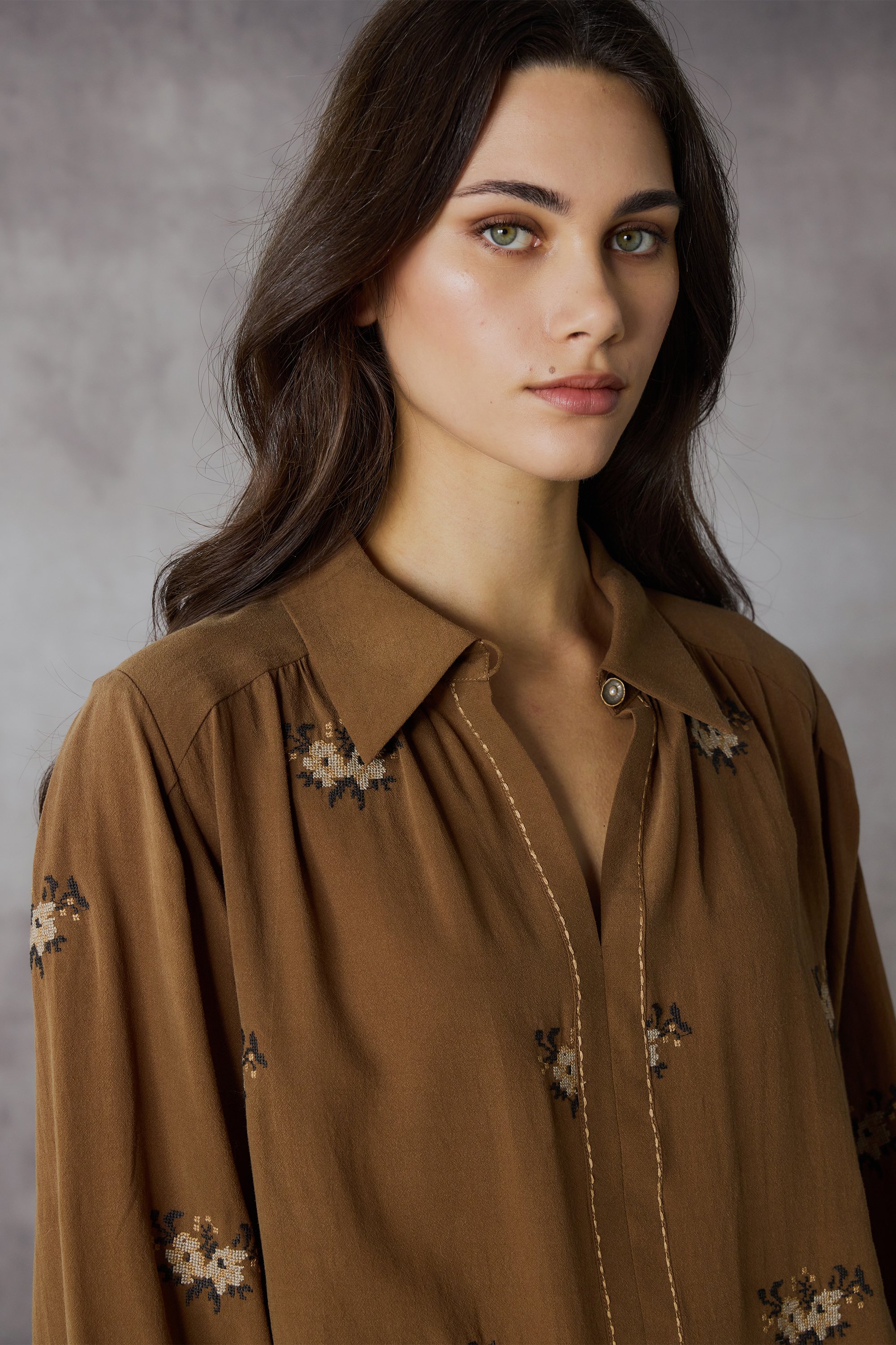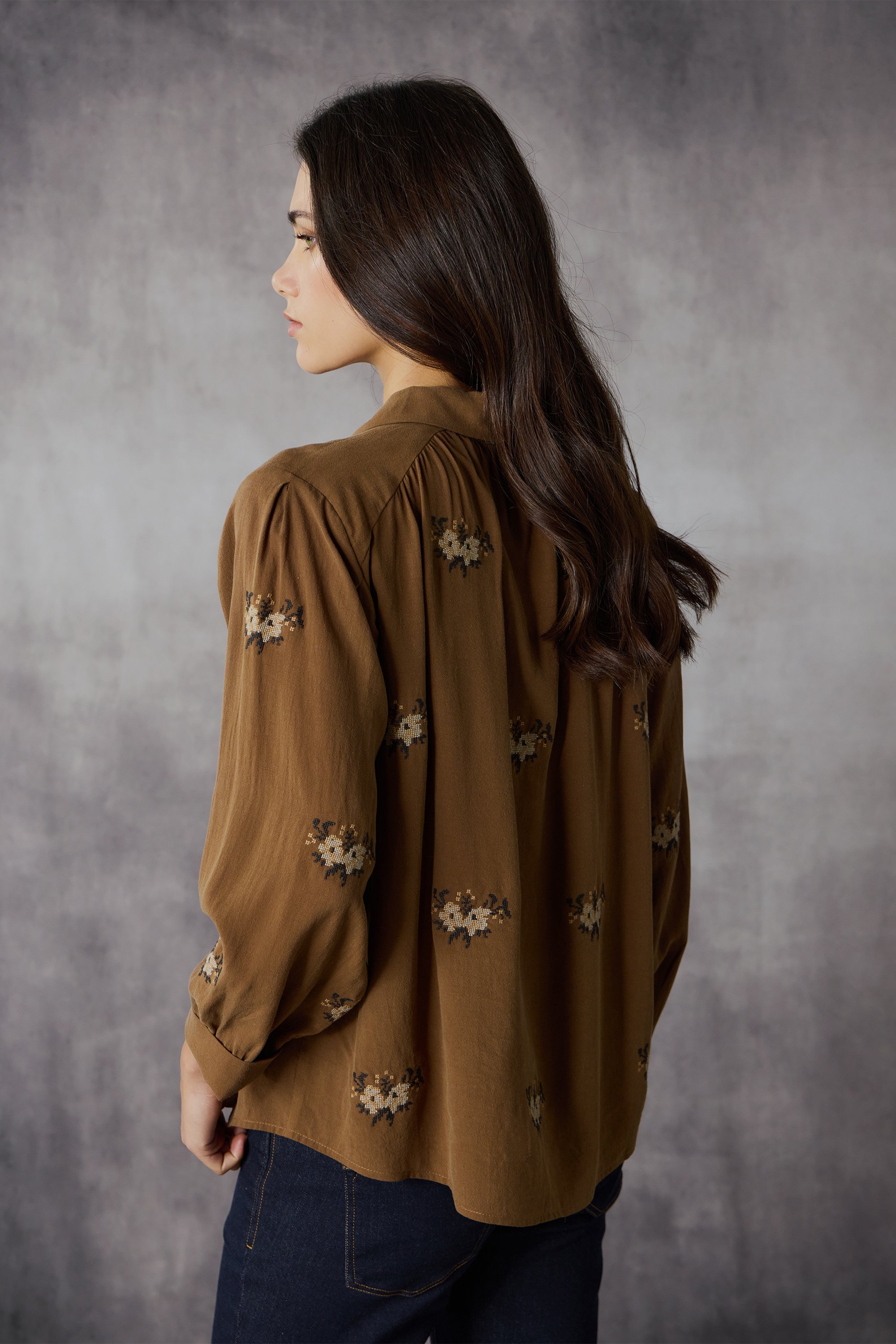 The Tapestry Shirt is a timeless blend of elegance and modern charm, featuring a delicate tonal cross-stitched floral embroidery throughout the shirt. Thoughtful details like antique flower button at the neckline, contrast embroidery stitching down the centre front and soft gather on the shoulder and back neckline makes this a standout piece for any occasion