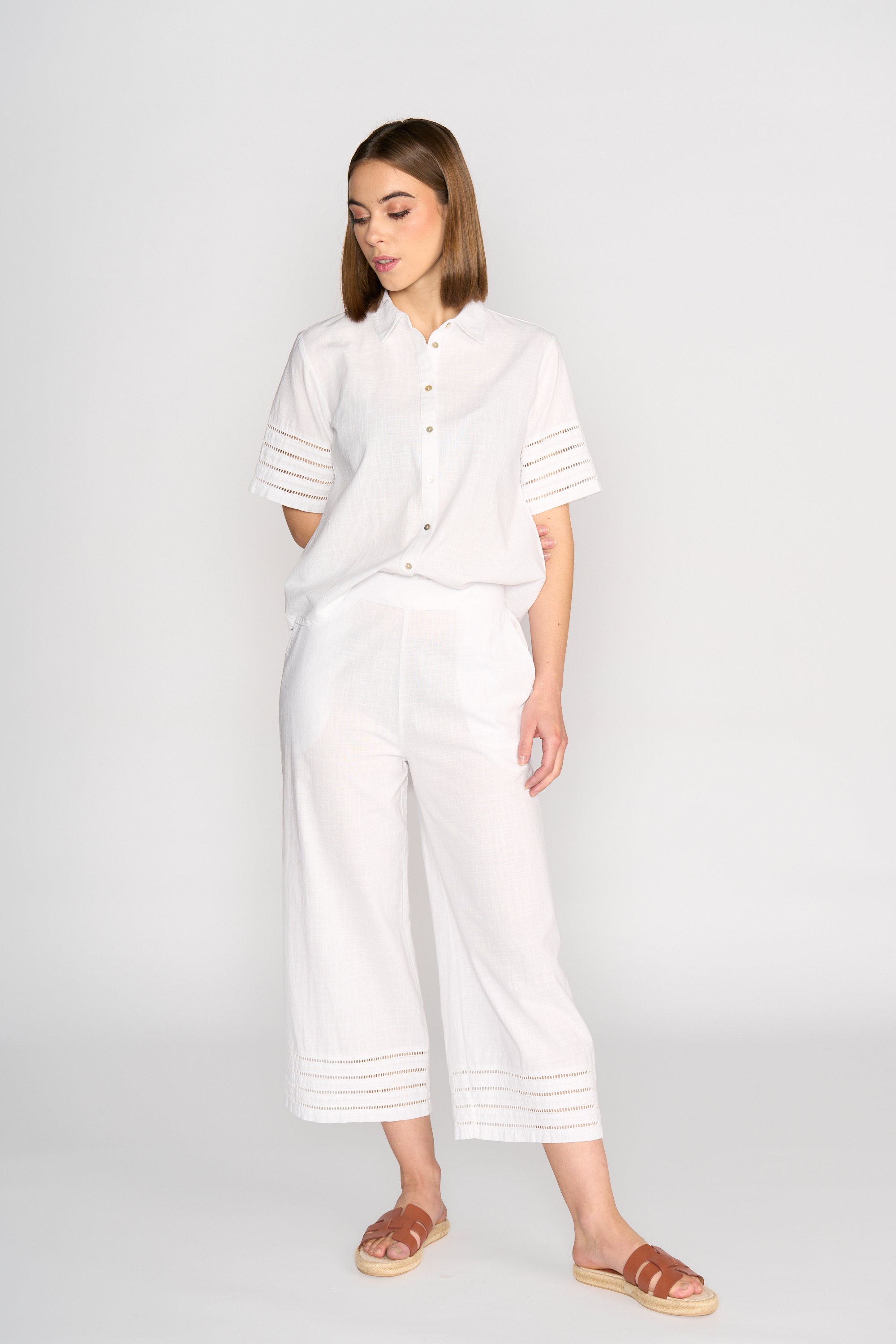 A wide leg 7/8 length pant in olive, made from breathable 100% cotton with a linen look. Designed with a flat front and finished with delicate trim detailing around the cuffs for a fresh, summery feel.