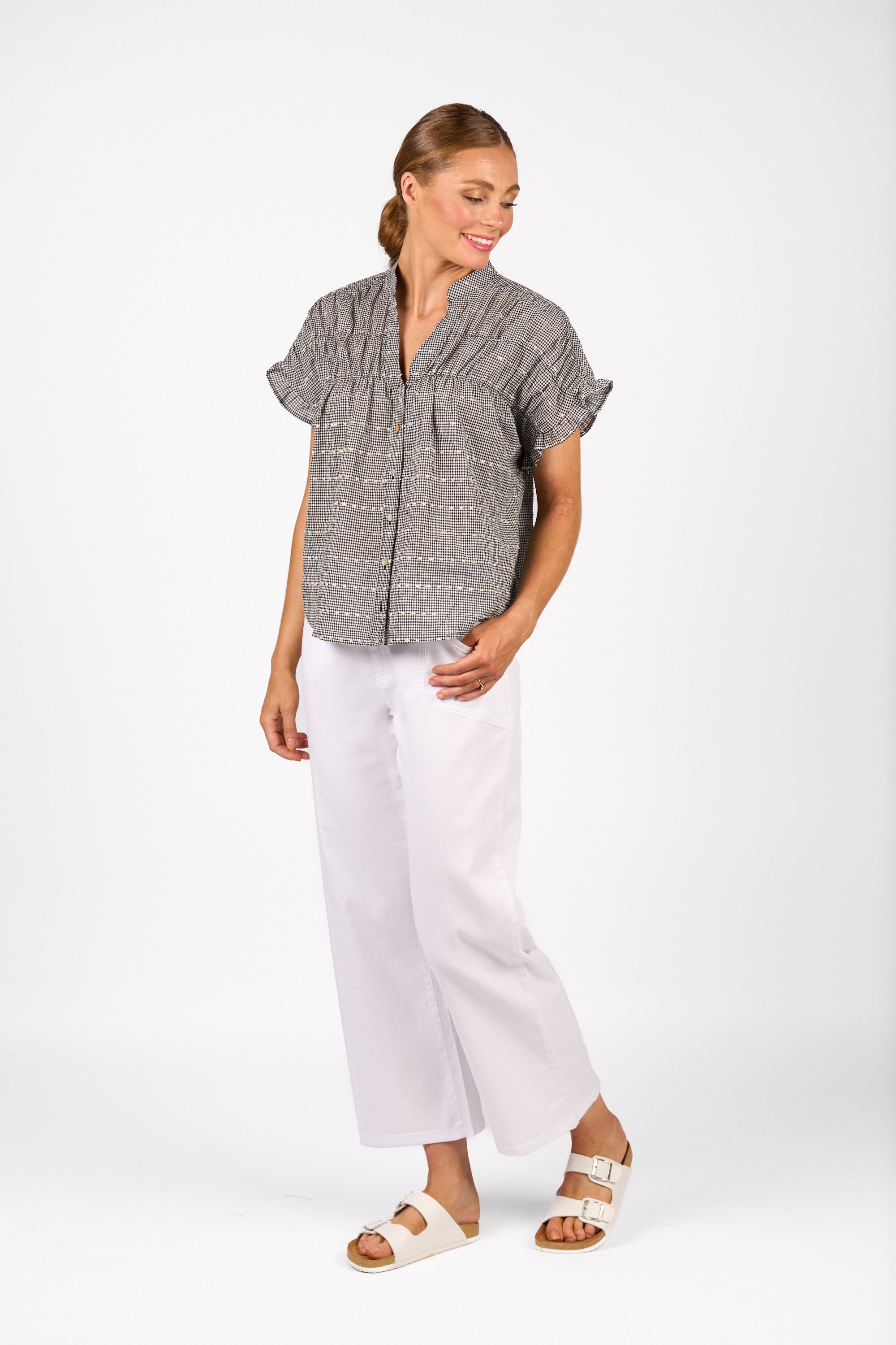 The Addison Top is a lightweight summer favourite with a relaxed fit and feminine frill cuffs. Its V-neck and shirred detailing add subtle charm, making it perfect to wear on its own for effortless style.