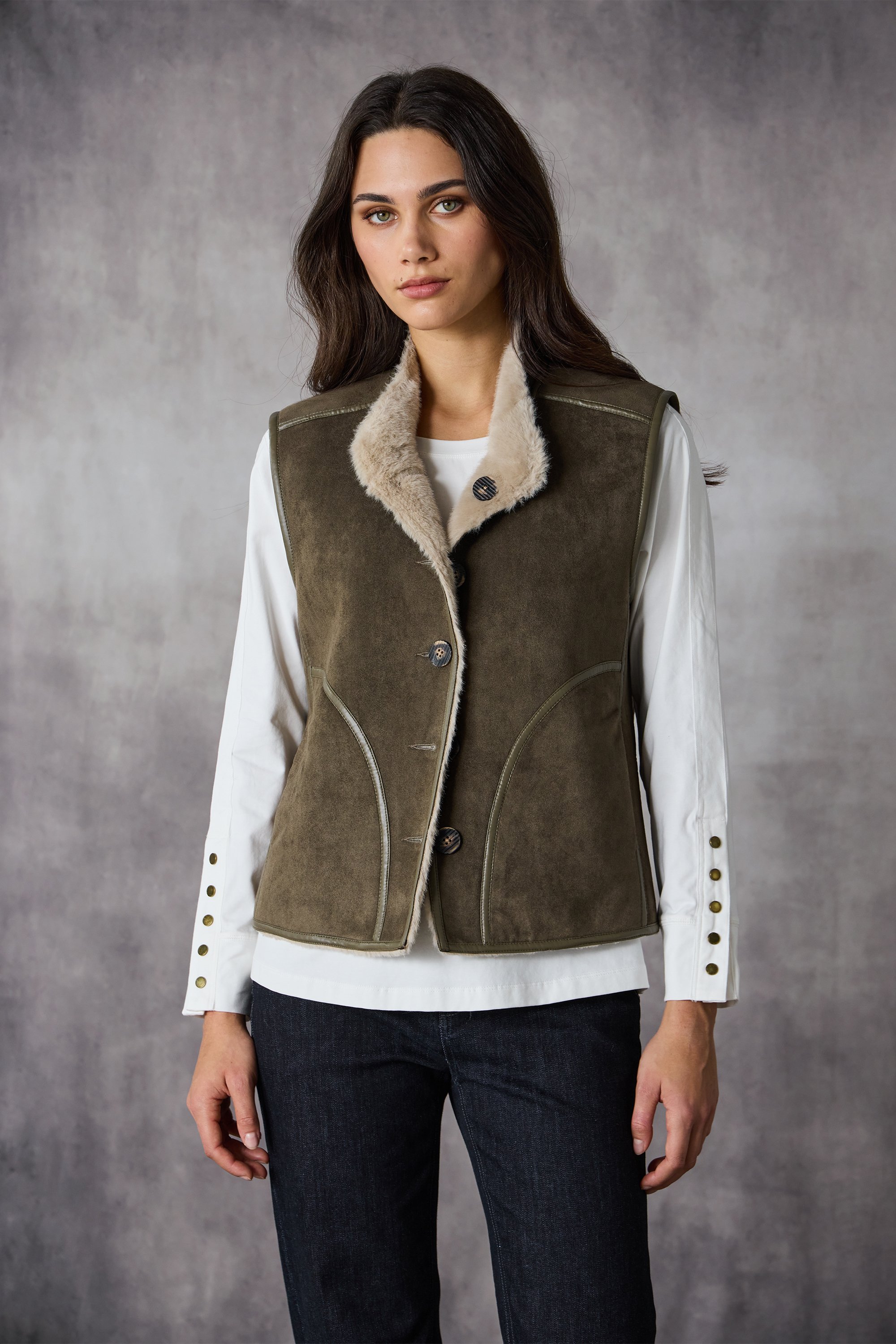 The Aspen Vest is a reversible design offering two stylish looks in one. Crafted for comfort and versatility, it features a modern stand neckline, textured natural buttons, and bound armholes. Perfect for layering, this on-trend piece combines functionality with effortless style for any occasion.