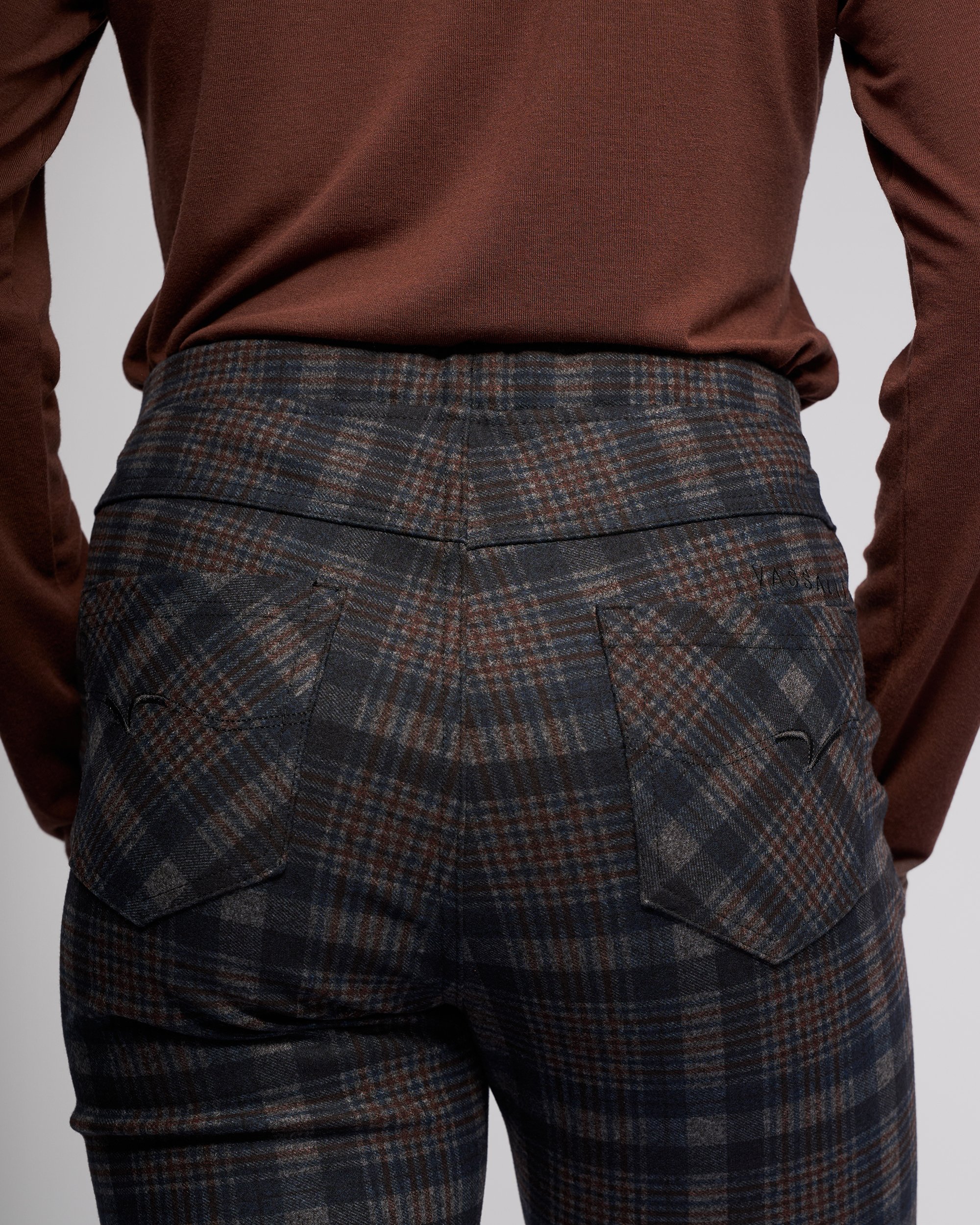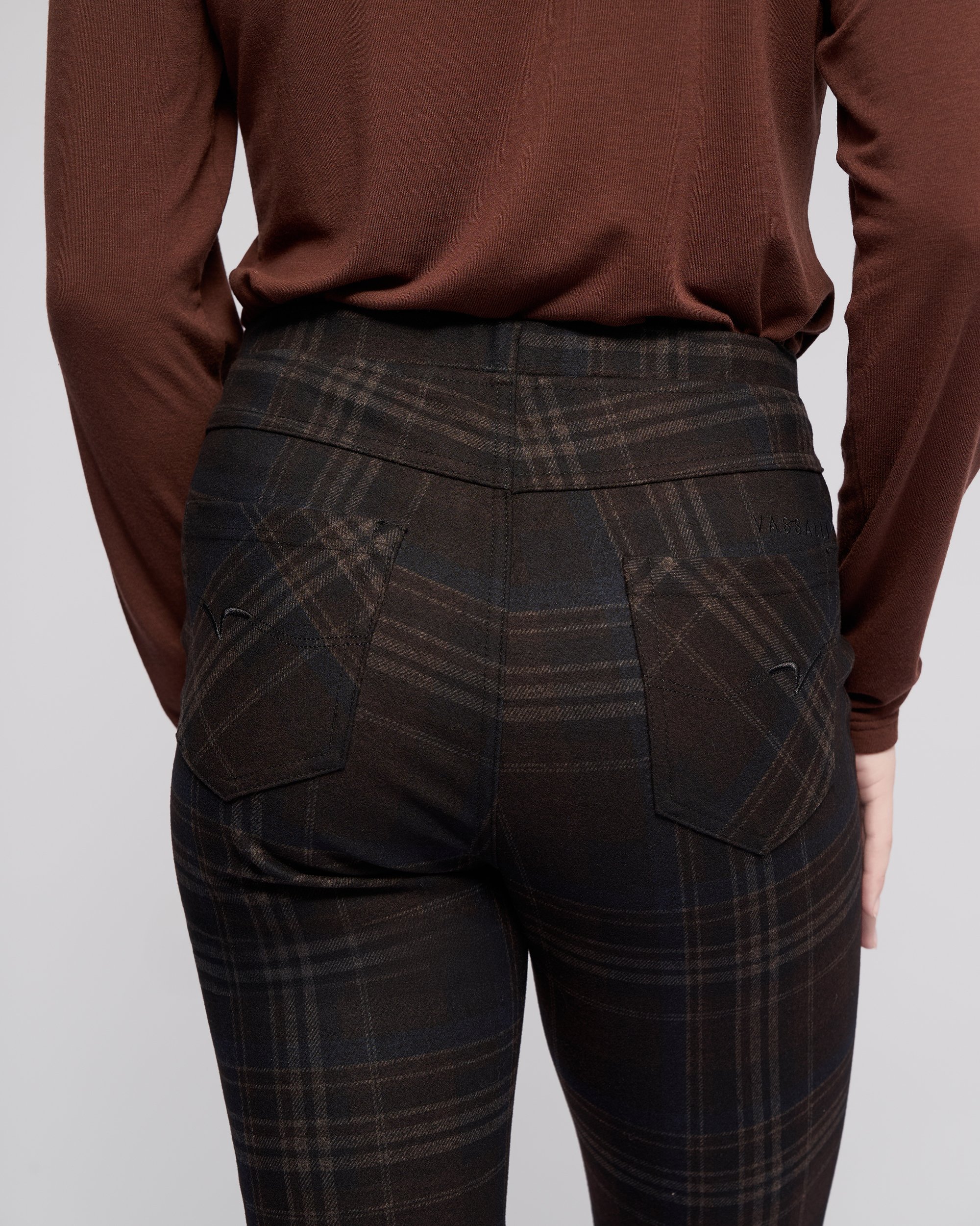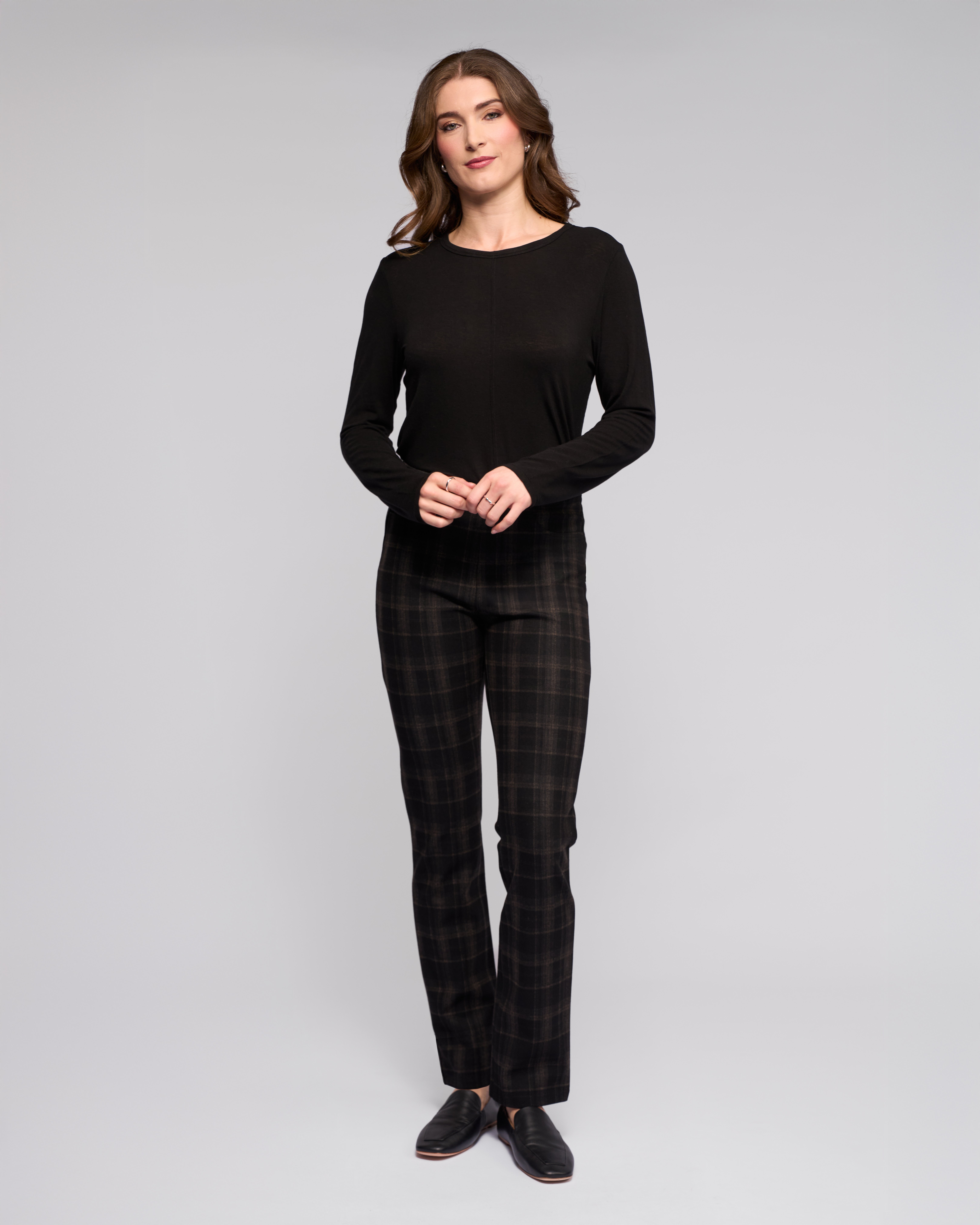 Full-length slim pant in stretch ponti fabric. This easy pull-on style features an elasticated waistband for a comfortable fit, finished with refined detailing including a faux fly, faux front pockets, and back patch pockets.