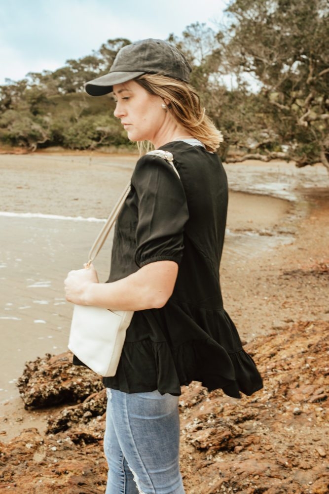 Features main zipped compartment and smaller front compartment with magnetic closure.