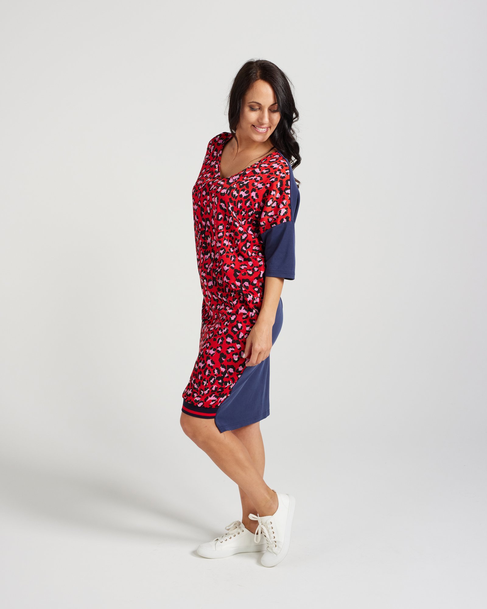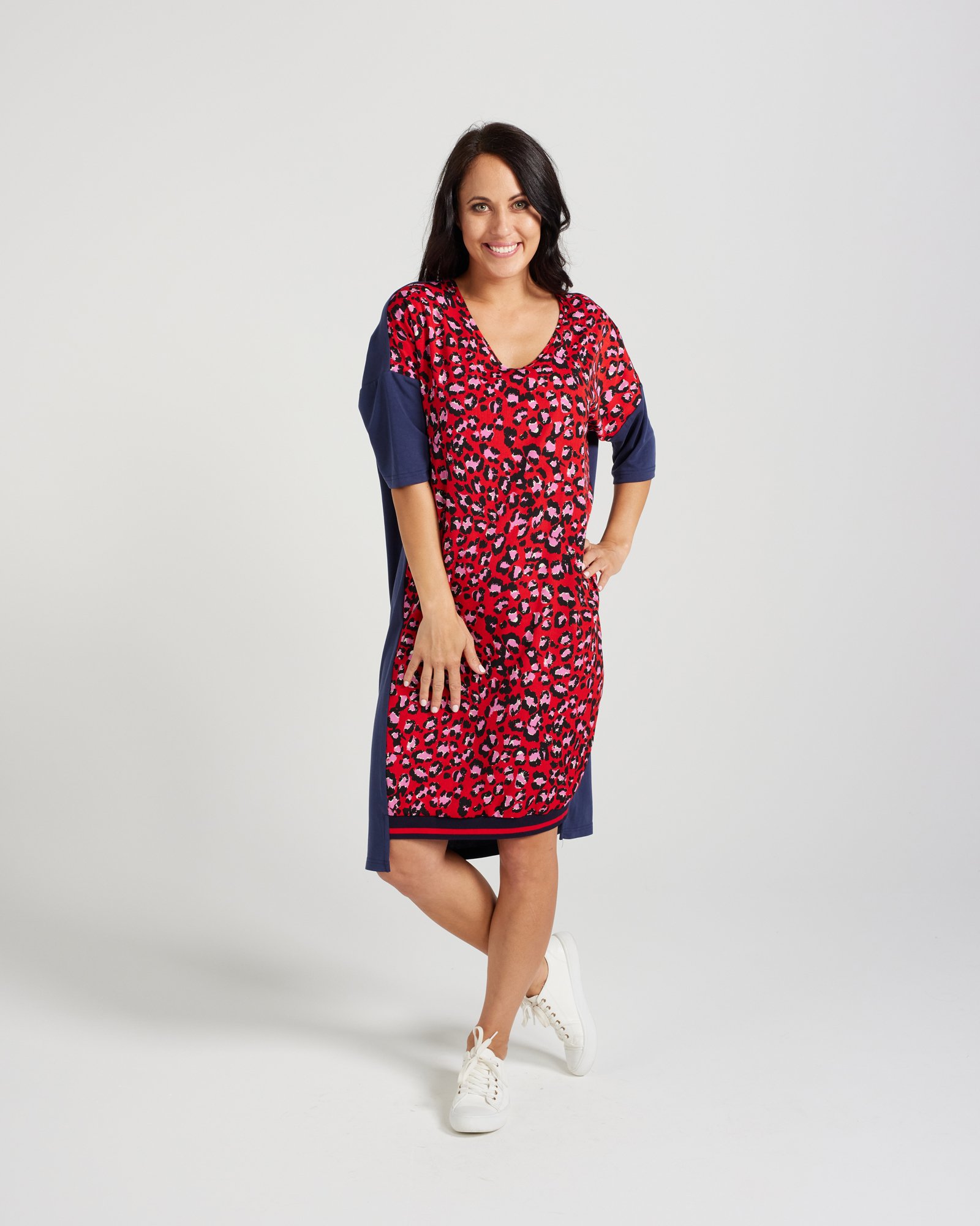 Classic shift dress. Easy fit. V neck. Drop sleeve to elbow. Contrast fabric and hem trim. Little longer in the back than front.