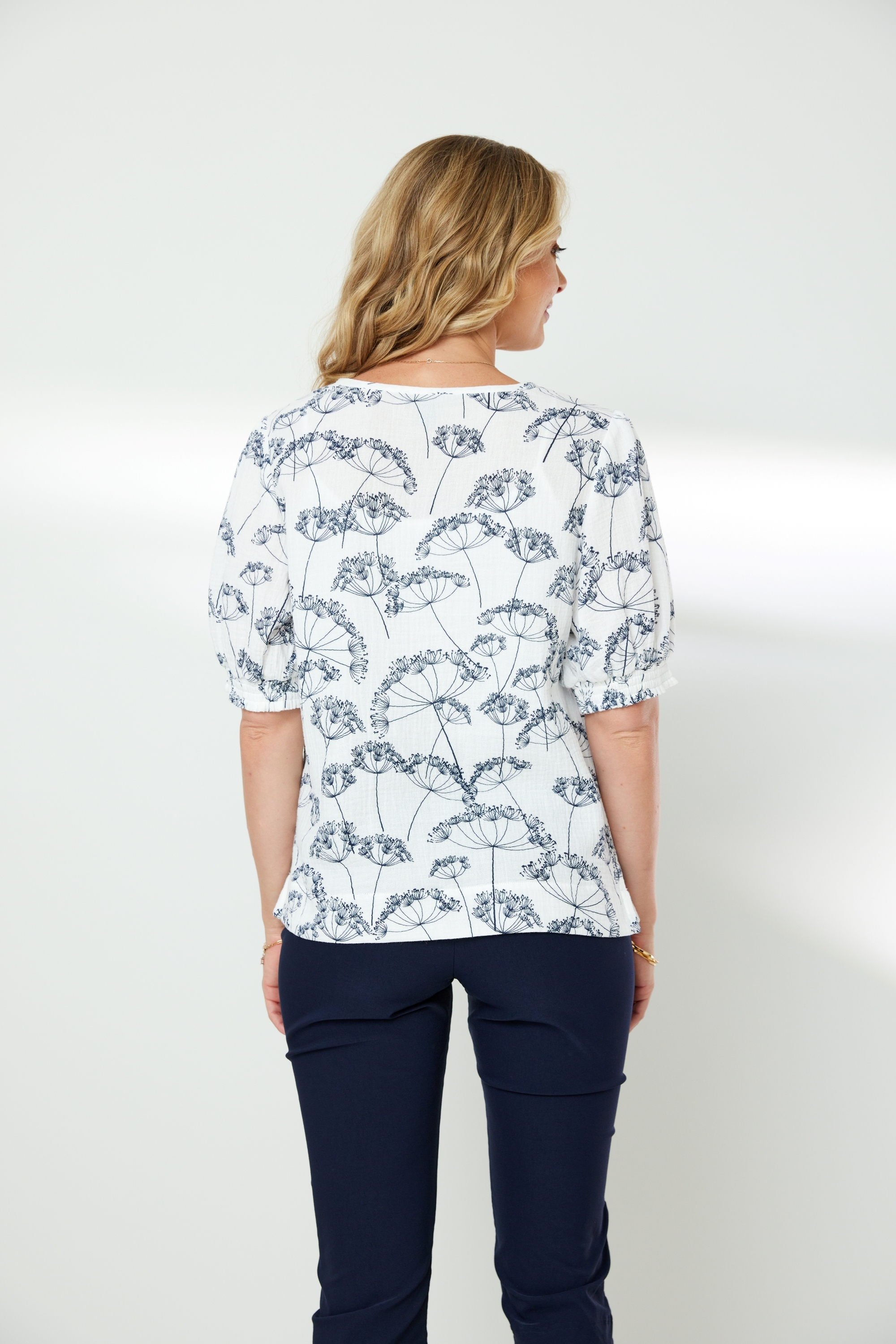 This beautiful printed 100% Cotton Double Gauze top has short sleeves with shirring at the back cuffs and a scoop neck.