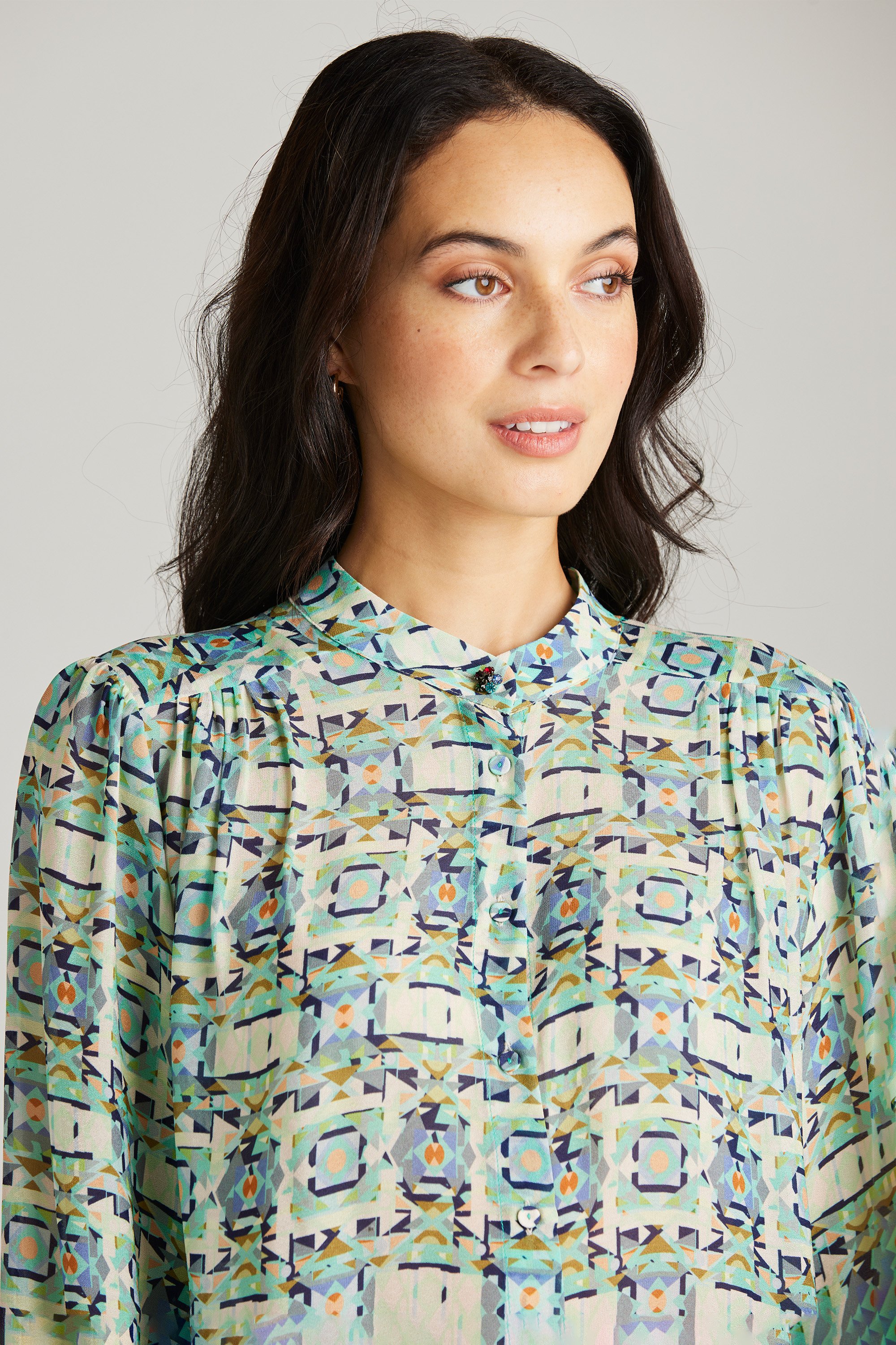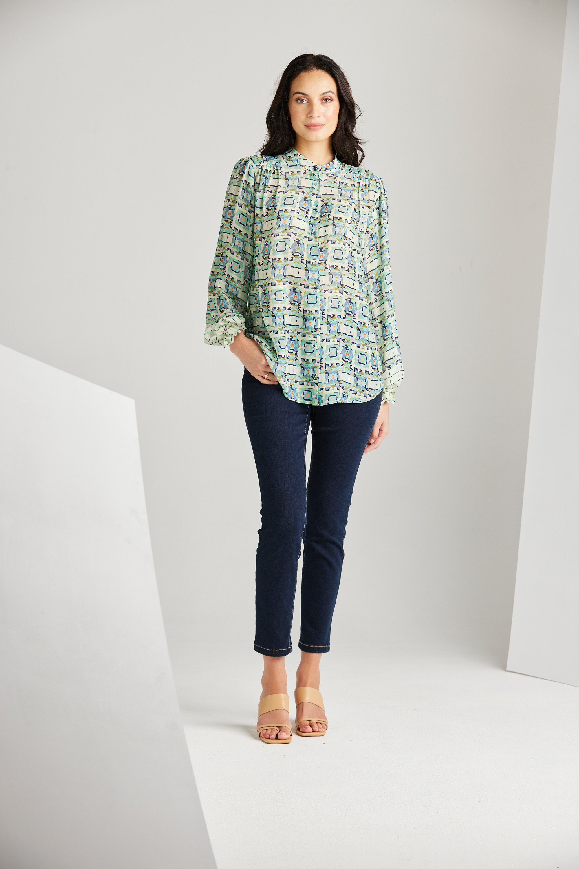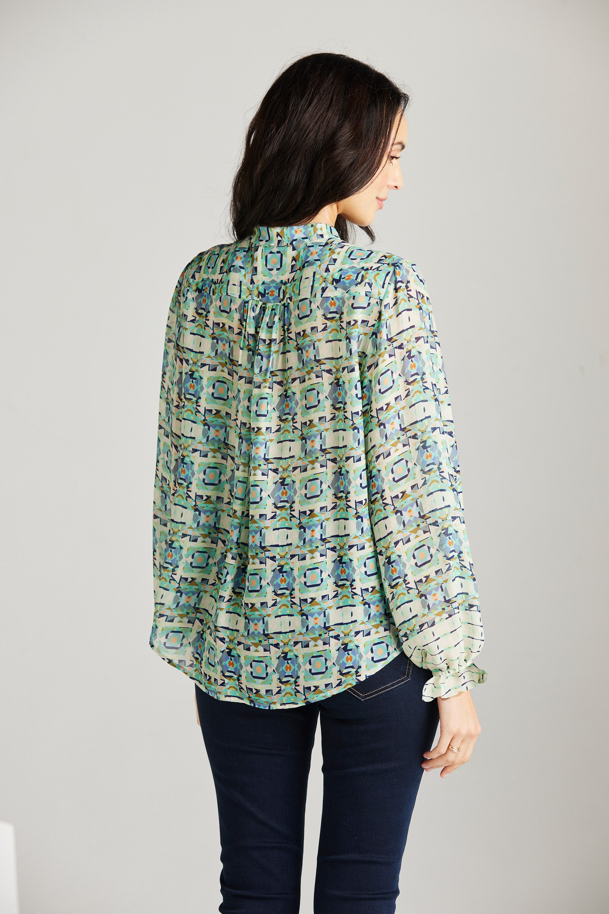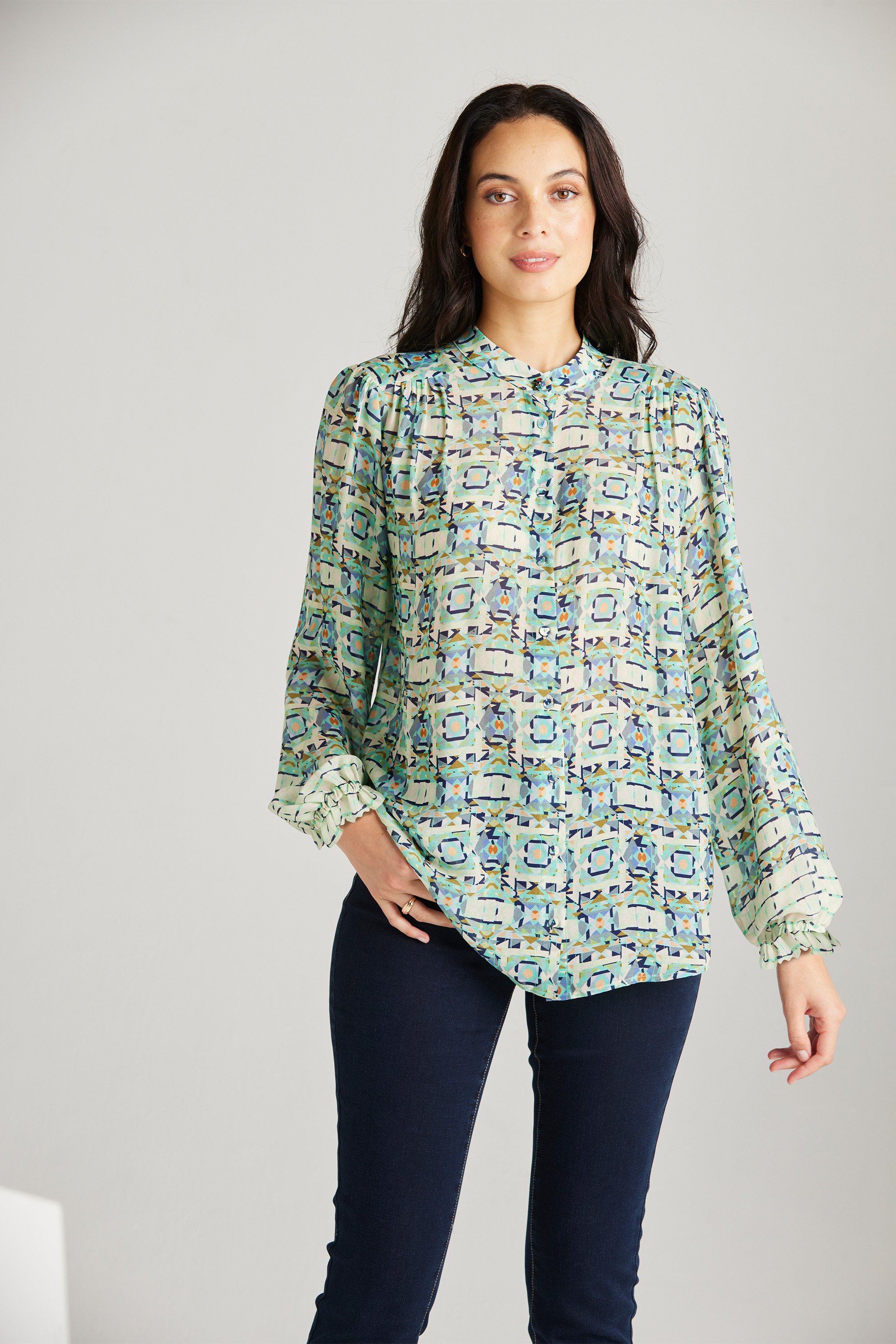 The Calle Shirt is romantic and sophisticated, perfect for celebrating a new season. This glamorous shirt features a delicate geometric print and softly gathered frill at the cuffs. Wear it with black denim and sandals for an effortless and chic look.