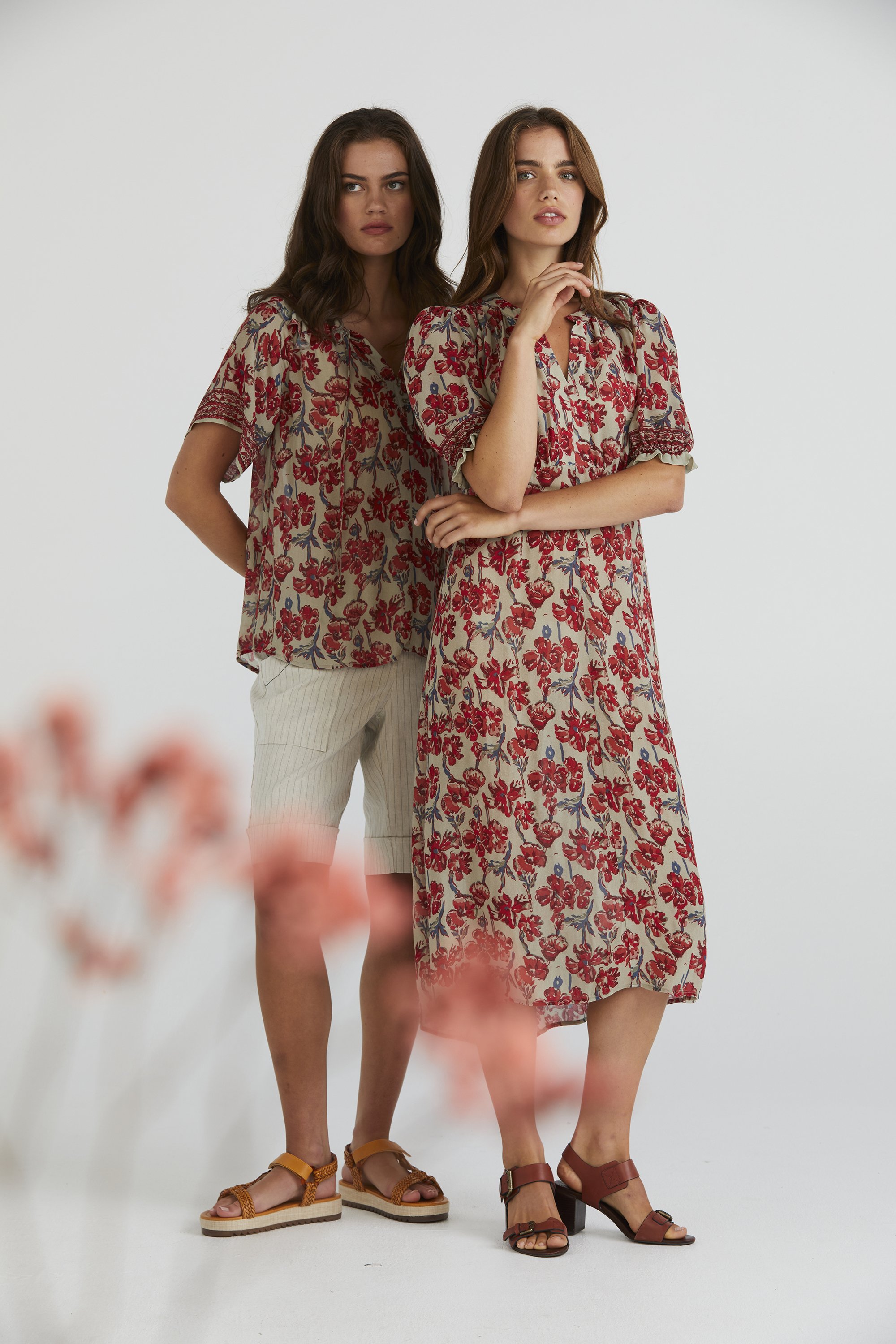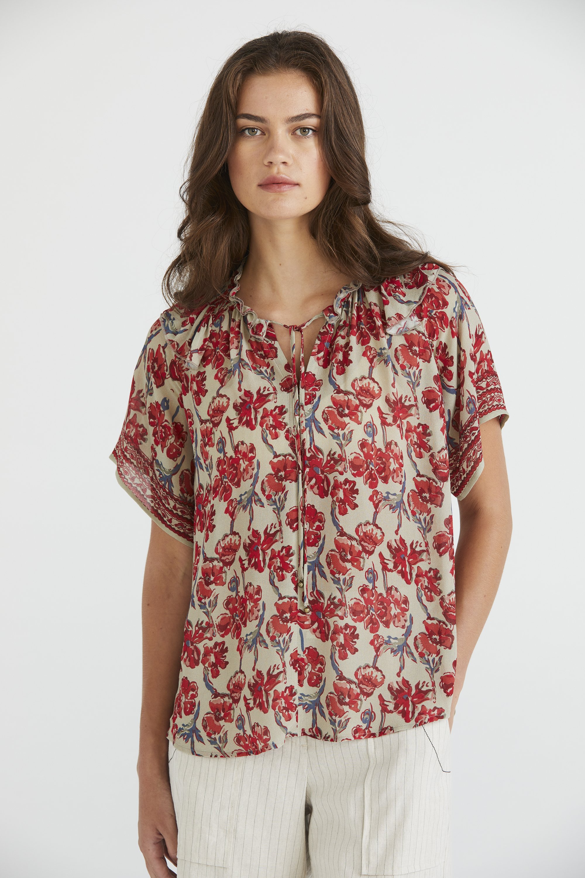 Immerse yourself in feminine charm with the Casia Top, a floaty viscose rayon blend adorned in the elegant Casia floral print. Its border print sleeve hem design adds a touch of sophistication, while the gathered ruffle neckline with ties offer a romantic aesthetic. Perfect for adding a touch of femininity to your look, this top is a versatile wardrobe essential.
