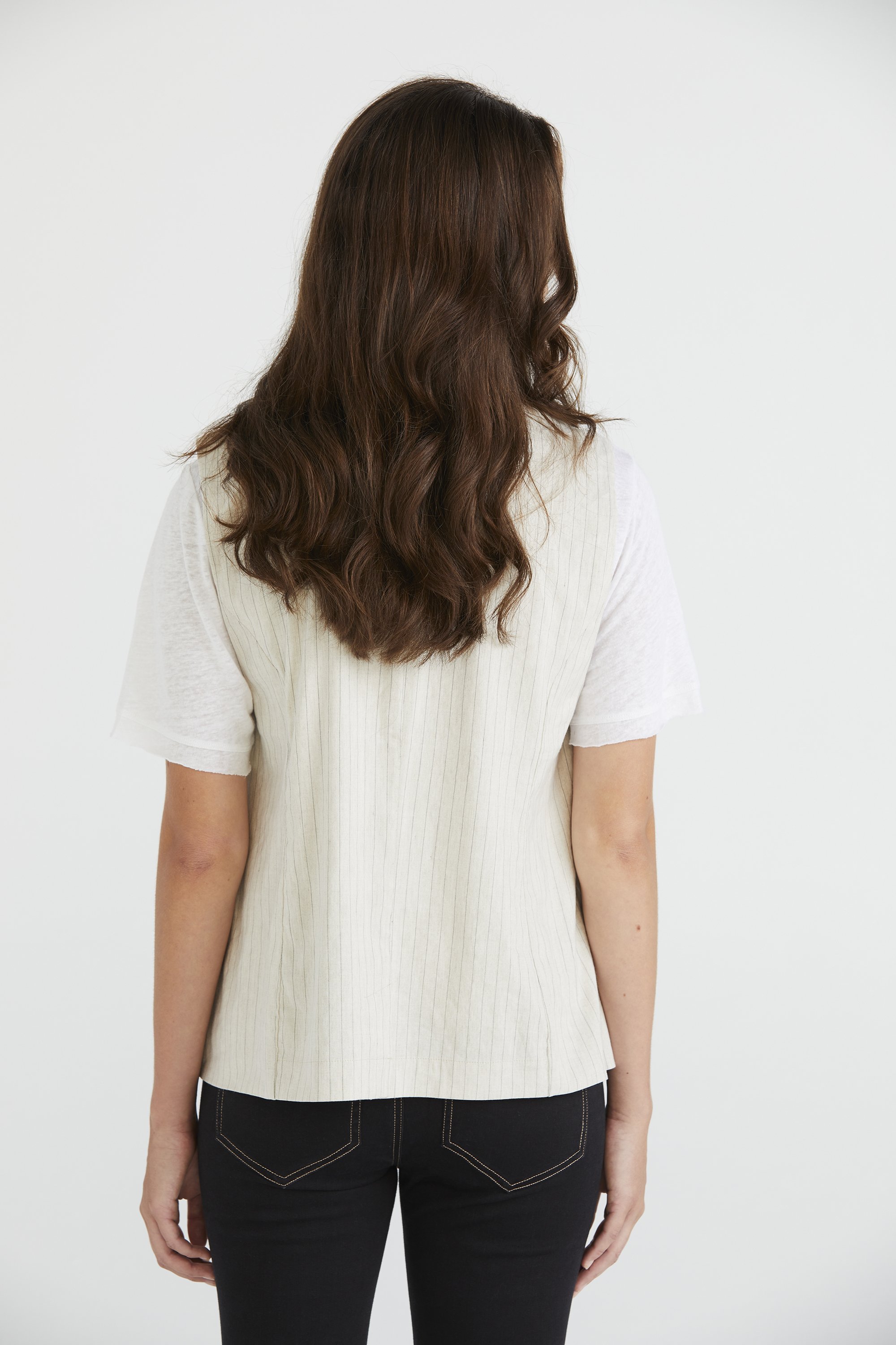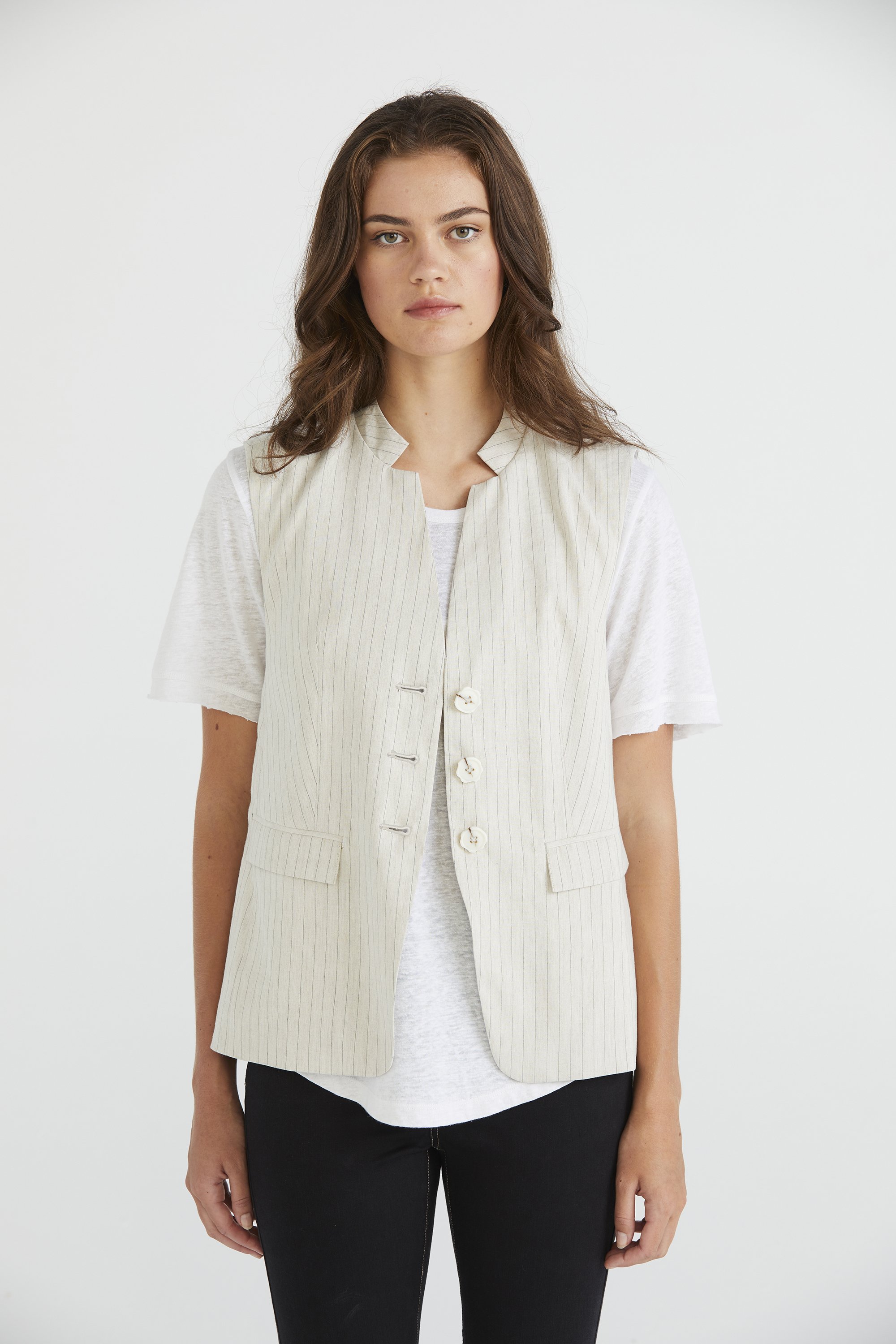 Elevate your look with the Chelsea Vest, a sleeveless linen blend piece in a sophisticated pinstripe. Its notched cutaway neckline adds a modern touch, while asymmetrical buttons provide subtle detailing. Pair it back with the Chelsea Pant or Short for a polished and on-trend look that transitions seamlessly from day to night.