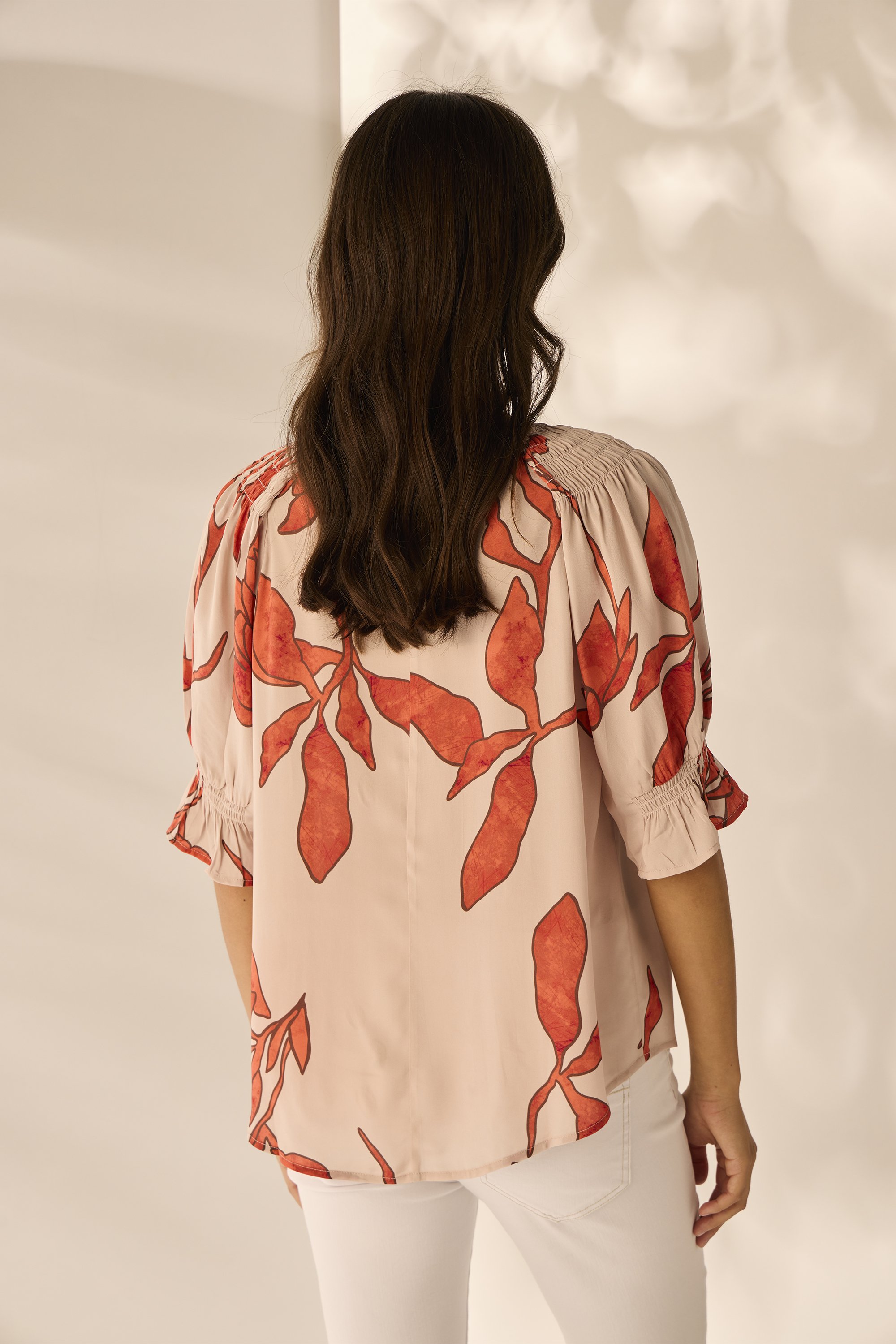 Welcome effortless elegance with the Chino Top—a beautifully detailed essential blending comfort and style. Featuring an exclusive in‑house print, delicate shirring at the raglan shoulder, and soft gathering around the neckline framed by refined binding. Elbow‑length sleeves with half‑elasticated cuffs introduce gentle volume, completing the look with understated charm.