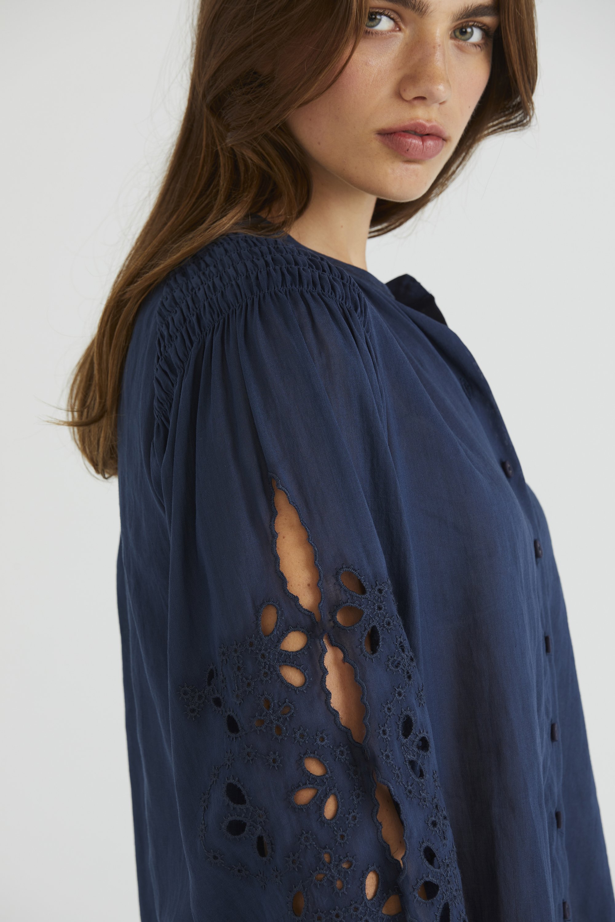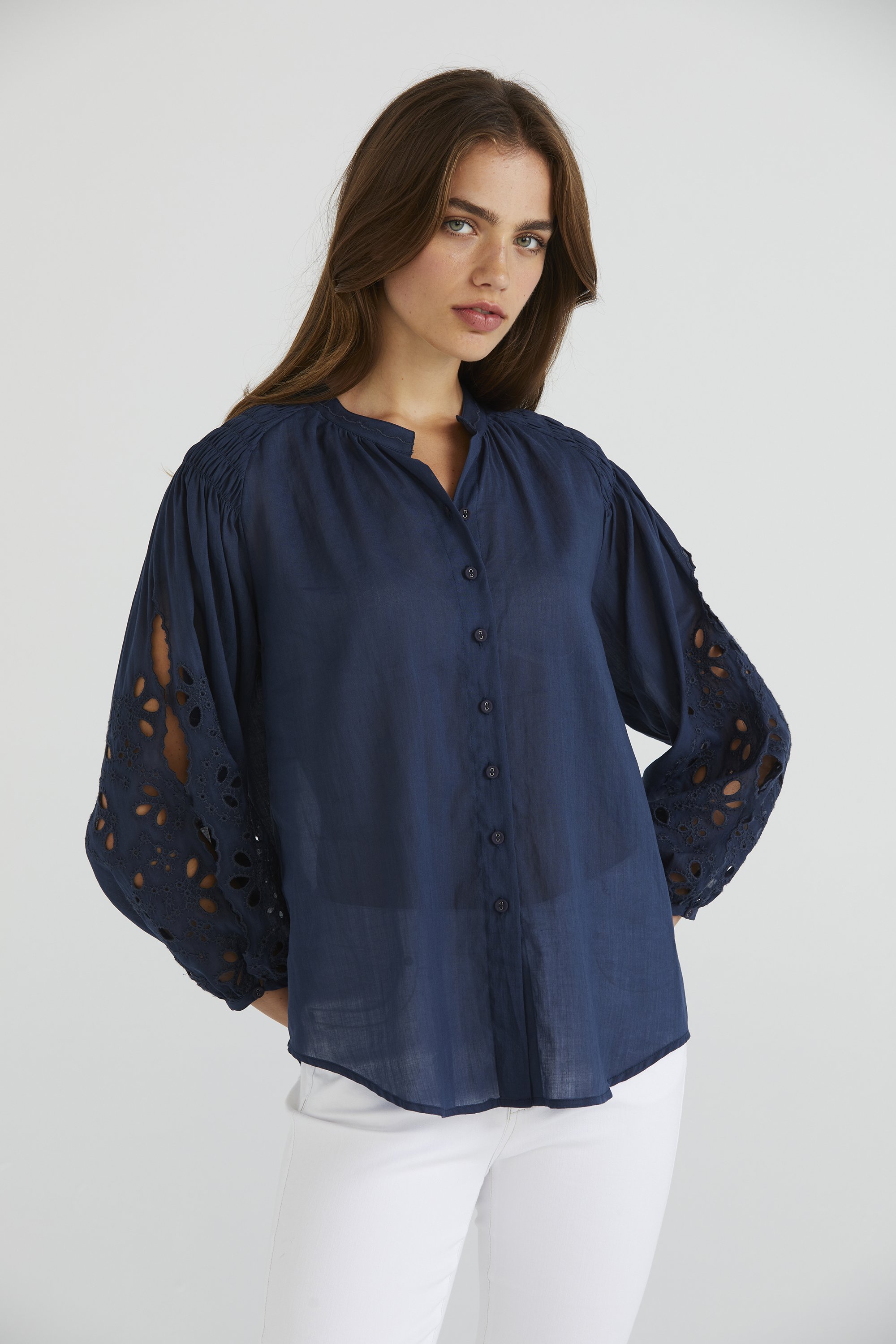 Step into timeless elegance with the Claudia Shirt, a stunning button-through shirt designed to captivate. Made from a premium ramie cotton blend, its shirred overarm detail adds a touch of texture, while the cut-out embroidery design sleeves offer intricate detailing. This shirt is perfect for making a style statement with ease.