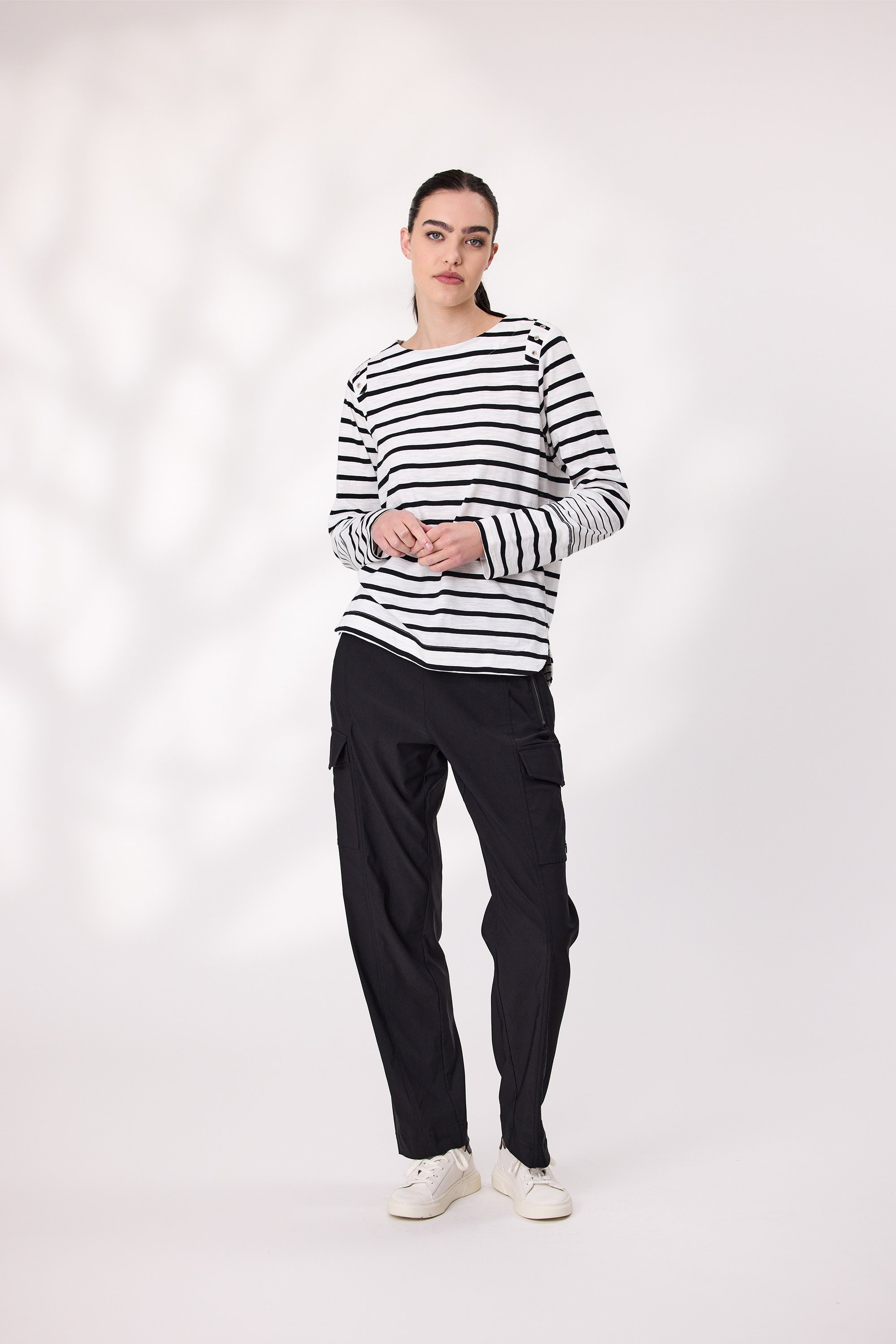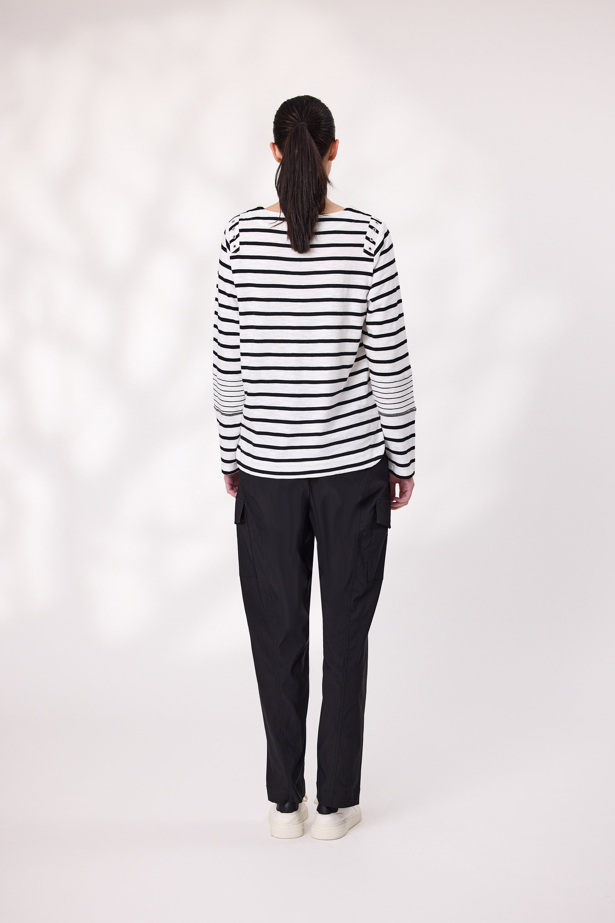 A fresh twist on a classic stripe—this cotton long sleeve top features bold black and white horizontal stripes and delicate eyelet detailing at the shoulders for a subtle touch of texture. Made from soft, breathable cotton, it is perfect for everyday wear with a little extra flair.