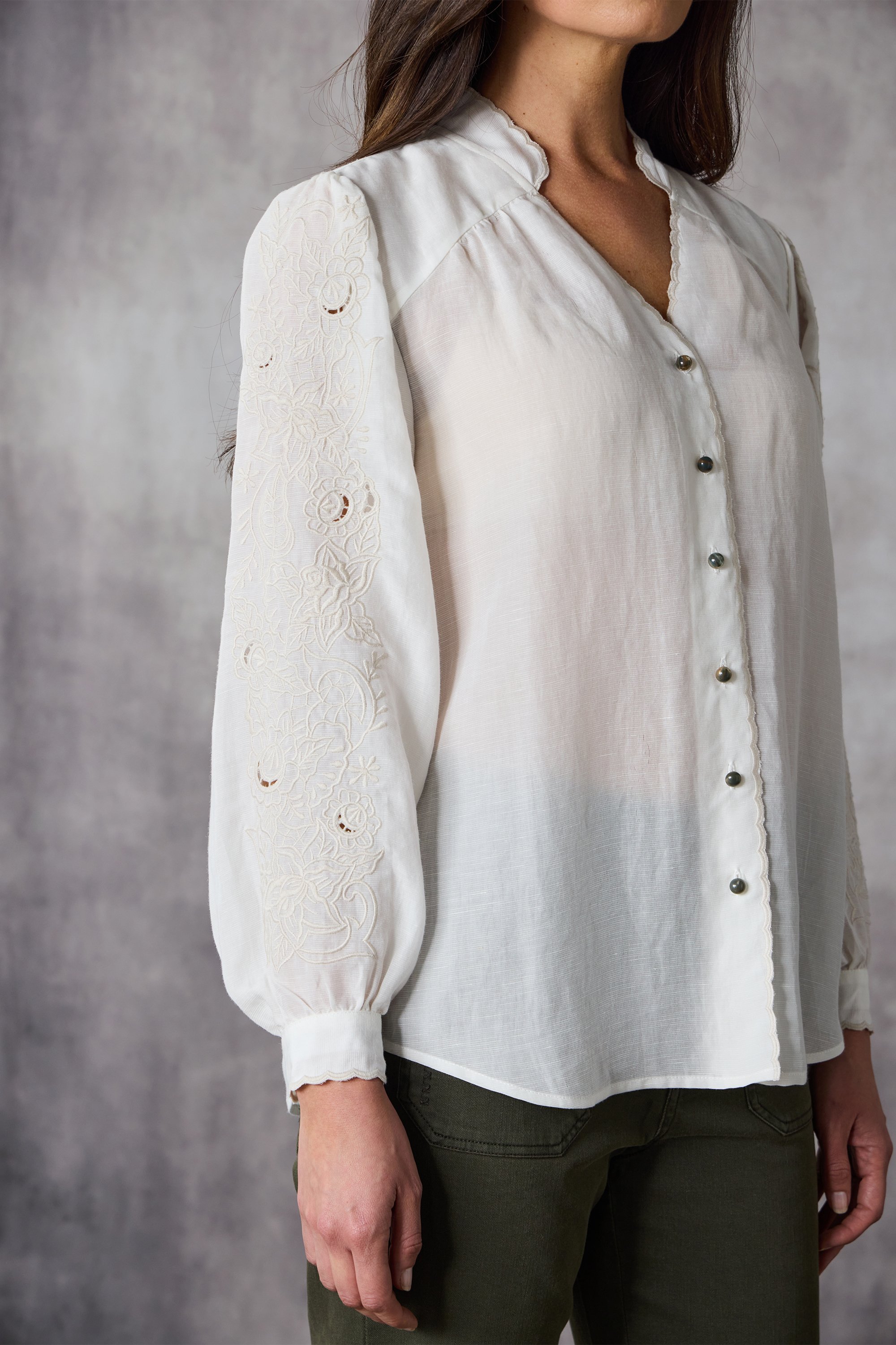 The Dash Shirt is a must-have for Winter and can be worn for both work and leisure. Its design celebrates femininity, with exquisite ornate embroidery on the sleeves, a central front placket adorned with charming dome-heading glass buttons and a delicate collar stand.