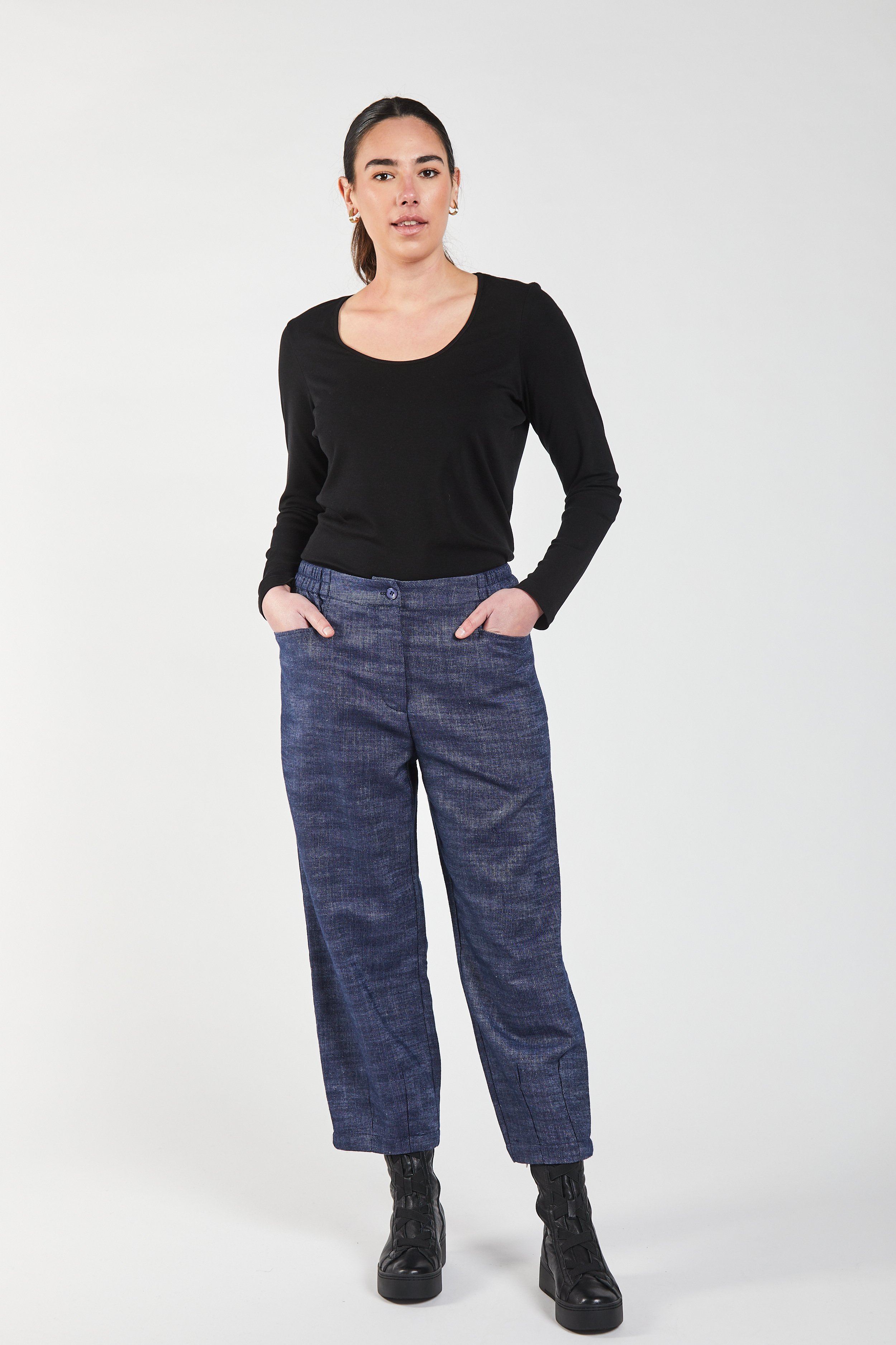 The Denim Devon Pant is a contemporary, easy-fitting style designed for versatility and comfort. Crafted from textured denim with rich tones, it strikes a refined balance between structure and ease. Soft subtle weave variation that adds depth and surface interest, giving the pant a more elevated, artisanal feel than traditional denim. The silhouette is relaxed through the leg with gentle cleverly placed darts that taper toward the hem, creating a flattering line that elongates the body while maintaining an effortless shape. The front features a clean, flat waistband with a single button and concealed zip fastening, ensuring a smooth and minimal appearance. Side pockets, offering practicality are neatly integrated into the seams. Soft concealed elastic allows for comfort and flexibility through the back, making the pant easy to wear throughout the day. The cut is thoughtfully designed with ease through the thigh, allowing natural movement and a relaxed, contemporary shape. Subtle stitching details and carefully placed panel lines give the pant a polished finish, while the denim’s soft hand feel and fluid drape lend a modern appeal.