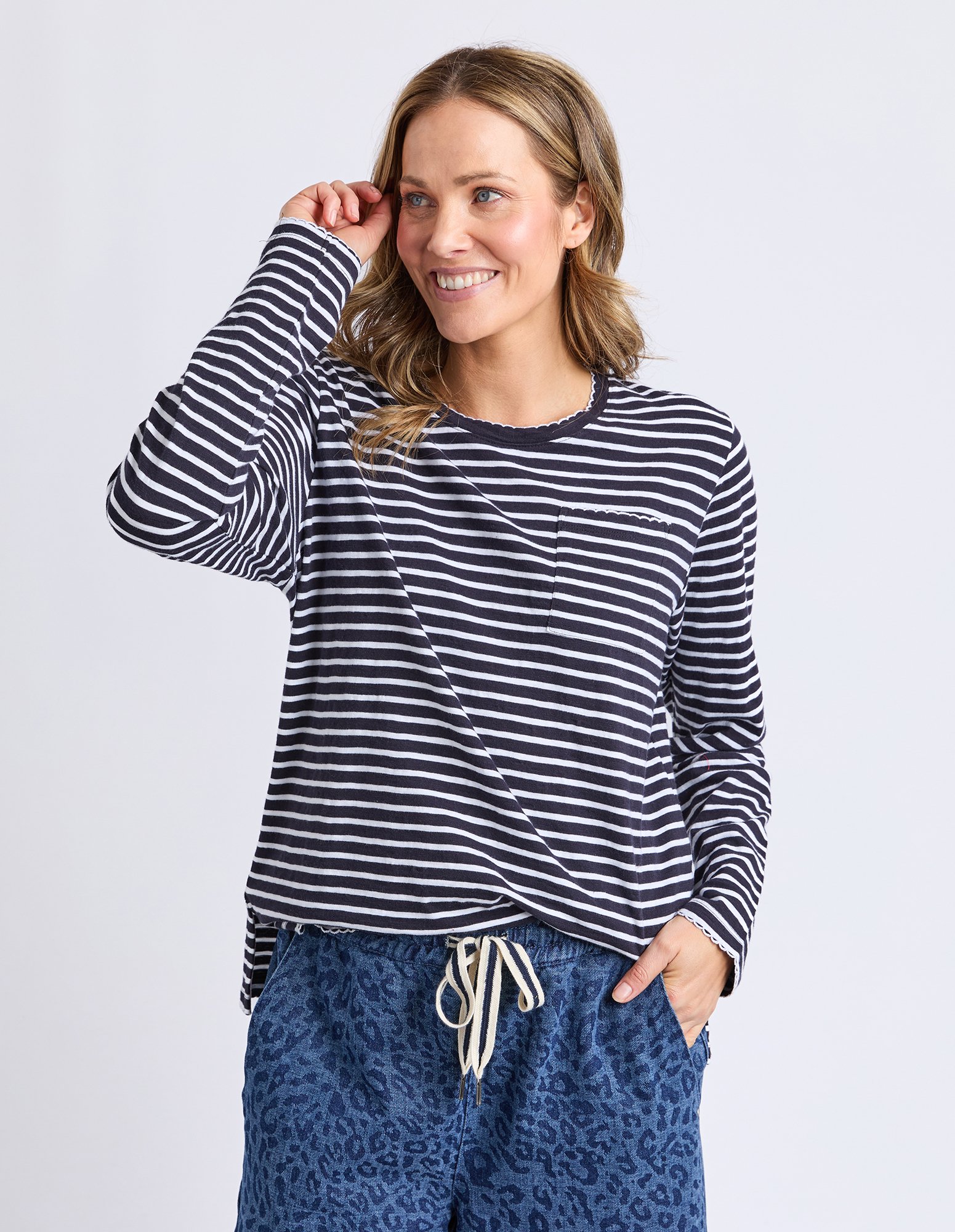 The ELM Drea Long Sleeve Tee elevates your everyday wardrobe with understated sophistication. Crafted from breathable cotton perfect for year-round wear, this piece combines feminine elegance with a sporty silhouette with distinctive scallop edge stitching adorning the crew neck, patch pocket, hem, and cuff edges—subtle details that set it apart from standard basics. It's the everyday tee that doesn't feel ordinary, offering style without compromise.