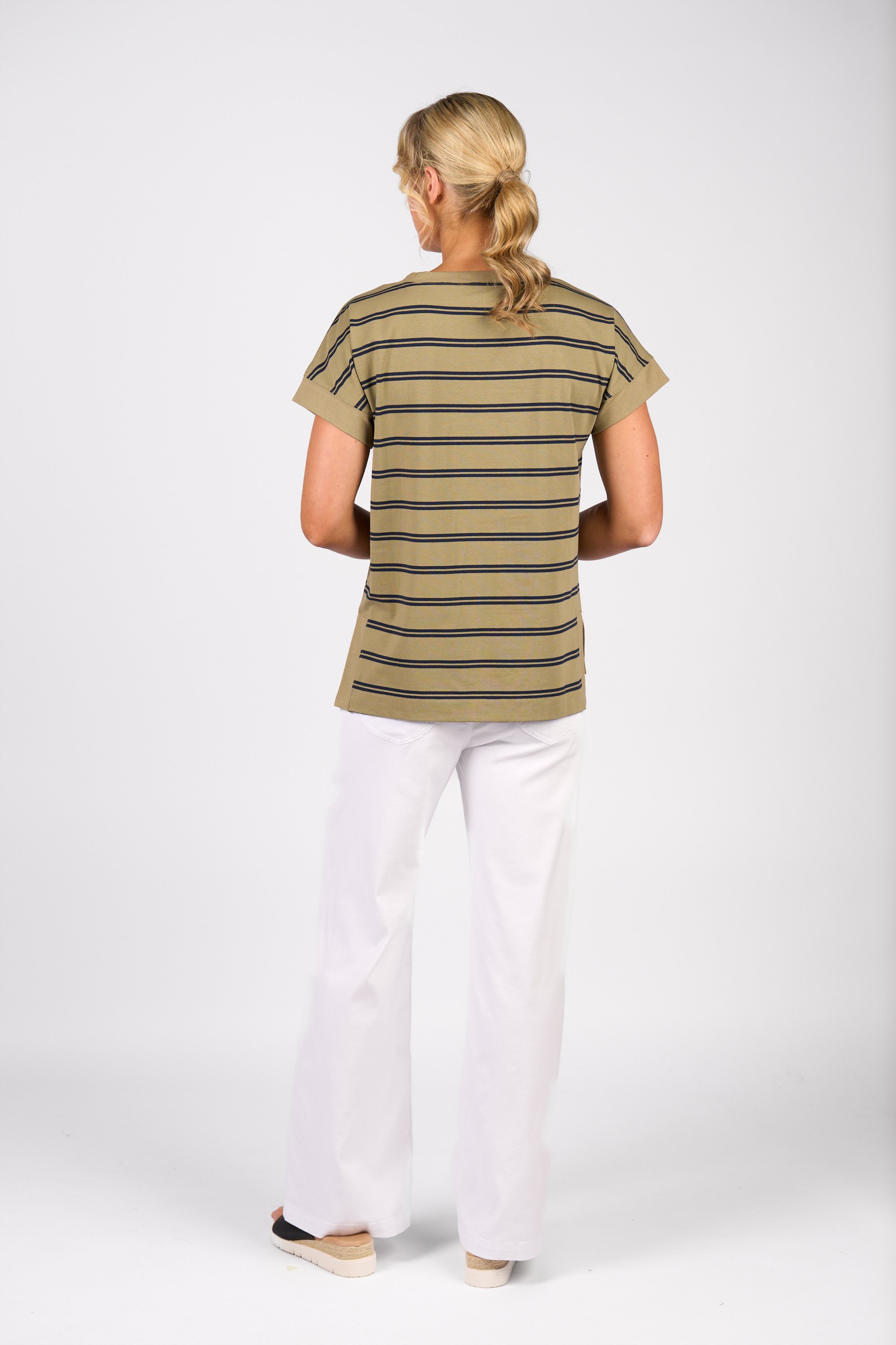This boat-neck, drop-sleeve striped t-shirt is made from soft stretch cotton-elastane jersey fabric for all-day comfort. It features small side splits and a stepped hem.