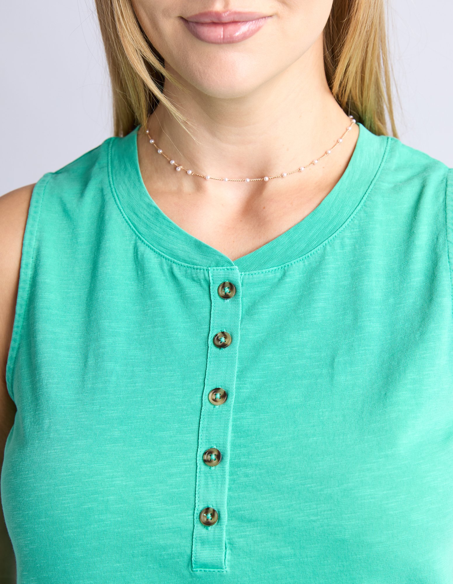 A great sleeveless tank featuring a front button placket, canvas tape detail down the sides all in an easy to wear cotton jersey.
