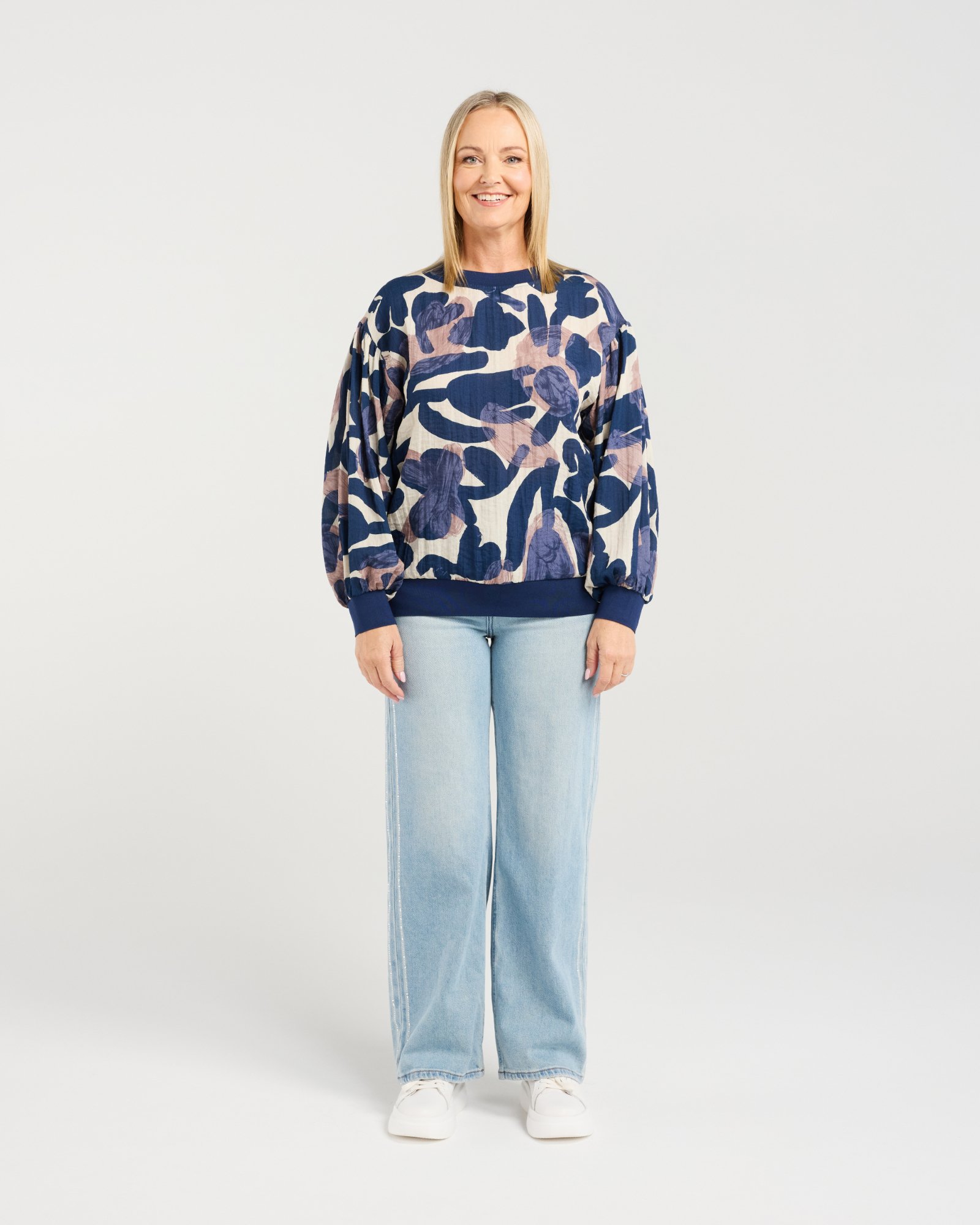 This top features long, voluminous sleeves with elasticated cuffs and a matching hem for a soft, relaxed fit. The classic round neckline completes the effortlessly chic silhouette, making it a versatile piece for winter layering.