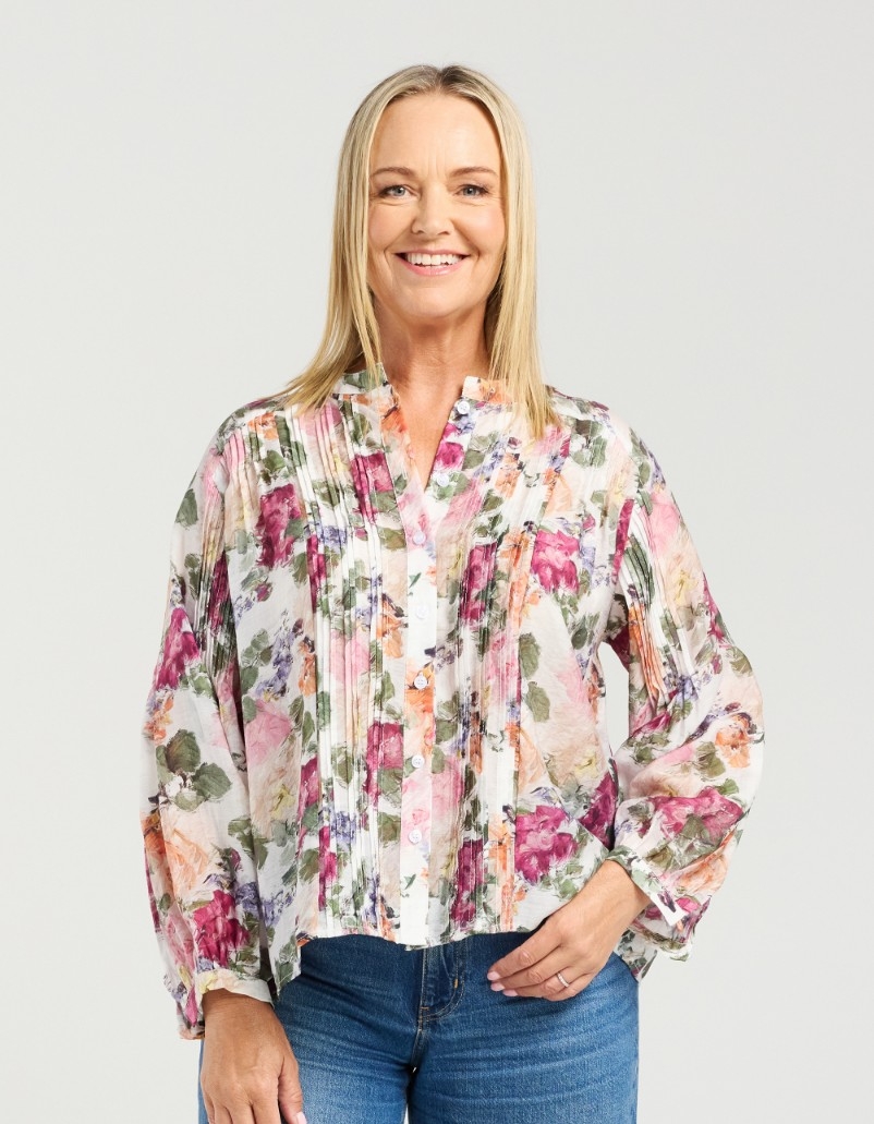 This button-down shirt features pleated details on the bodice and sleeves, complemented by delicate trim around the arm cuffs and neckline. Crafted in a soft, beautiful floral fabric, it offers a feminine and elegant take on a classic silhouette.