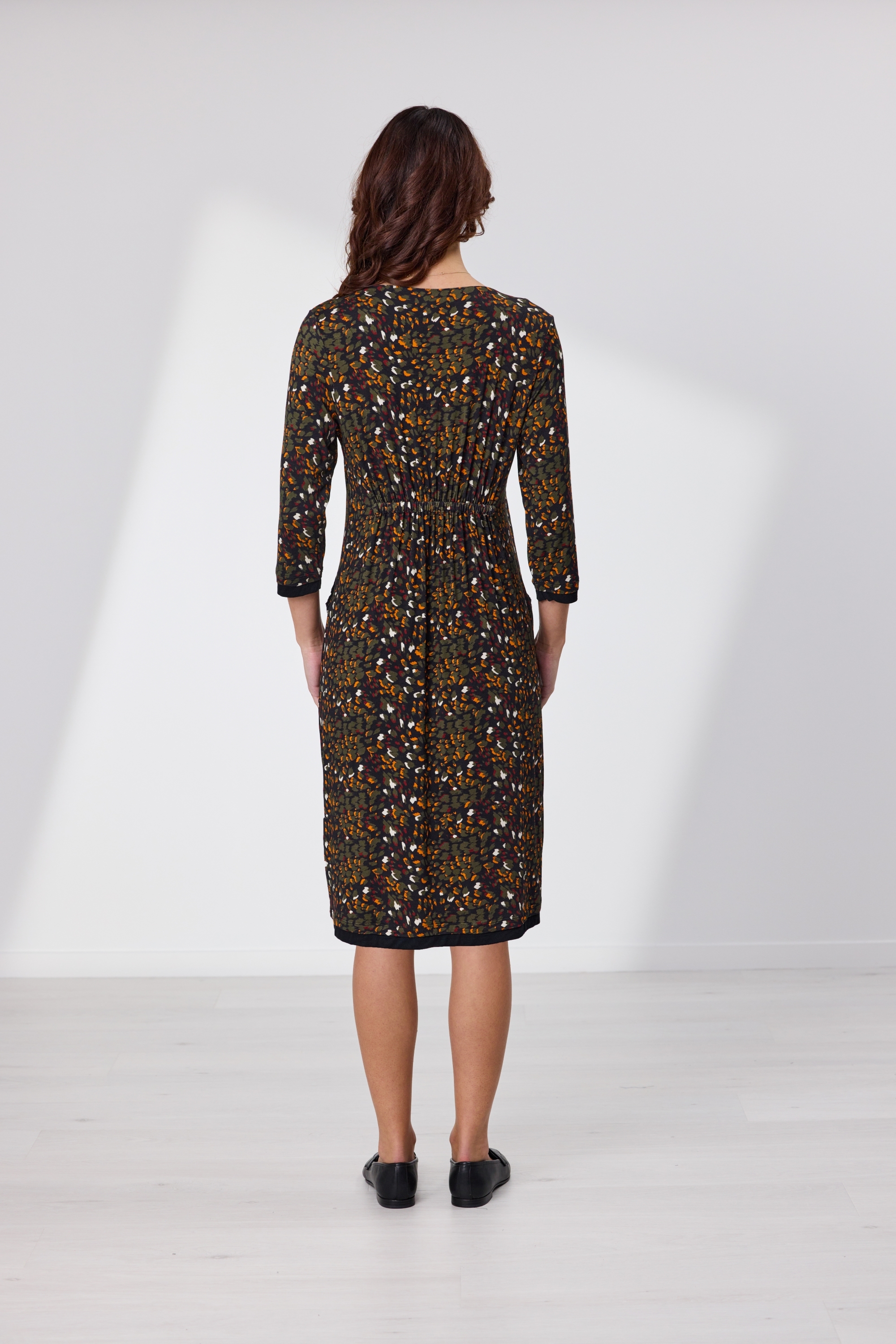 Made from a soft drapey Viscose Elastane fabric with three quarter sleeves, scoop neck & front pockets, the Finch Dress is the ultimate in style and comfort. Contrast plain panels at sleeve cuffs, body hem and pocket opening. Elasticated at back waist to give shaping for a refined silhouette.