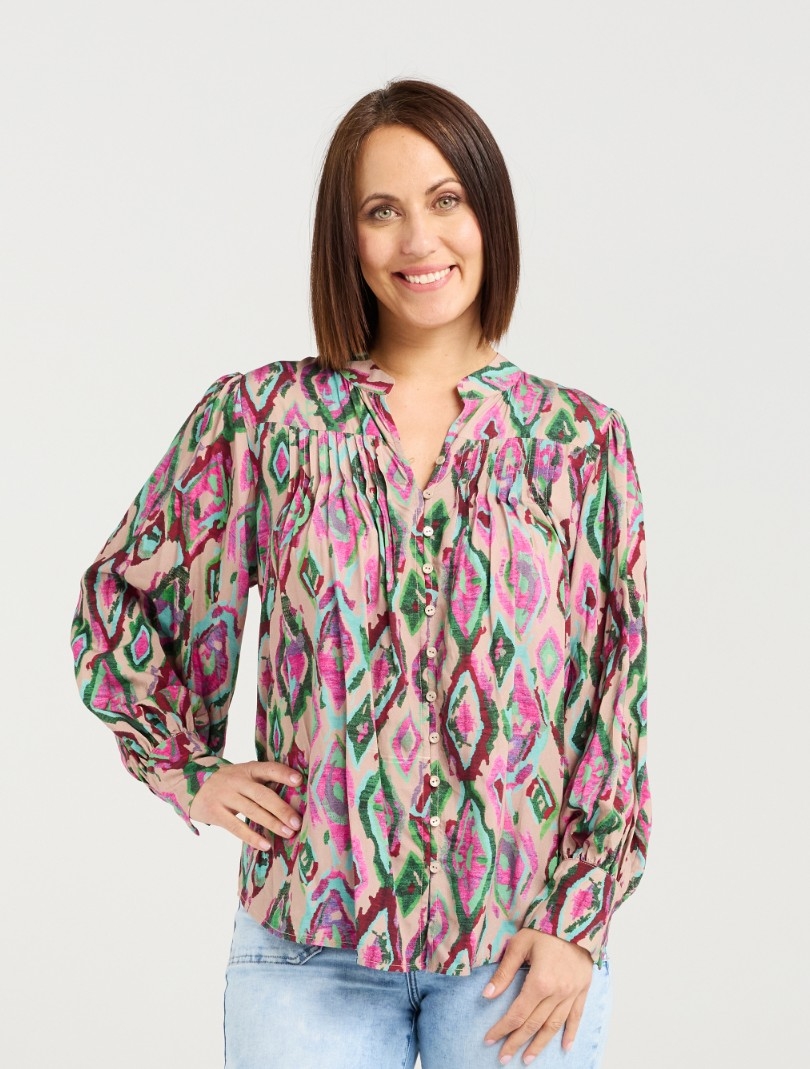 This button-down blouse features subtle pleating above the bust and classic shirt-style sleeve cuffs for a refined finish. Crafted in a vibrant, colorful print, it adds a cheerful and stylish touch to any outfit.