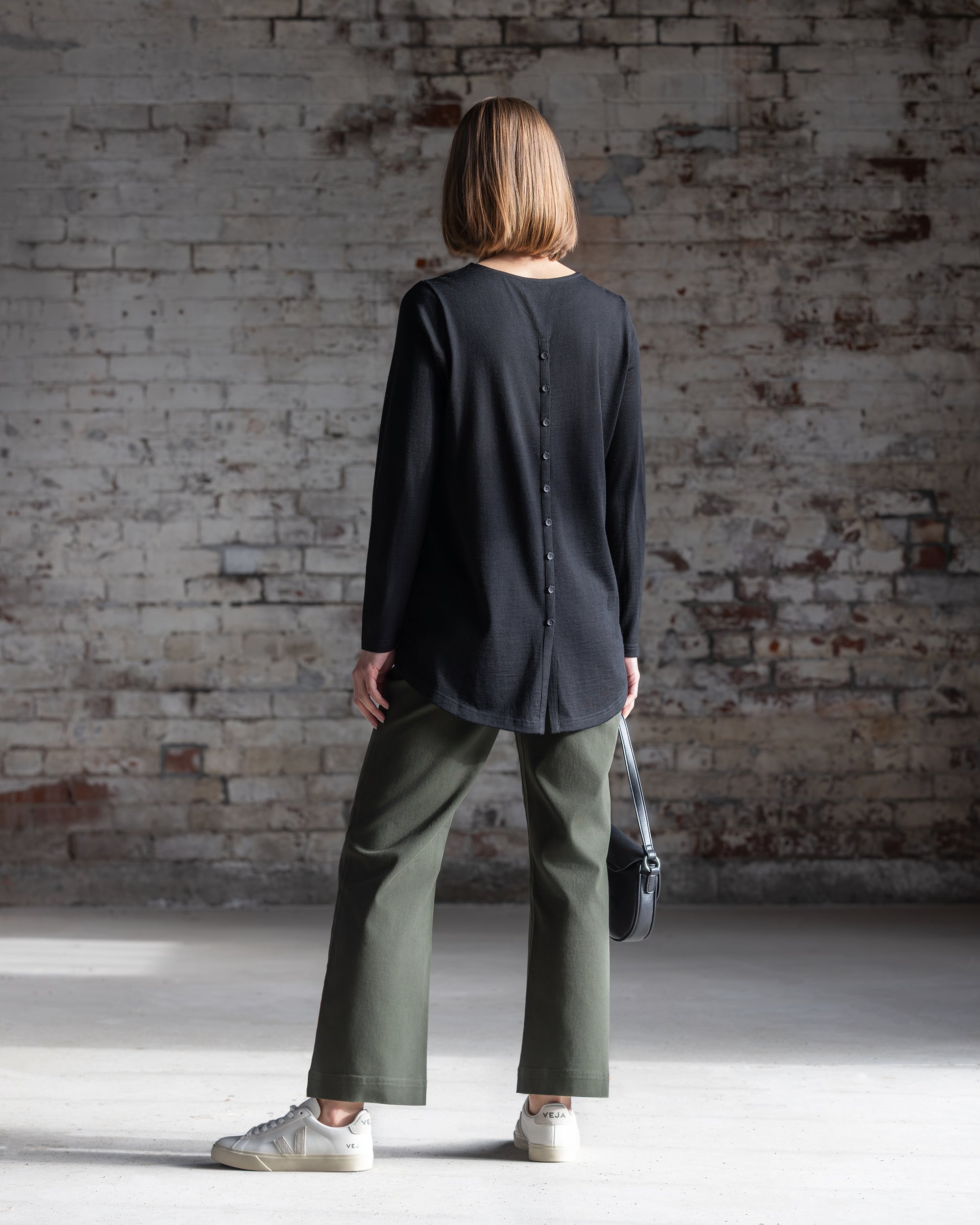 Merino long-sleeve top in black, designed with a relaxed fit and soft drape. Featuring a classic round neckline and a functional button-through detail at the centre back, this style is finished with side splits and a gently scooped hem for ease and movement.