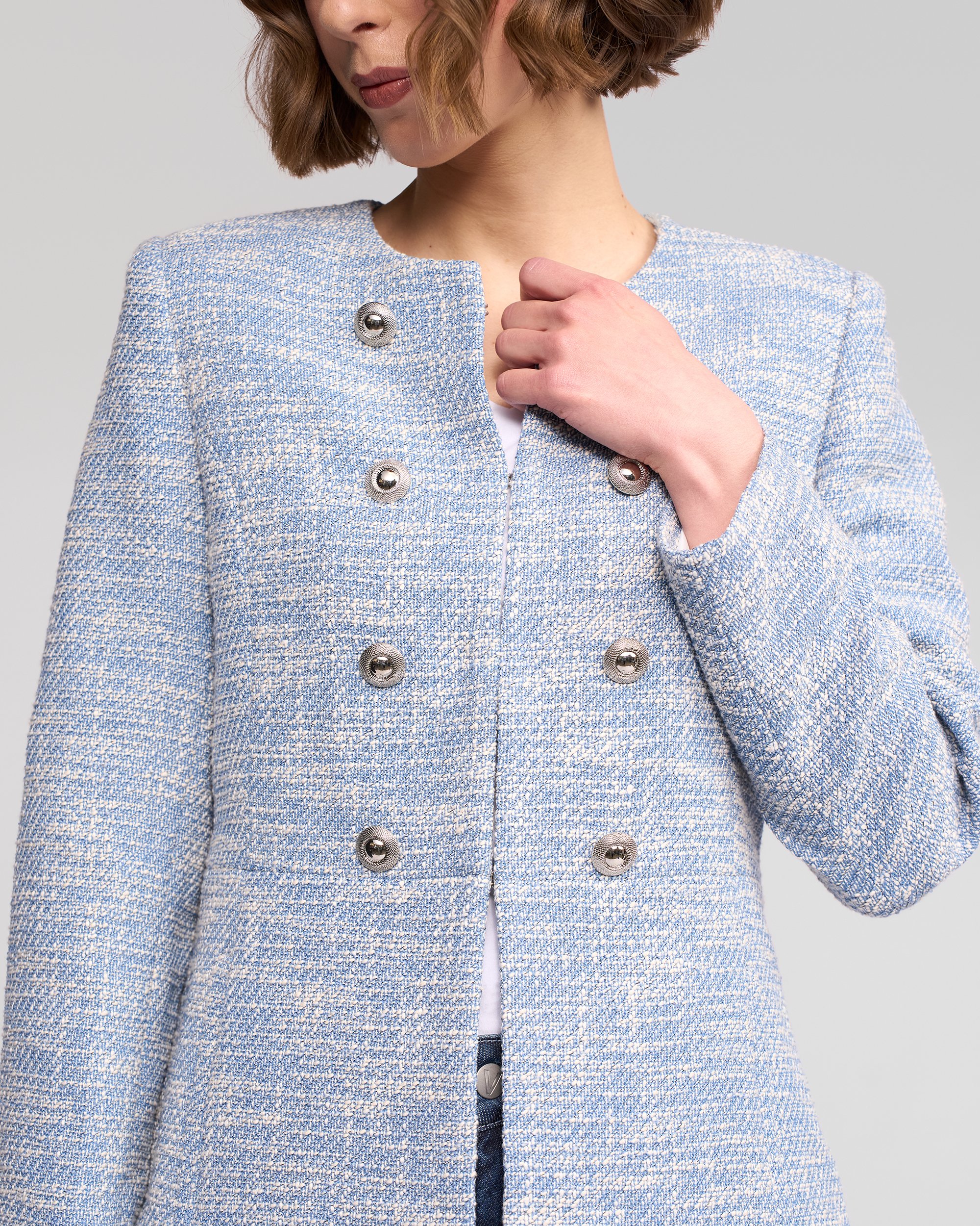 A refined collarless jacket in our Valli colourway — a light blue and white woven fabric with a touch of wool for structure and texture. Designed with a clean, formal finish, it fastens through the centre front with discreet hook-and-eye closures, creating a crisp, flat silhouette. Eight silver feature buttons sit in pairs along the front for an elegant decorative detail. Fully lined for comfort and a polished fit.