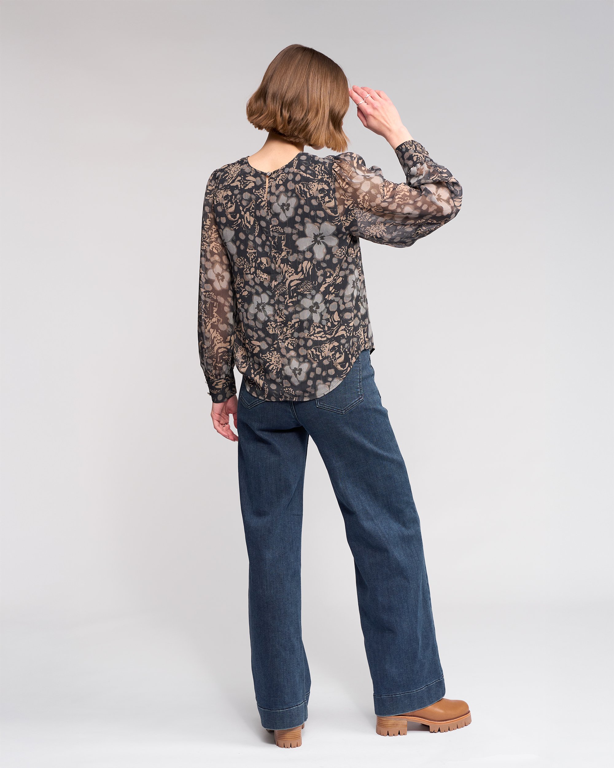 Long sleeve top in the Hazy print, a gold-green floral pattern on a black base. Featuring wide sleeves finished with barrel cuffs secured with two spherical buttons, a round neckline with back button loop closure, and a centre back seam.