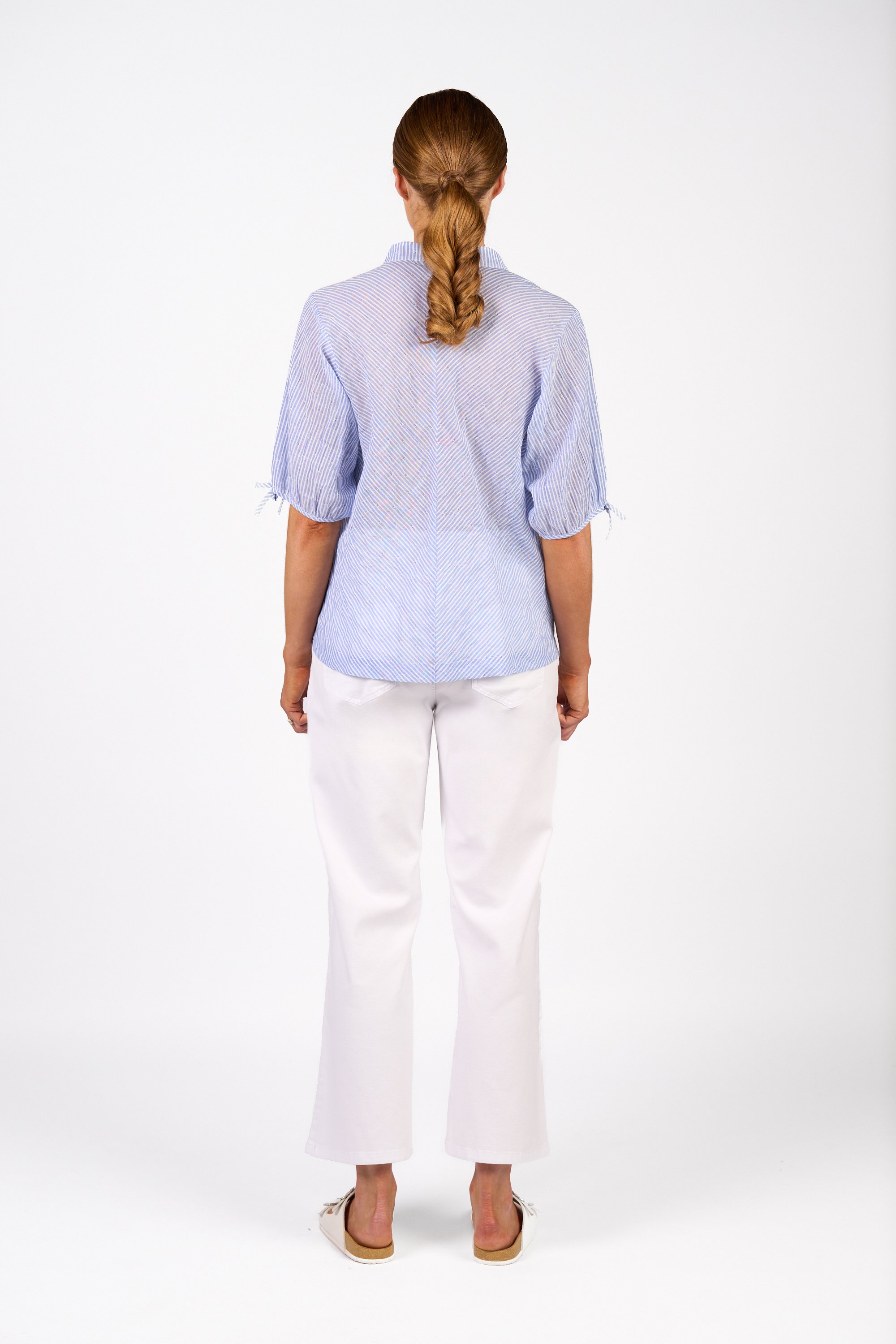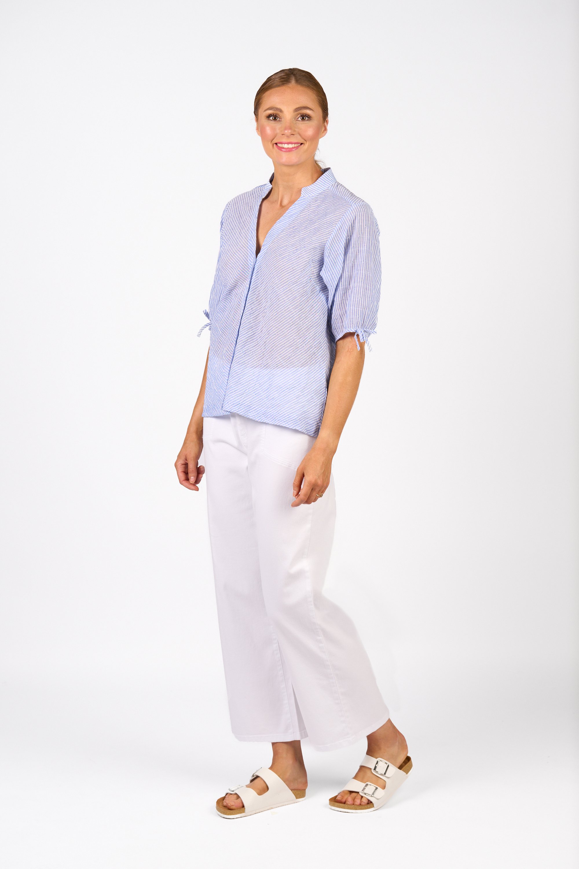 The Link Shirt is a relaxed cotton style with an easy drape and casual feel. It features a soft V-neck with a flat mandarin collar, mid-length sleeves with gathered hems and ties, and subtle side splits for added movement. A go-to option for understated, everyday dressing.