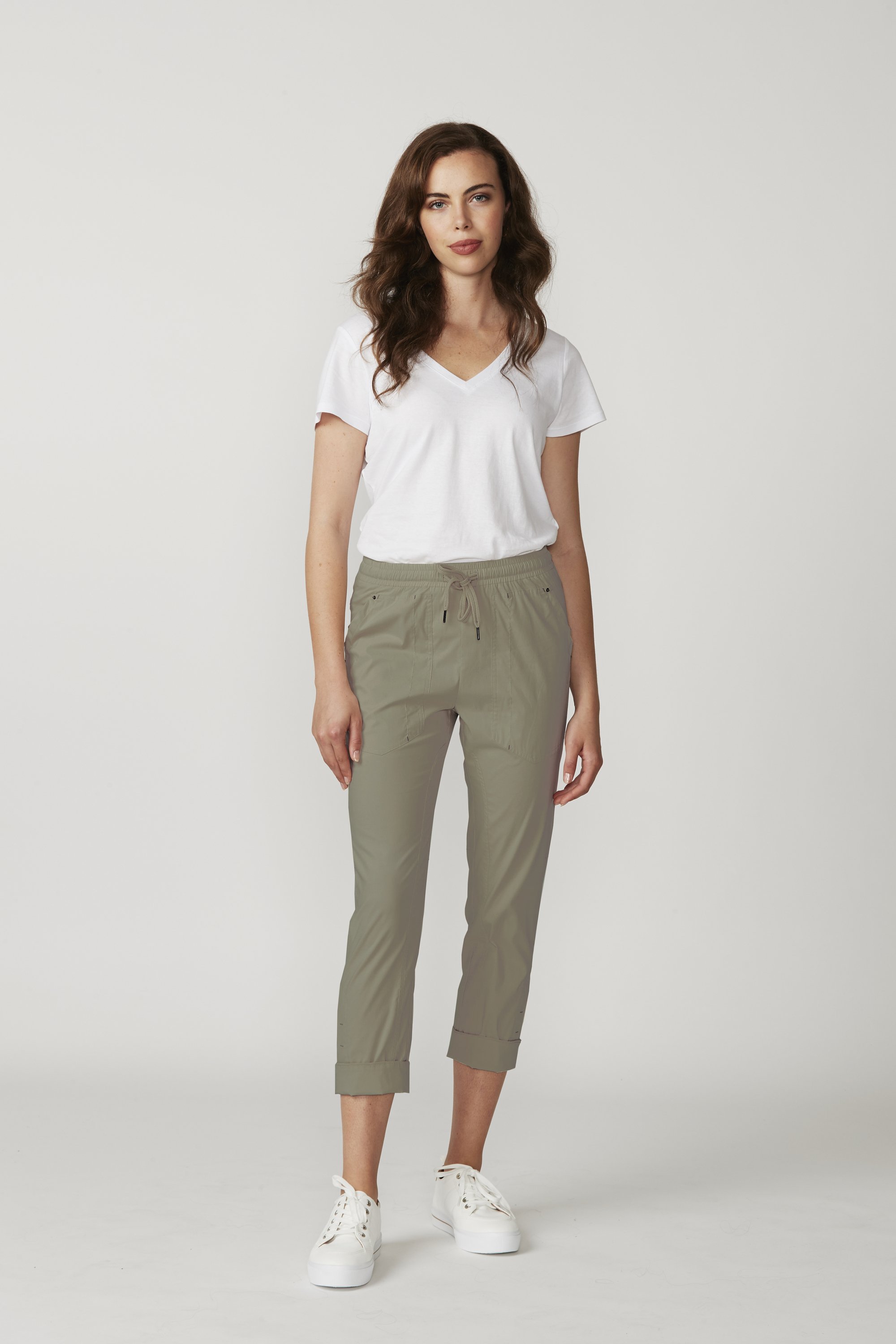 The LTL port 7/8 pant - features elasticated waist with adjustable drawcord,  front pocket with antique nickel hardware & relaxed leg with optional turn up cuff. Perfect lightweight cotton rich stretch pant for everyday.