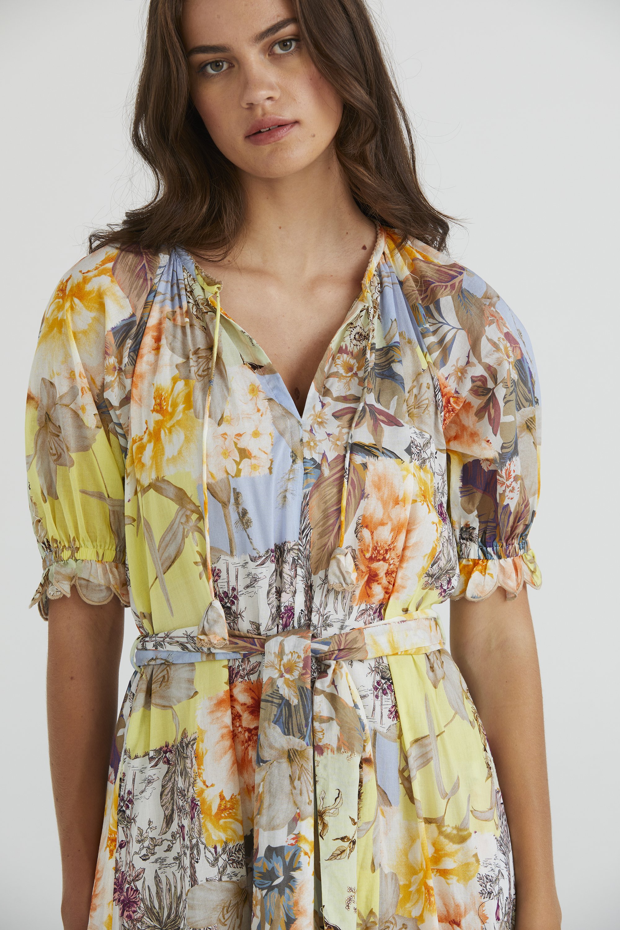 Experience the enchanting allure of the Monarch Dress, a lightweight cotton dress adorned with the captivating Monarch patchwork print. Delicate scallop embroidery in light tan at the sleeve cuff and looped cotton embroidery at the neckline add an artisanal touch, and crochet trimmed tulip tassel edges provide a playful finish. Elasticated at the back waist for a comfortable fit, this dress includes a removable fabric belt for effortless styling options.