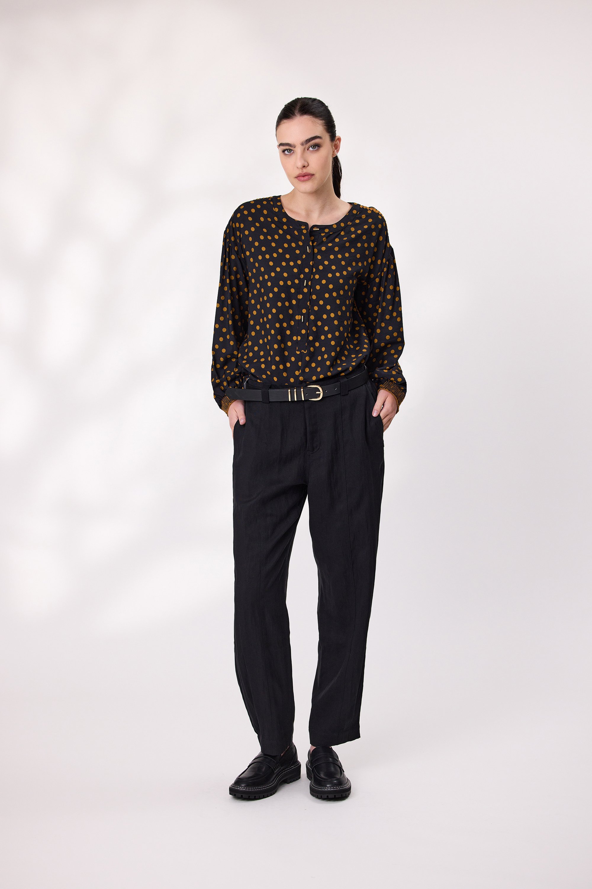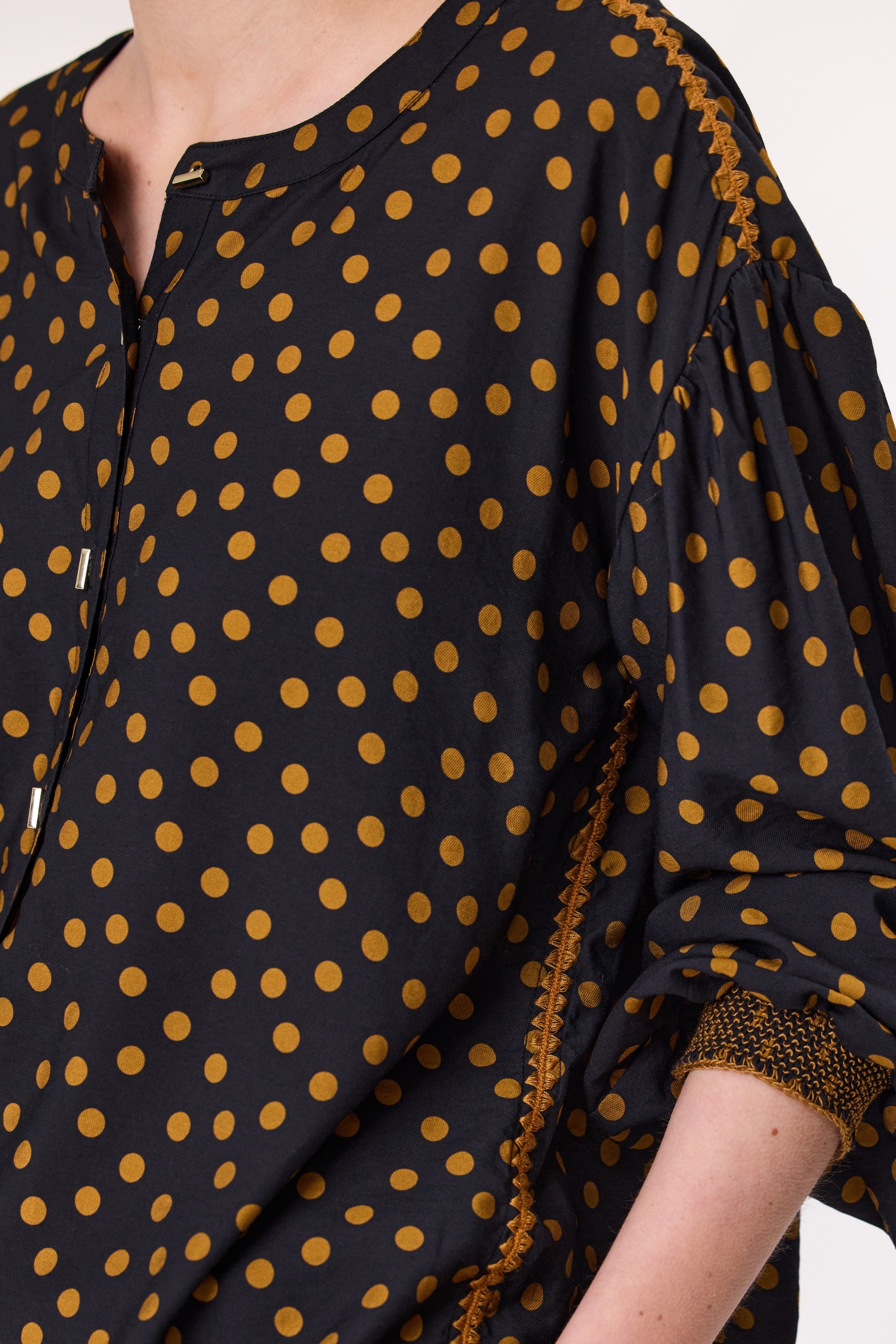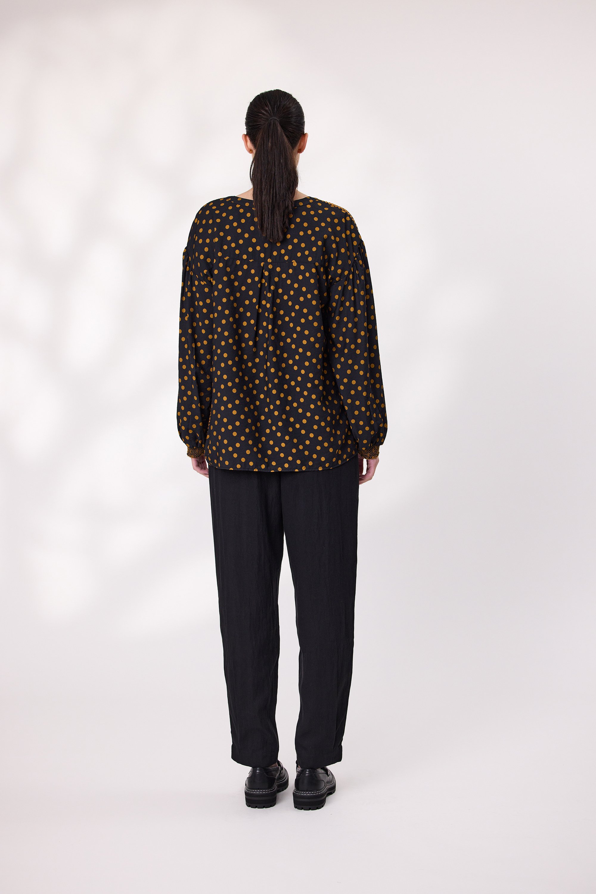 Add a playful yet refined touch to your wardrobe with this printed dot top. Crafted with a black base and vibrant gold dot print, this long sleeve top features decorative stitching at side seam and shoulder for added texture and charm. The front opening is adorned with elegant buttons and shirring at sleeves cuffs. Perfect for both casual and dressy occasions.
