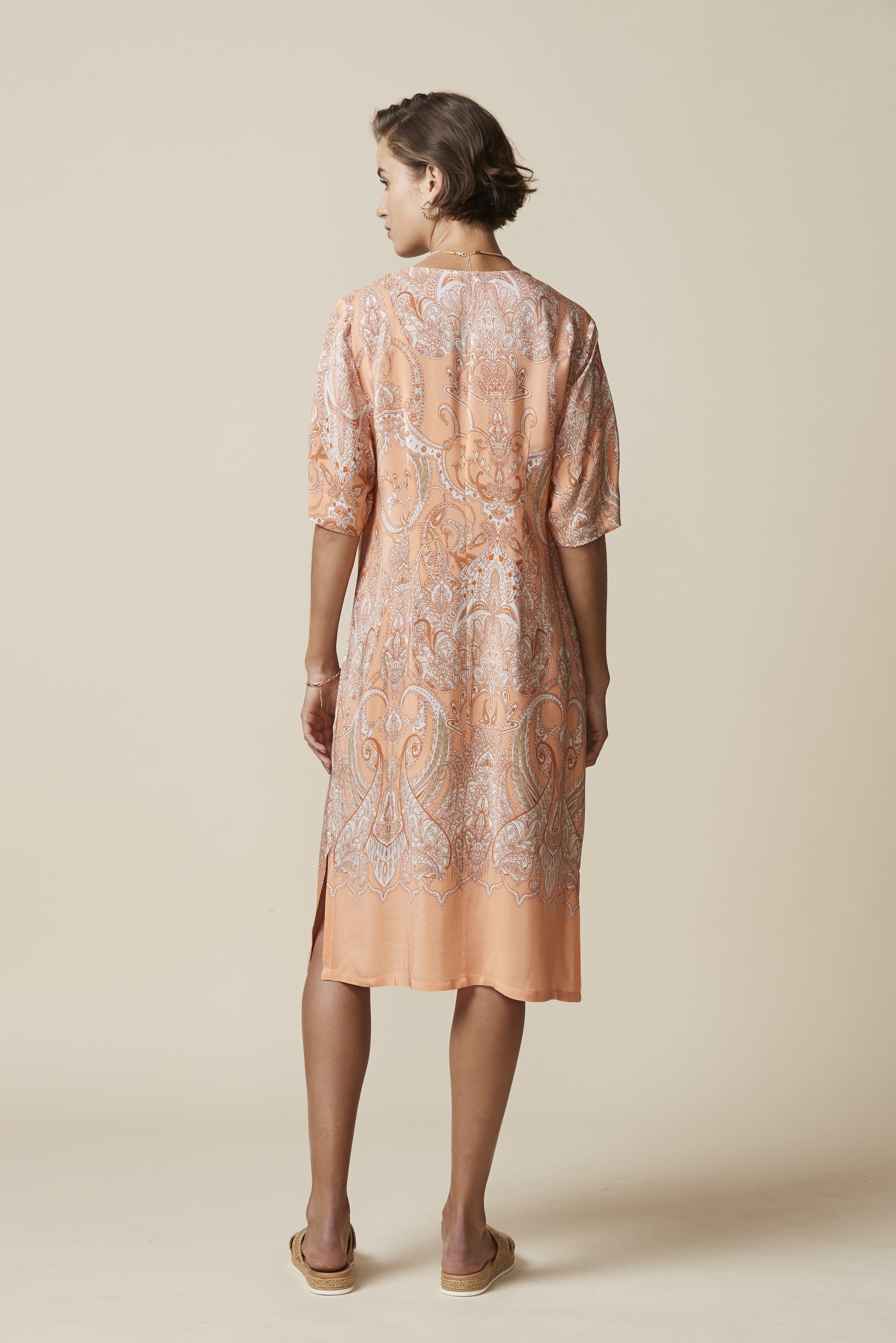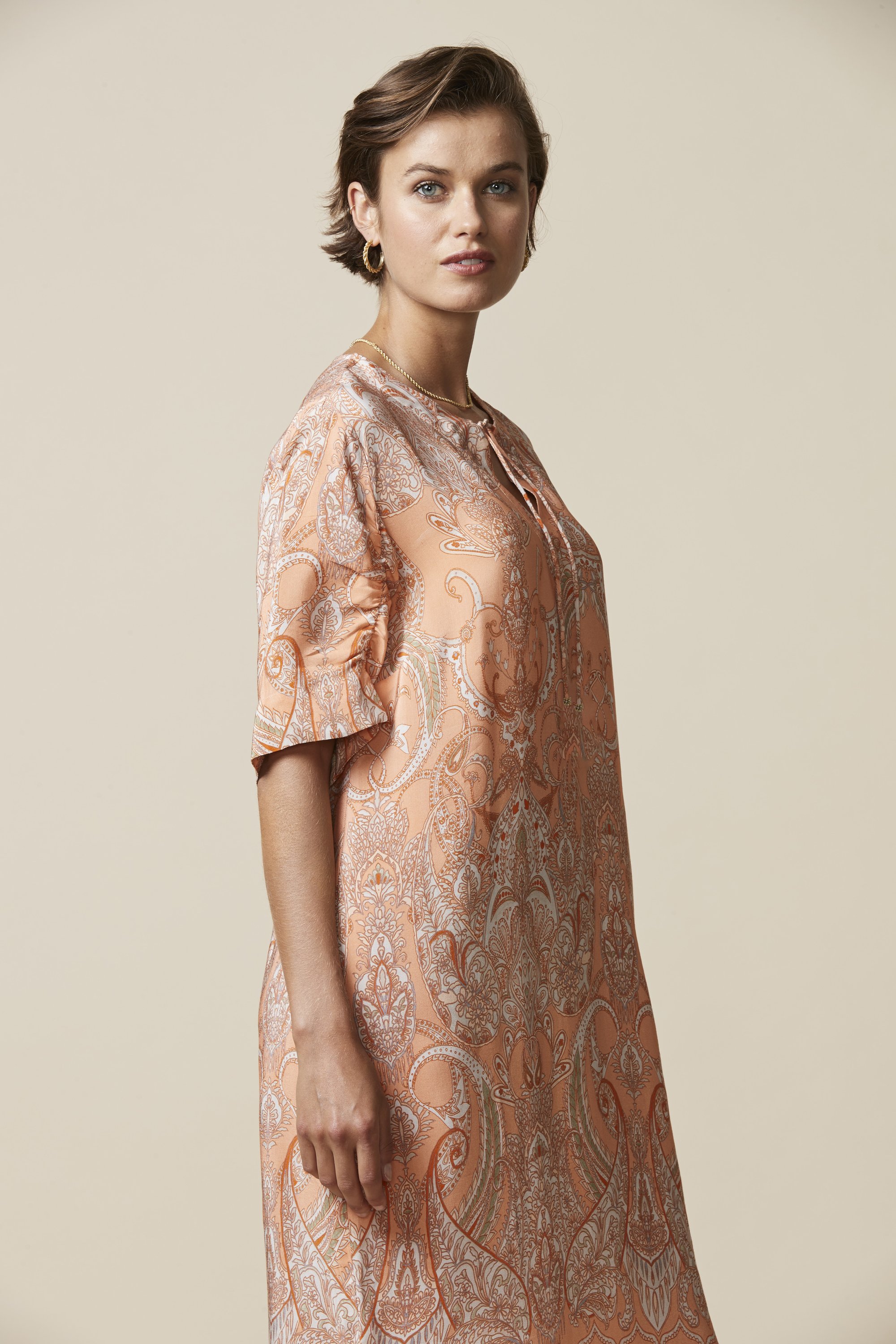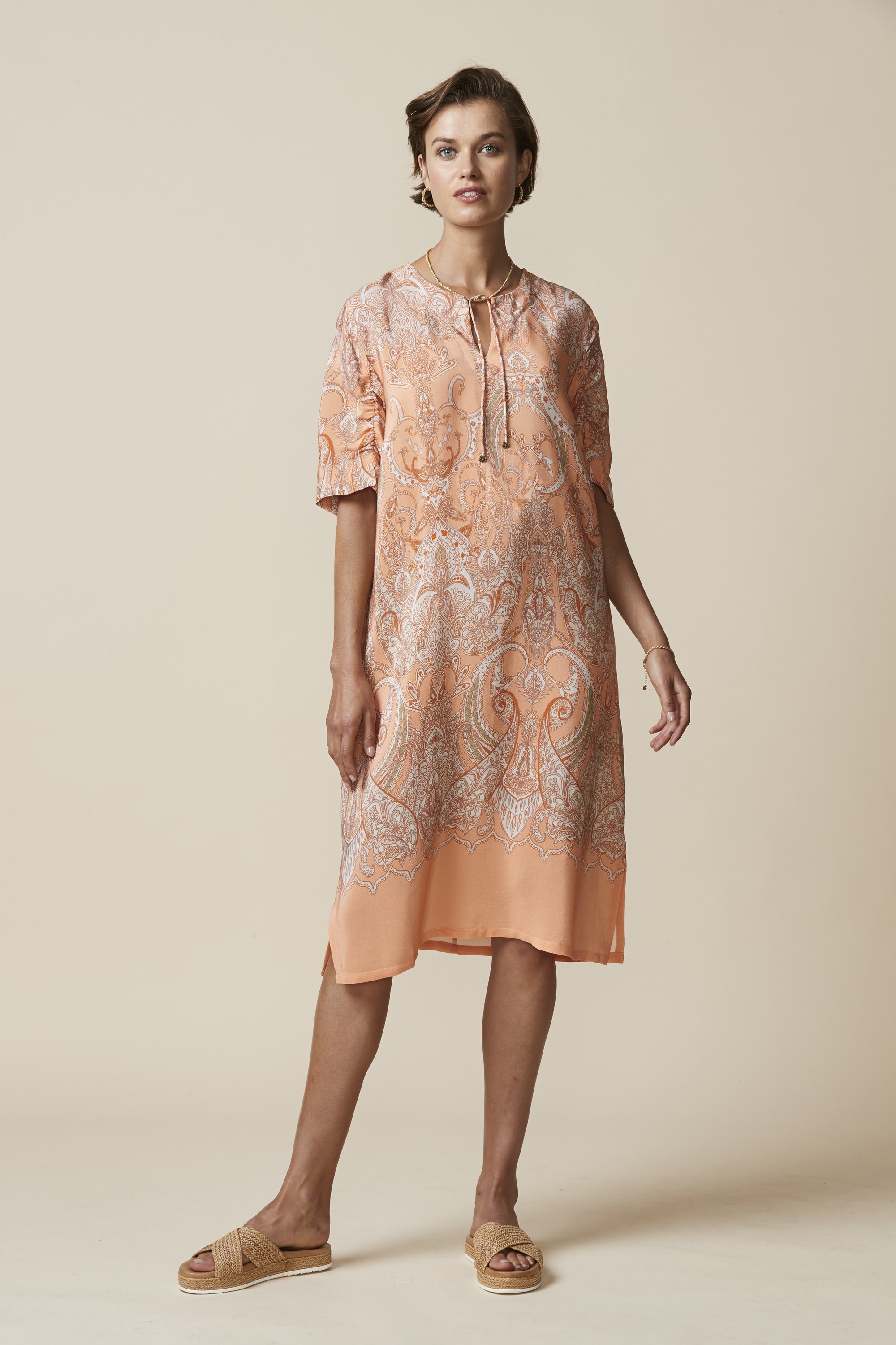 Soft paisley printed knee length shift dress with border at hem. Featuring ruching detail at underarm, keyhole opening at front neck and beaded tie ends.