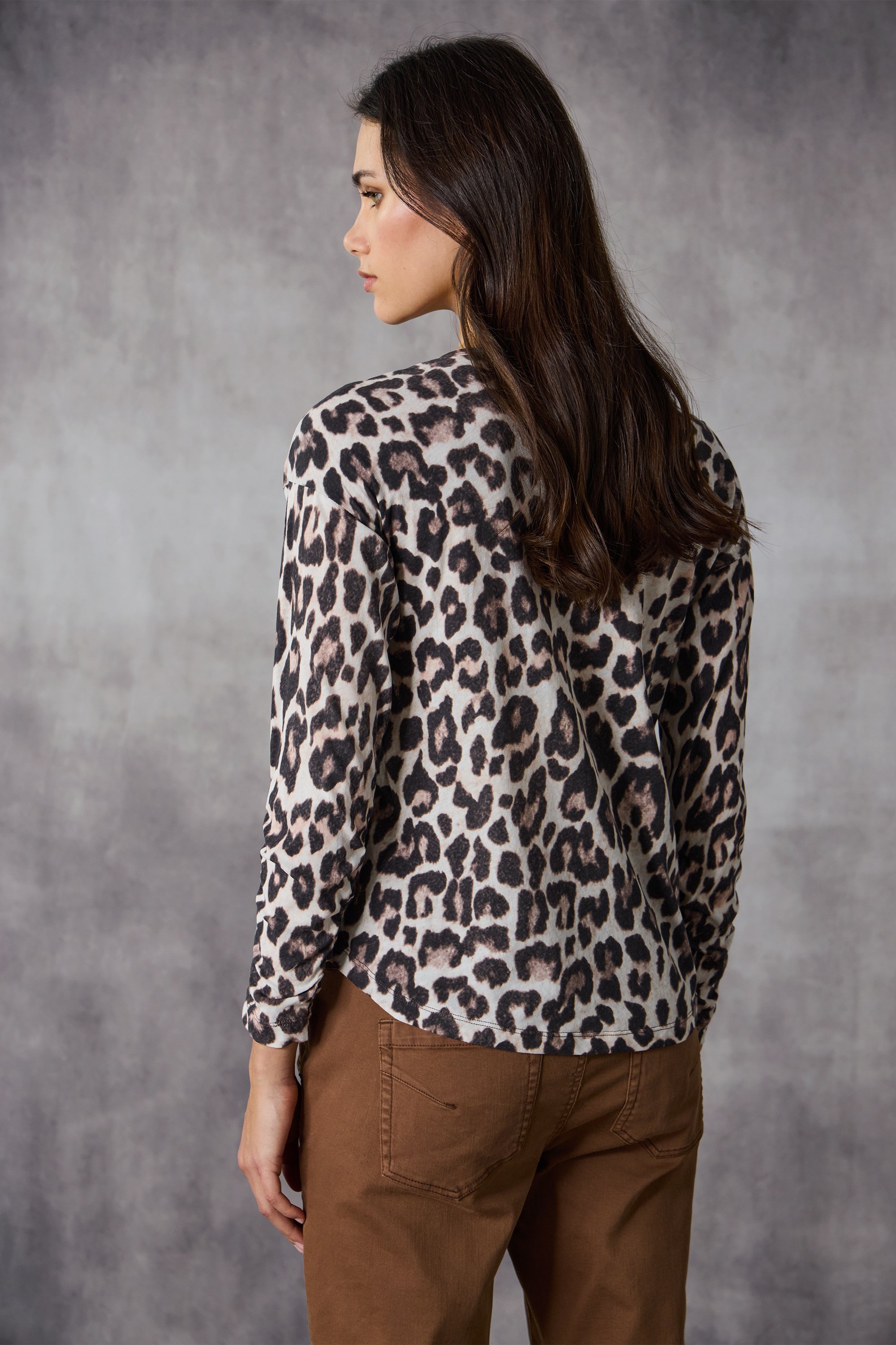 The Panther Top offers a relaxed fit in a soft cotton jersey, showcasing an eye-catching animal print in brown shades. With its round neckline and ruched cuffs, this sleeve top is perfect for laid-back days.